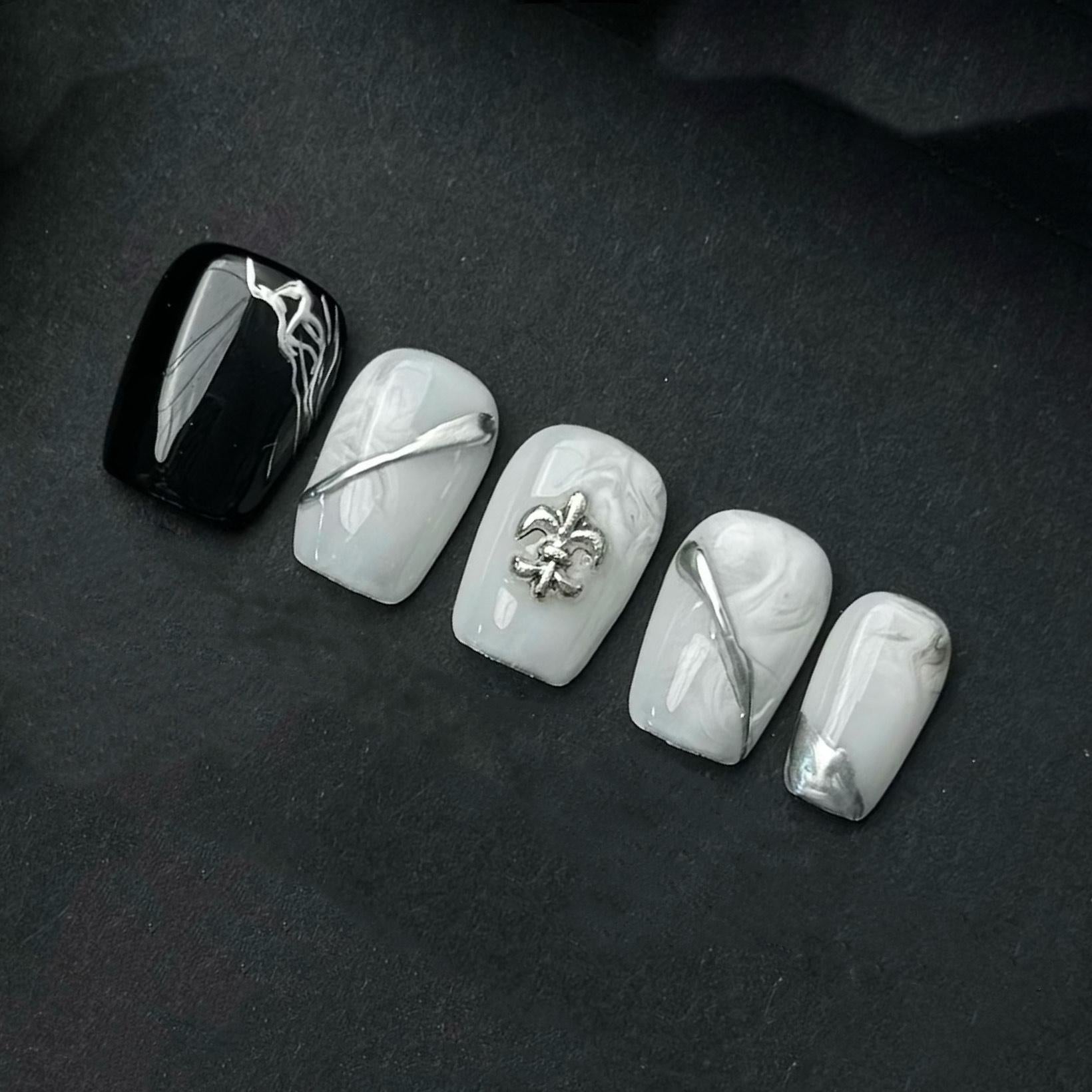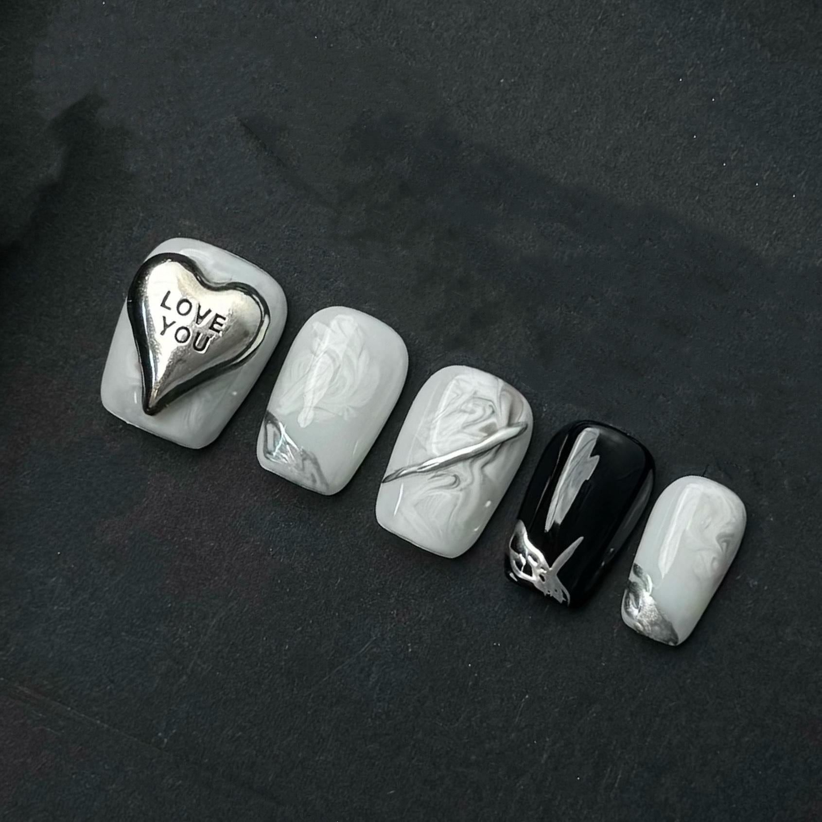 Monochrome Marble Press On Nails with Silver Charms LOVE Heart and Metallic Accents. Artificial fake glue on faux manicure nails trendy art.