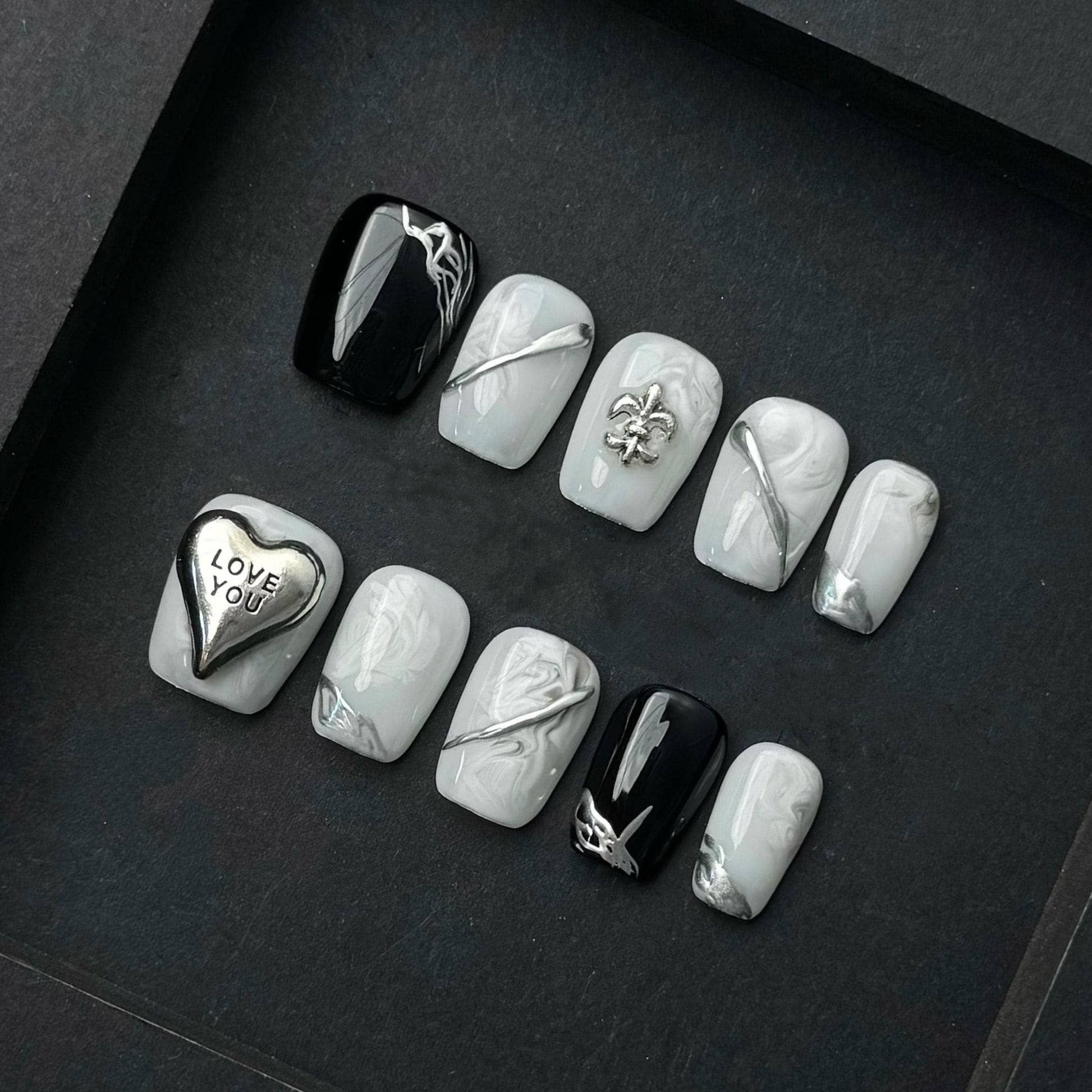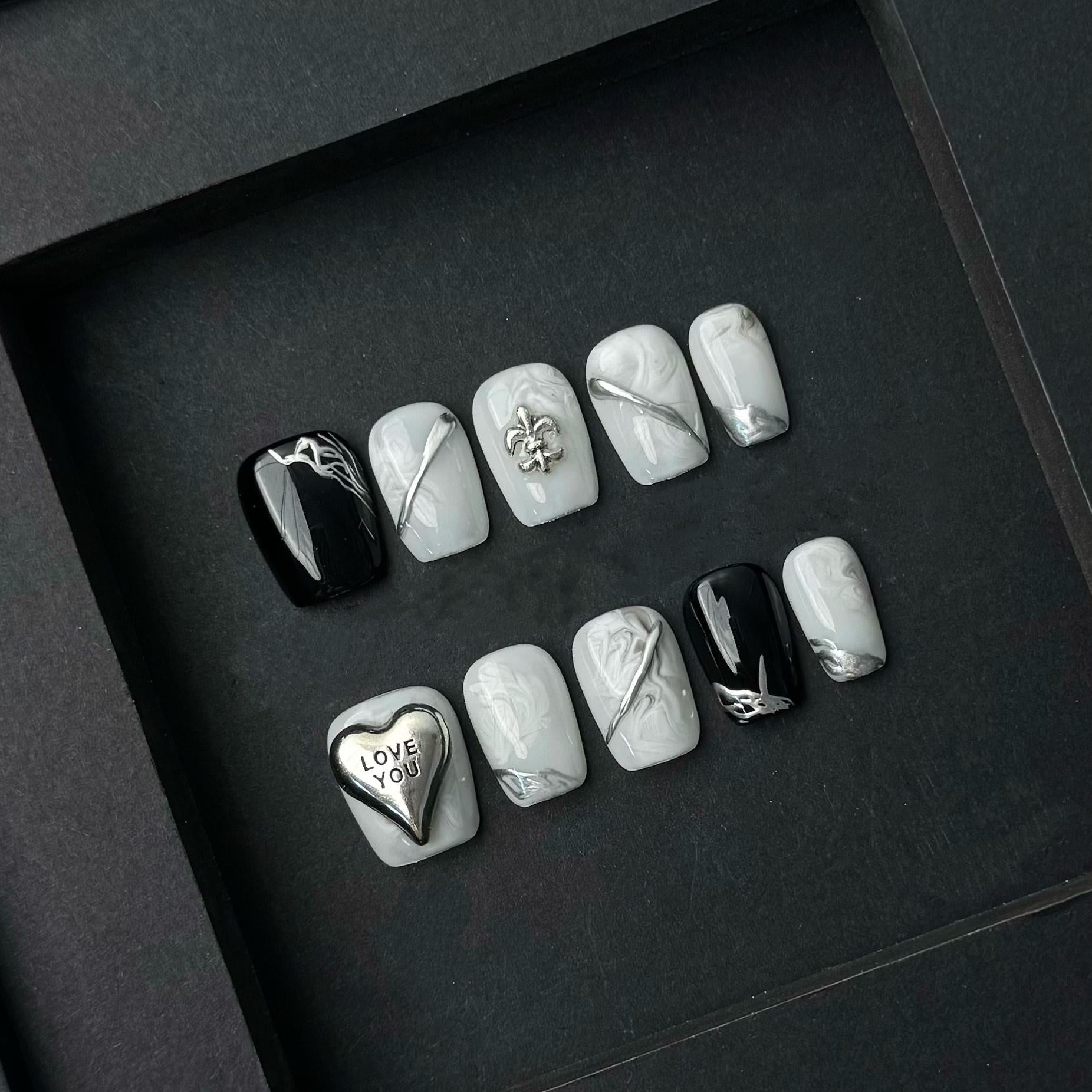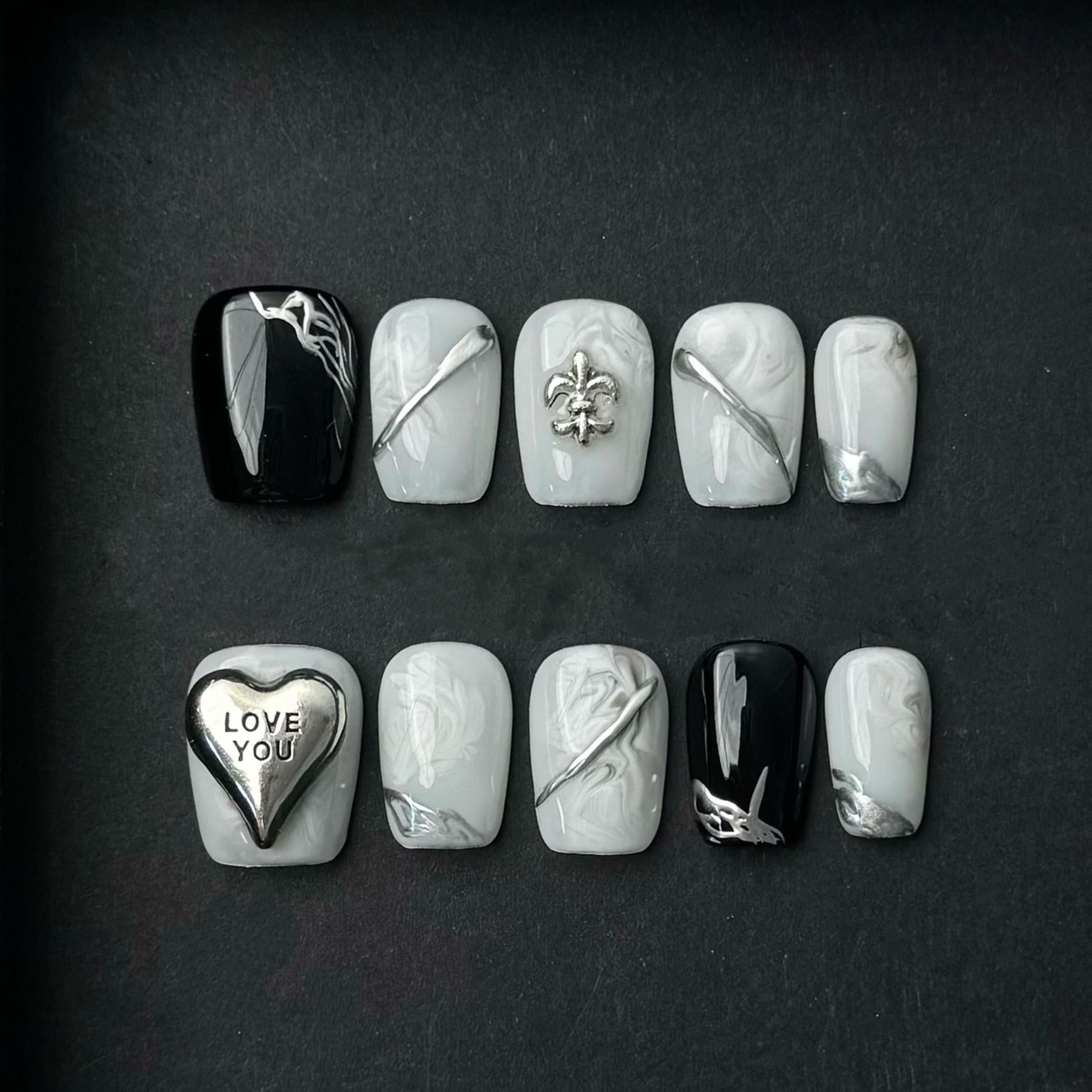 This bold monochrome press on nail set features a sleek combination of white marbled patterns, jet-black contrast, and polished silver detailing. The standout element is the raised metallic heart charm with the phrase “LOVE YOU,” accompanied by abstract chrome lines and fleur-de-lis embellishments that add depth and texture. Perfect for those who love artistic, statement-making designs, this short square-shaped set merges minimal color with maximal impact. Ideal for gothic-chic styling, romantic edgy looks, or fashion-forward occasions. Handcrafted for precision and durability.