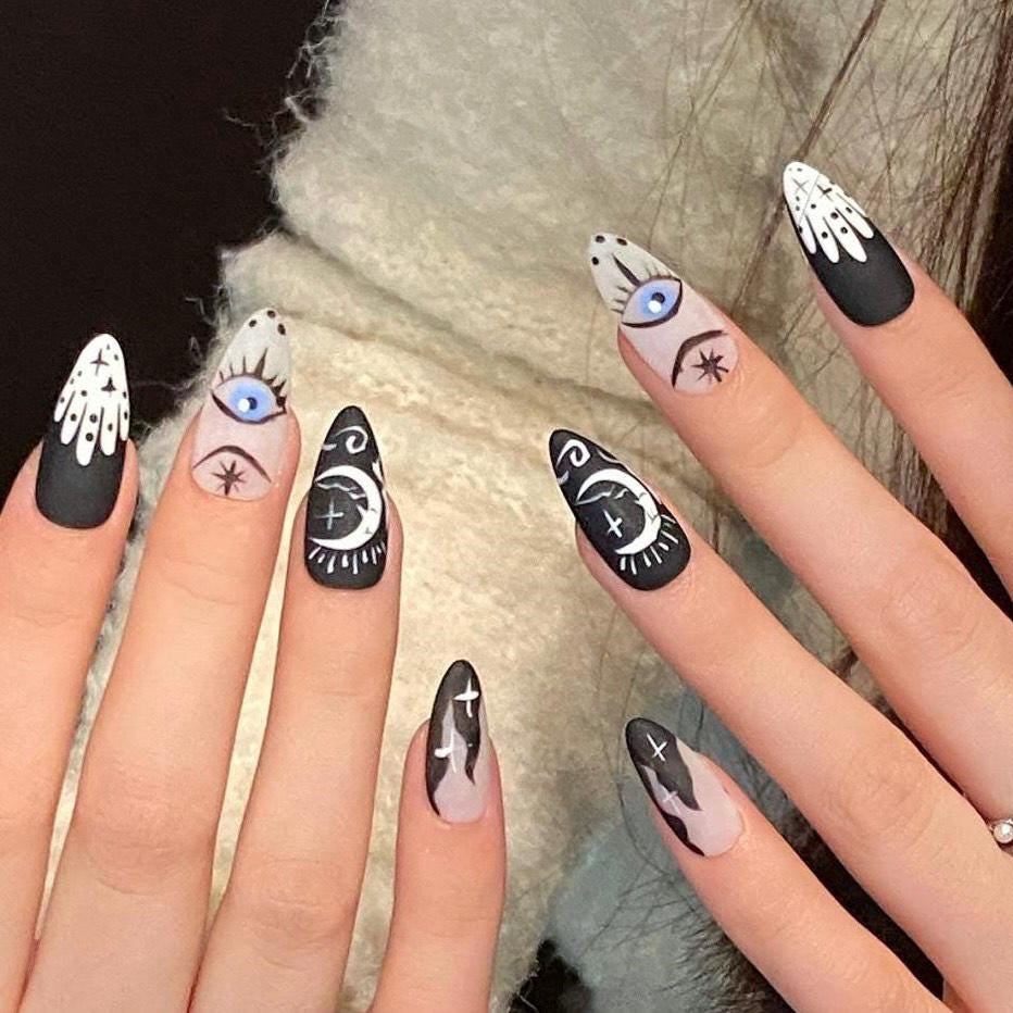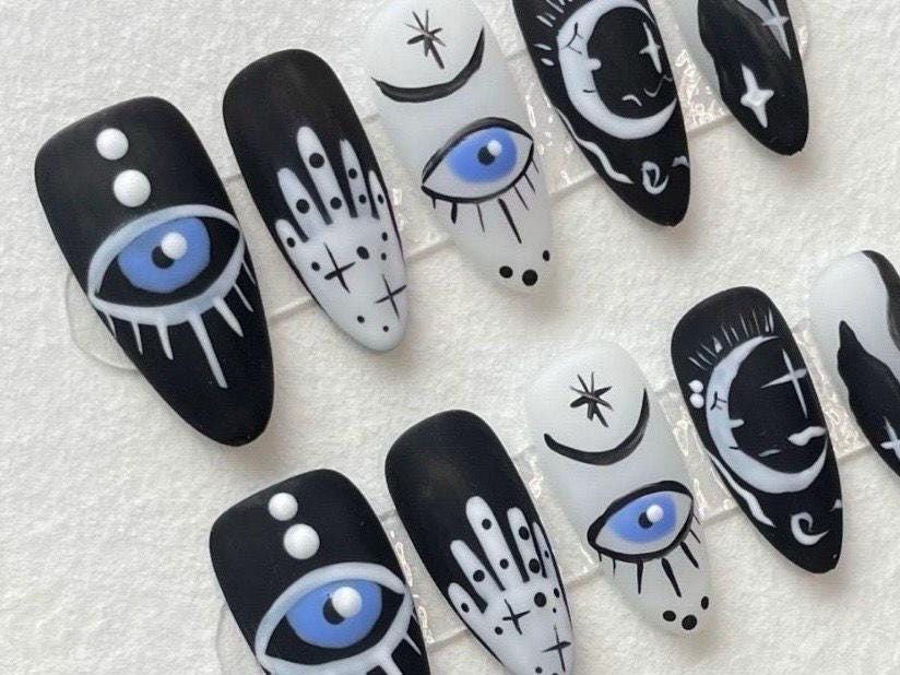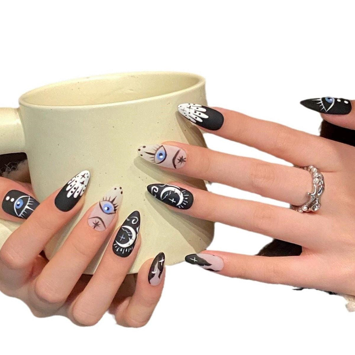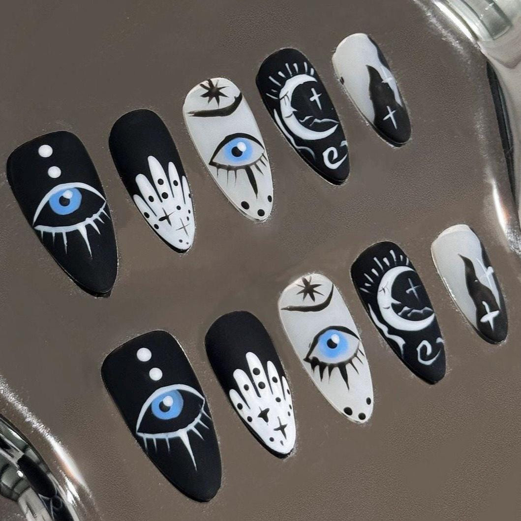 Mystic Eye Press On Nails Black and White Tarot Nails Hand Painted Celestial Nail Art Gothic Spiritual Nail Set Manicure glue on artificial