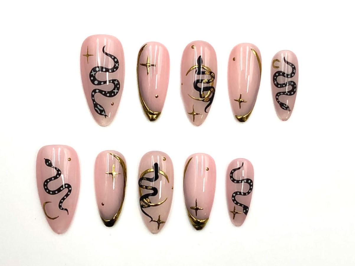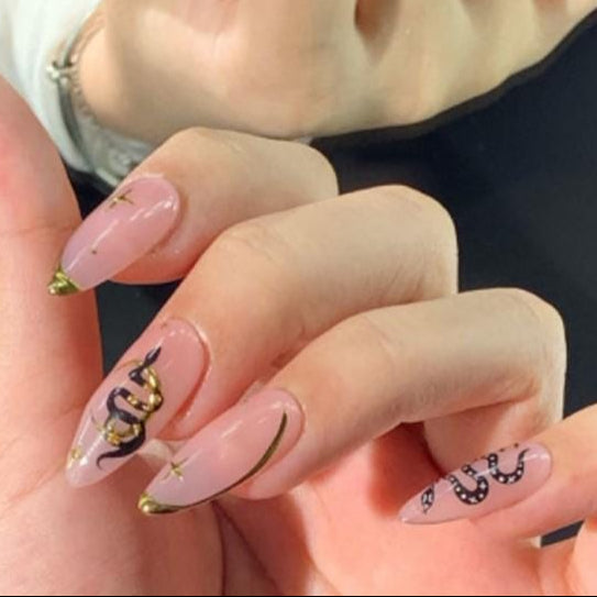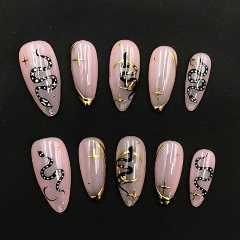 Channel mystical vibes with this nude-toned press-on nail set featuring celestial black snakes, golden moons, and star accents. The sleek almond shape and metallic gold details add a touch of glamour to this edgy, enchanting design. Ideal for lovers of the occult, astrology, and bold statement nails.