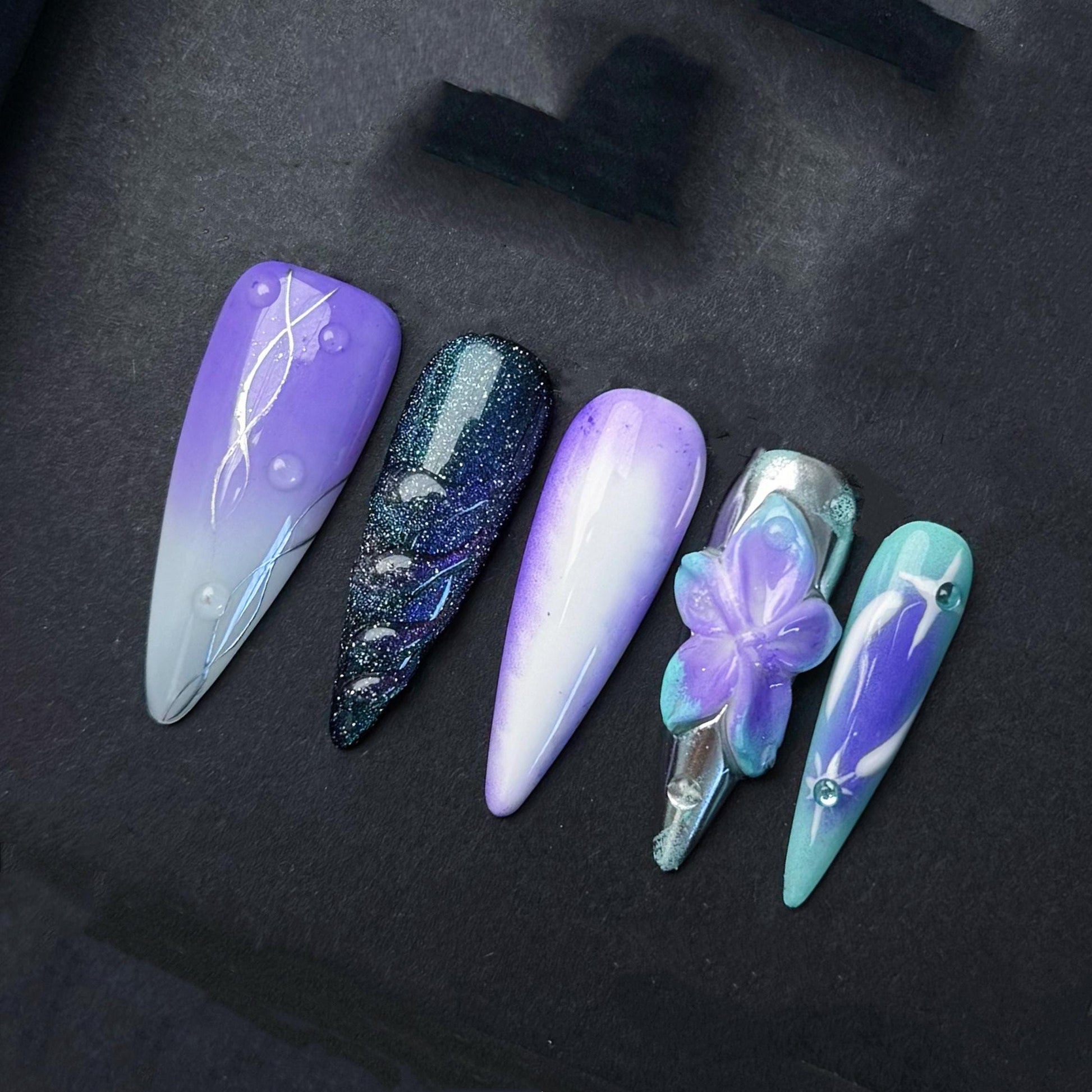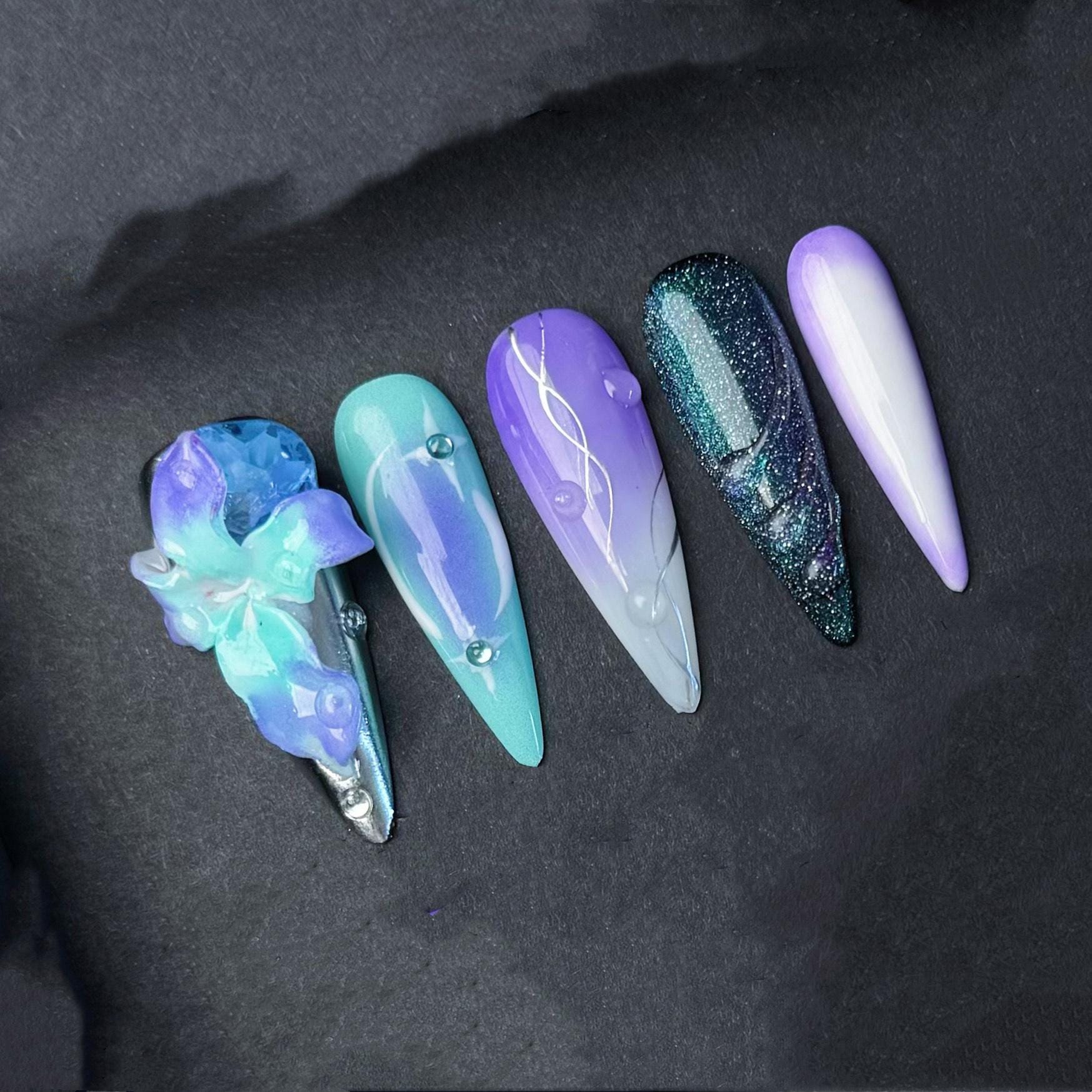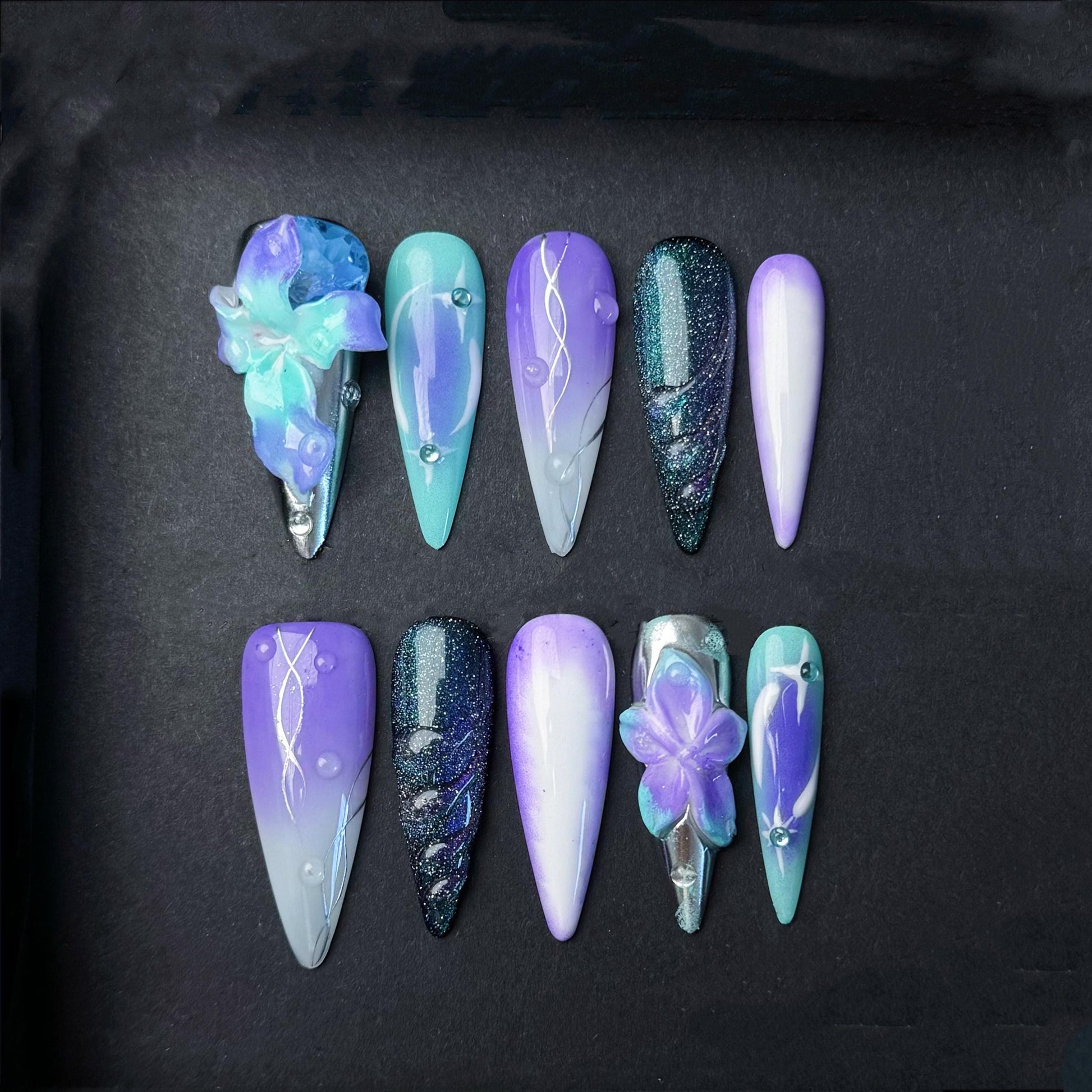 Dive into a cosmic dream with this stunning set of mystical press-on nails featuring a celestial palette of purple, teal, and shimmering black. Each nail showcases a unique design—ranging from ombré gradients and galaxy shimmer to elegant swirls and dewdrop accents. Two standout nails are crowned with sculpted 3D flowers in soft violet and icy blue, adding a bold yet ethereal touch. This handmade set is perfect for fantasy lovers, celestial aesthetics, or anyone wanting an otherworldly nail moment. Reusable and durable for both special occasions and everyday magic.