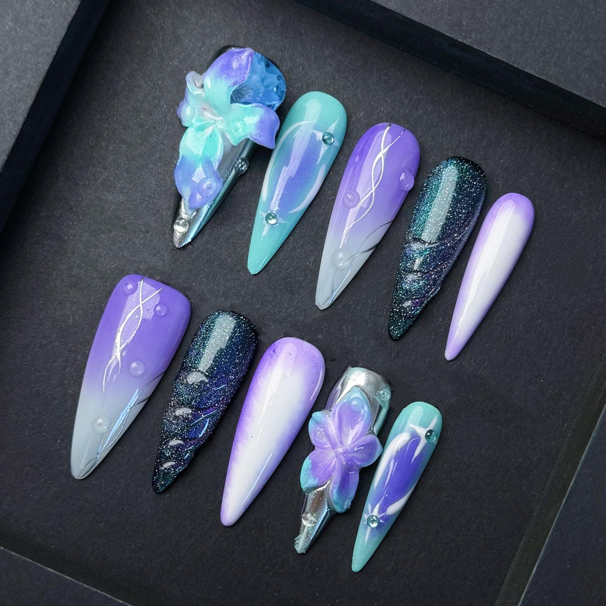 Mystical Purple and Teal Gradient Press-On Nails with 3D Flowers and Shimmer. Artificial reusable fake glue on faux manicure trendy art.