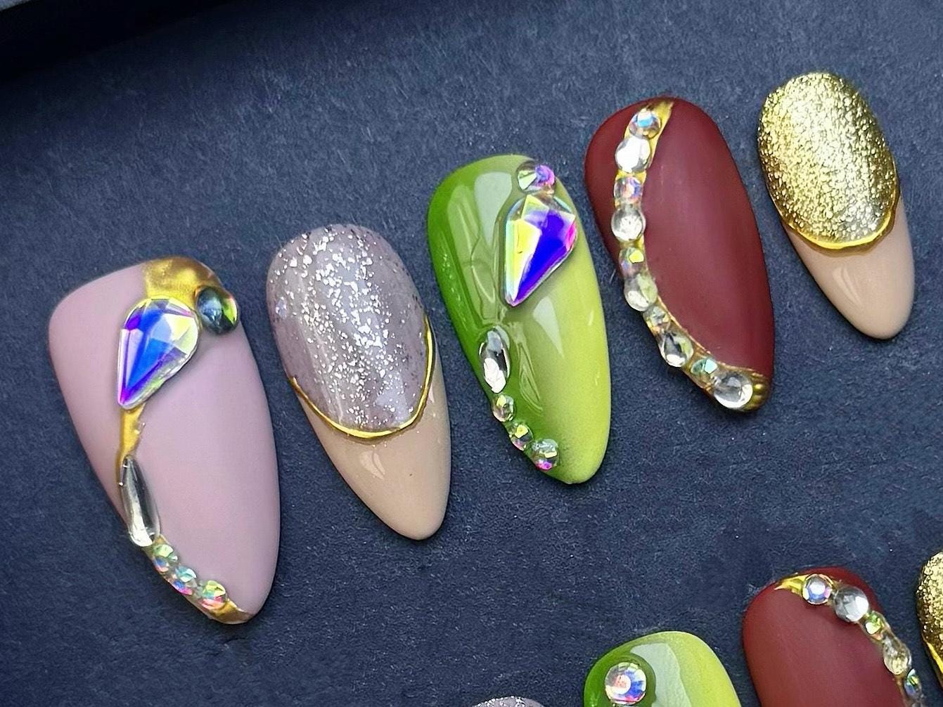 nail art, rhinestone luxury acrylic designer gem glitter nails, matte nails, gold nails, multicolor nails, press on nails, hand painted