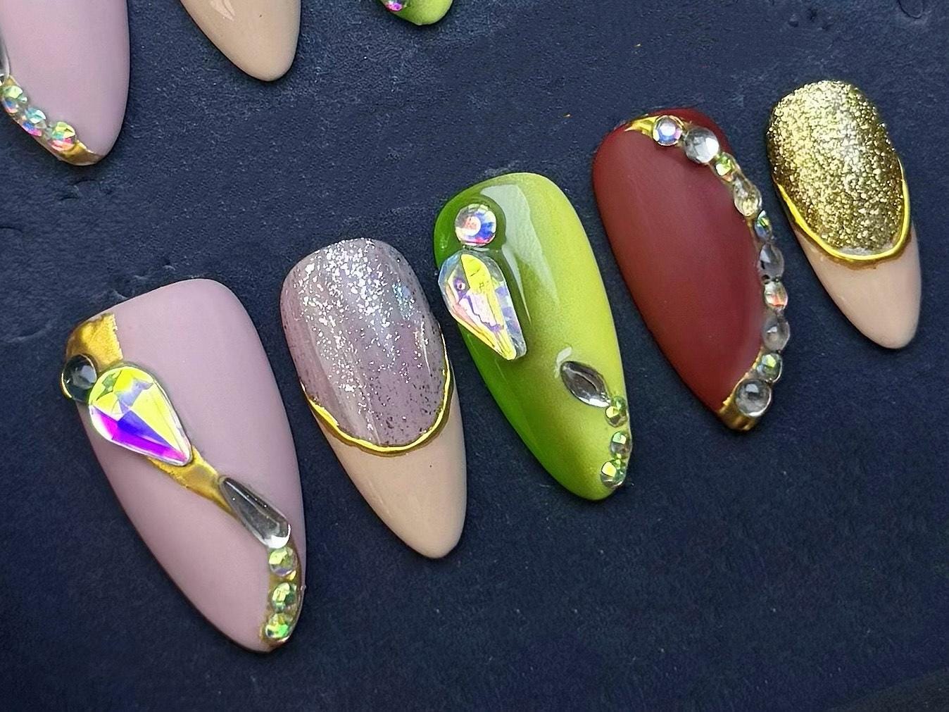 This luxurious nail art set features a stunning combination of matte and glossy finishes in rich tones of blush pink, nude, olive green, and deep red. Each nail is adorned with eye-catching rhinestones, gold detailing, and shimmering accents. Perfect for special occasions or adding a bold statement to everyday wear, these designs blend elegance with creativity for a glamorous manicure.