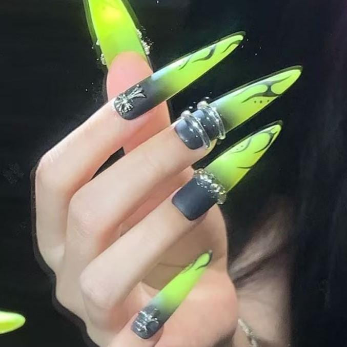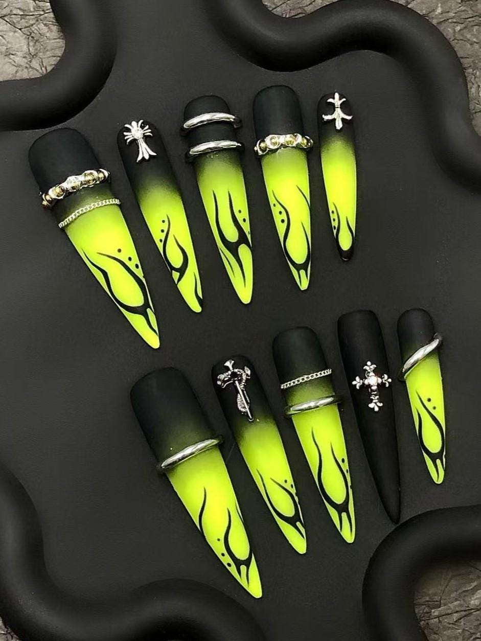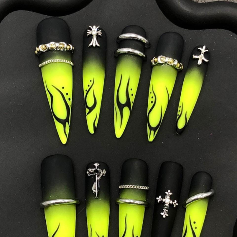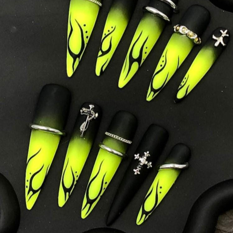 Bring the heat with these bold gothic press-on nails, featuring a striking neon green to matte black ombré base with tribal flame accents. Adorned with silver rings, crosses, and gothic charms, these long stiletto nails are made for edgy fashion lovers who want to stand out.