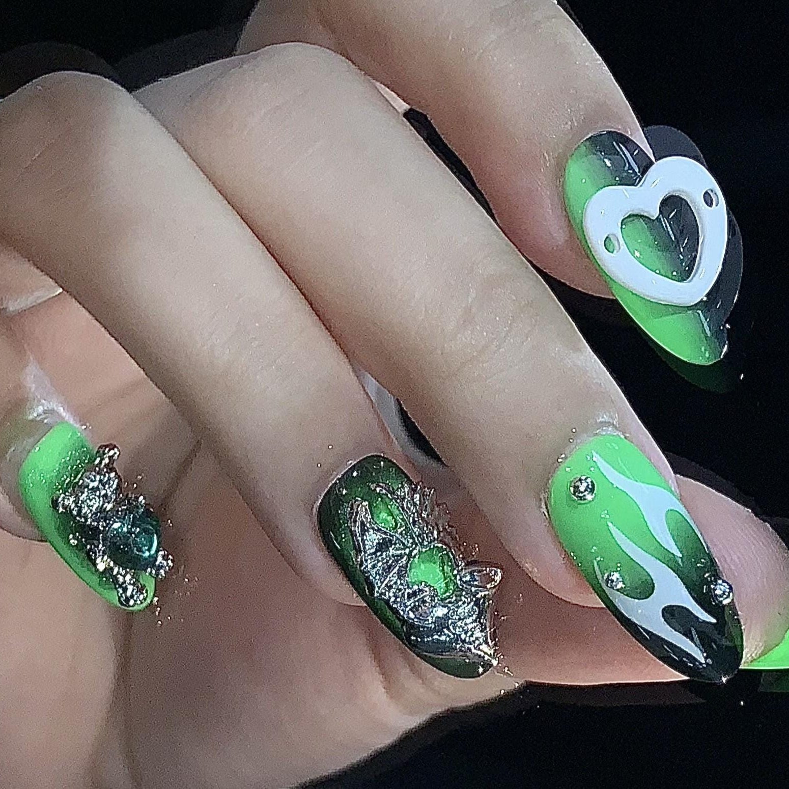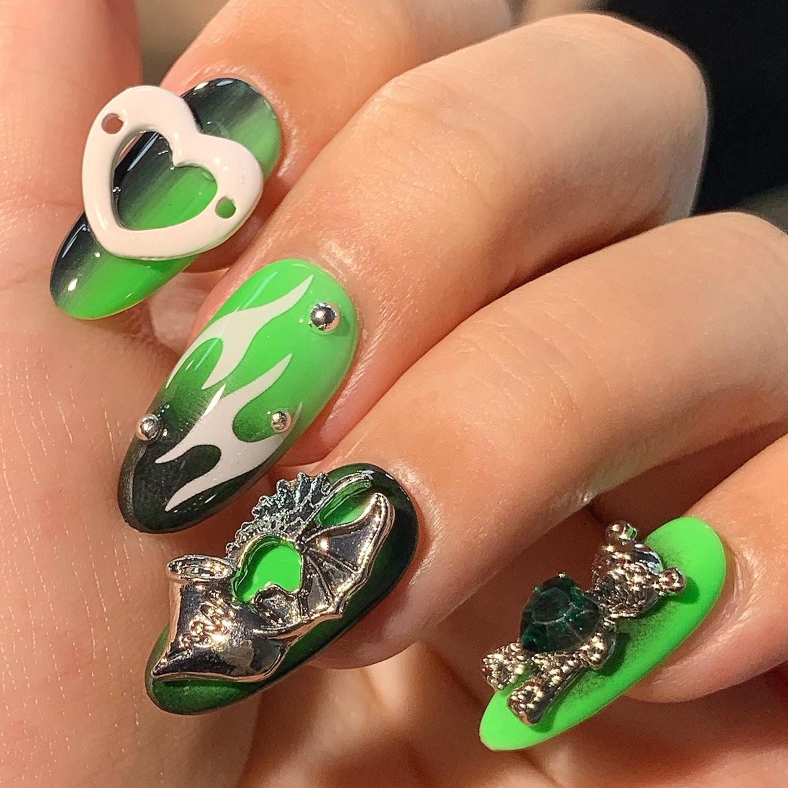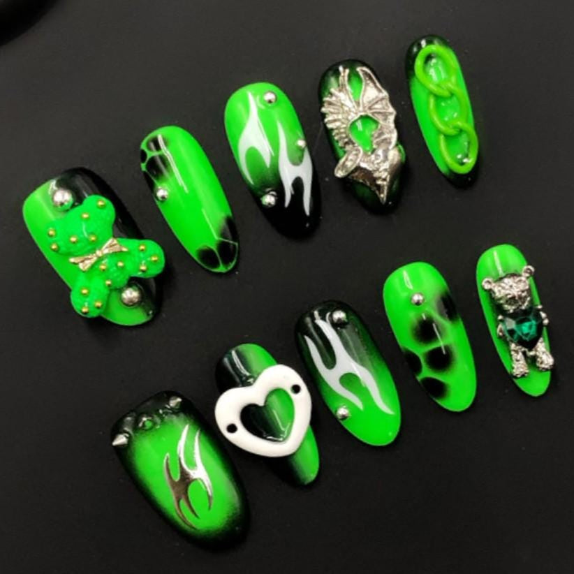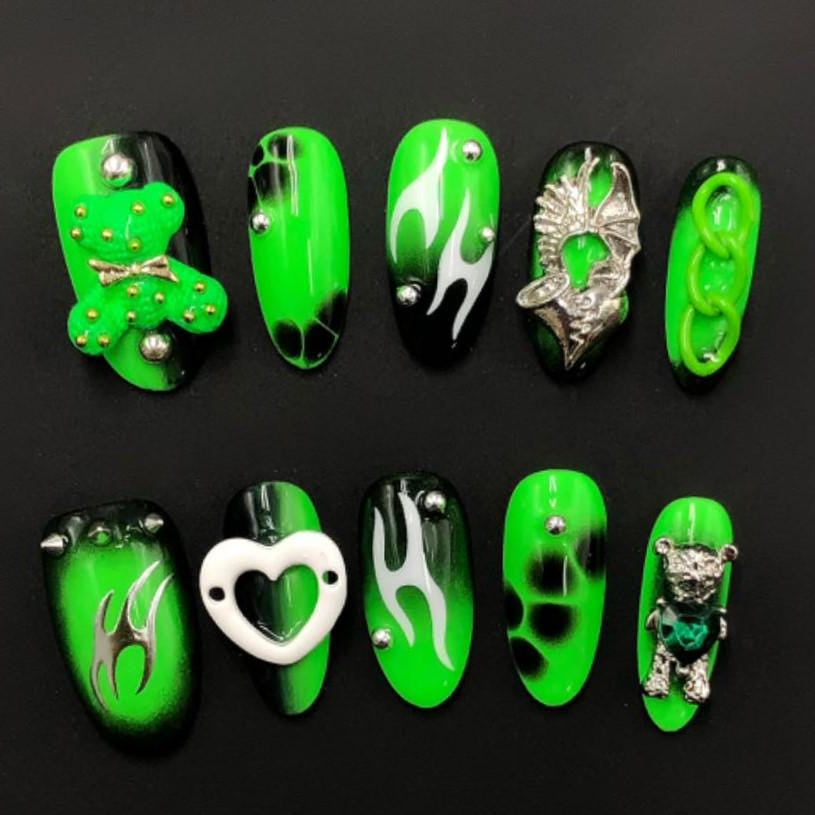 Neon Green Grunge Press On Nails – Flame, Dragon, and Teddy Bear Y2K Set Artificial reusable fake glue on faux manicure nails trendy art
