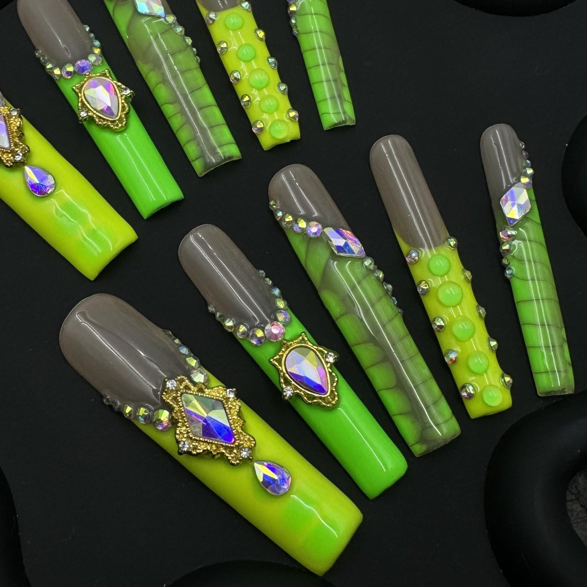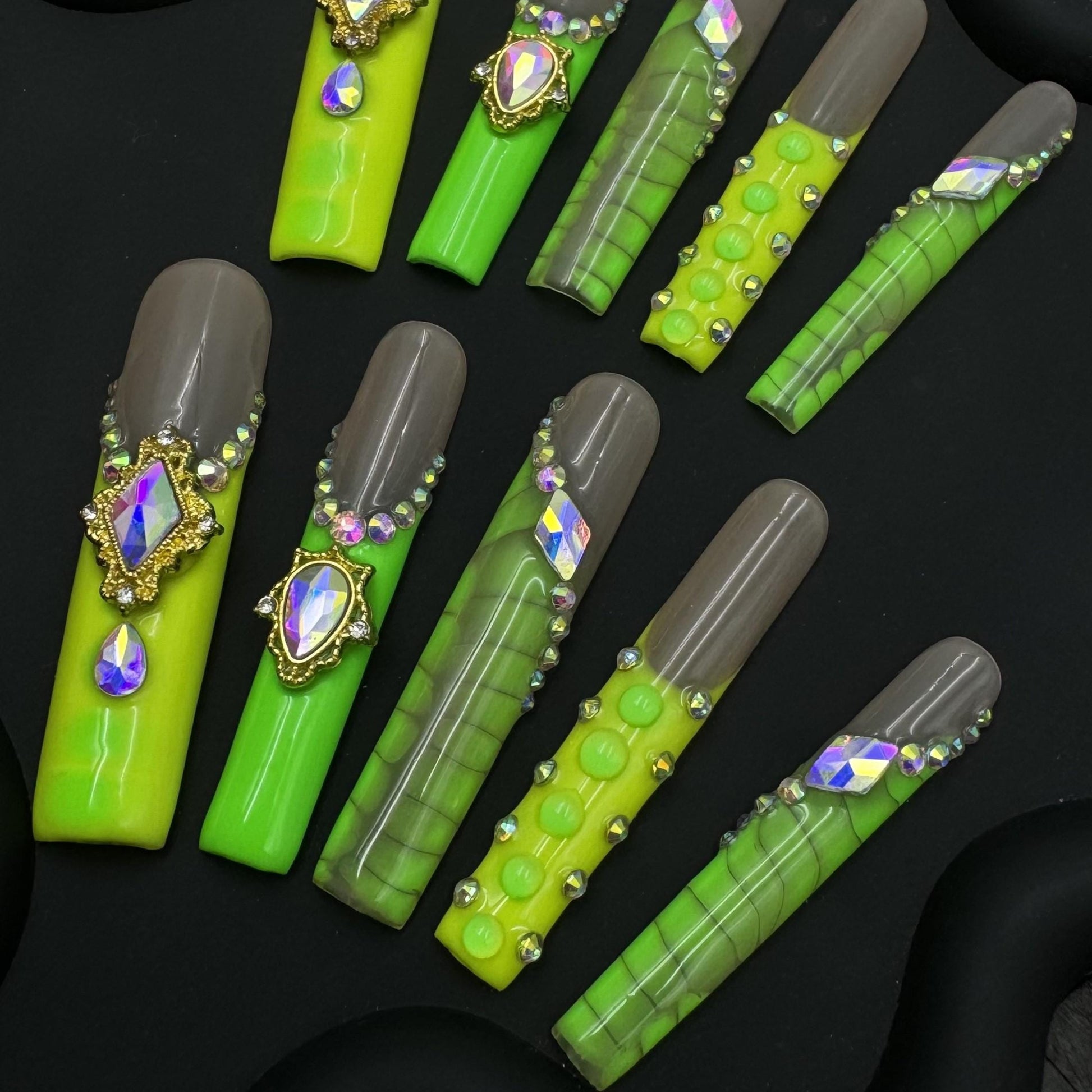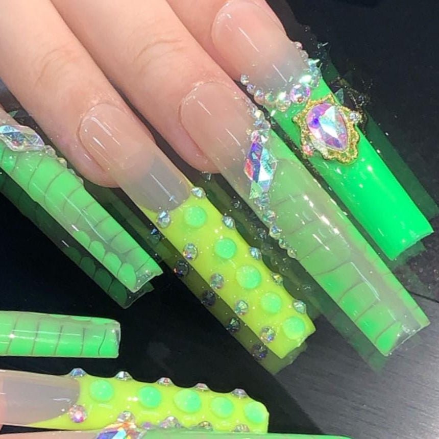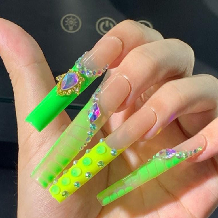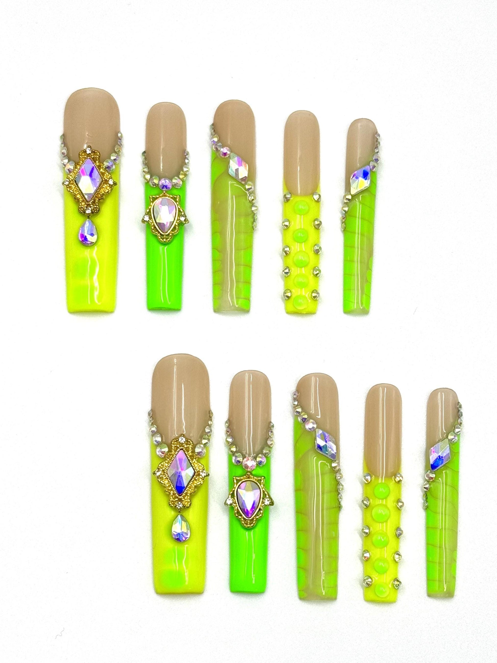 Neon Green & Nude Press-On Nails with 3D Jewels Luxe Slimecore Glam Nail Set Artificial reusable fake glue on faux manicure nails trendy art