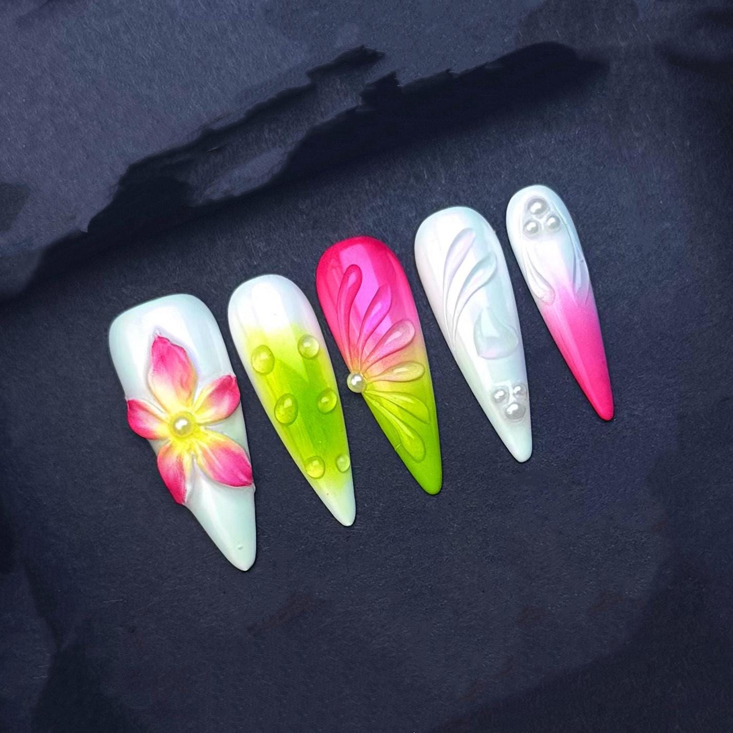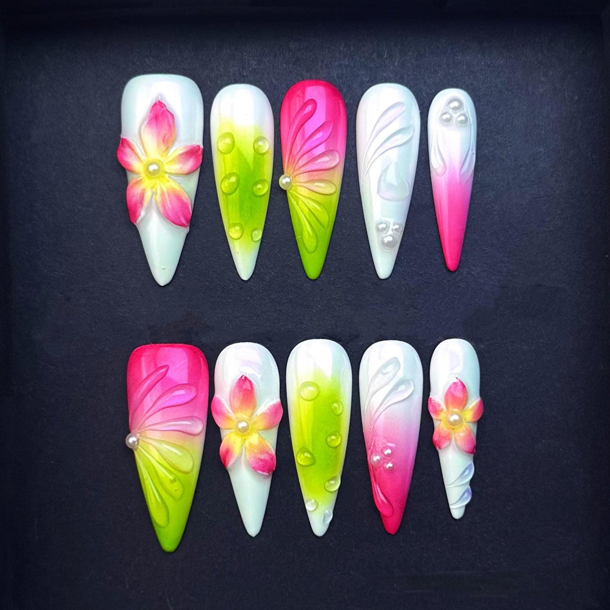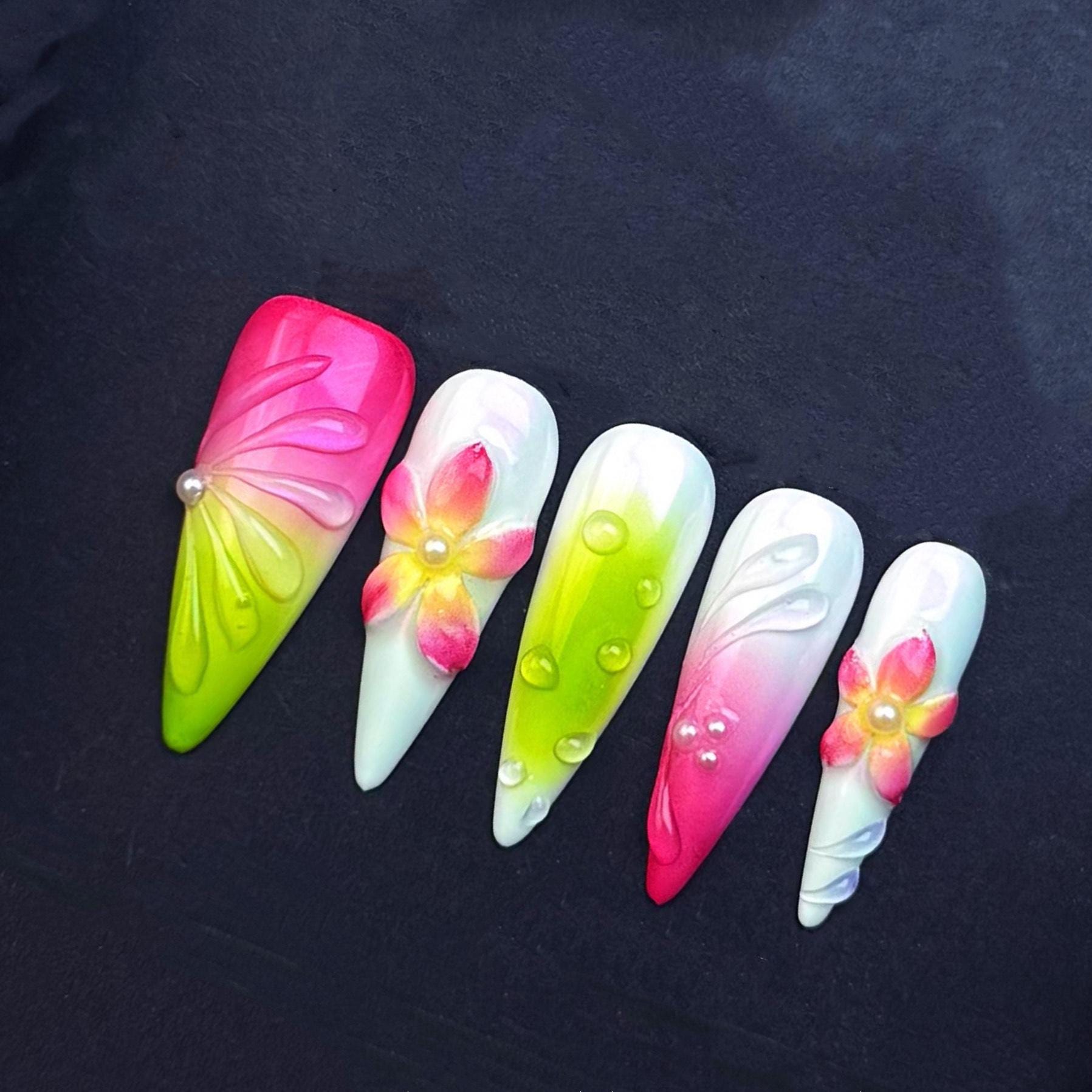 This vibrant press on nail set features neon pink and green ombre designs with 3D flowers sculpted petals and dewdrop accents Each handmade nail blends bright colors with soft nature inspired details for a playful fresh and floral look perfect for spring and summer styles