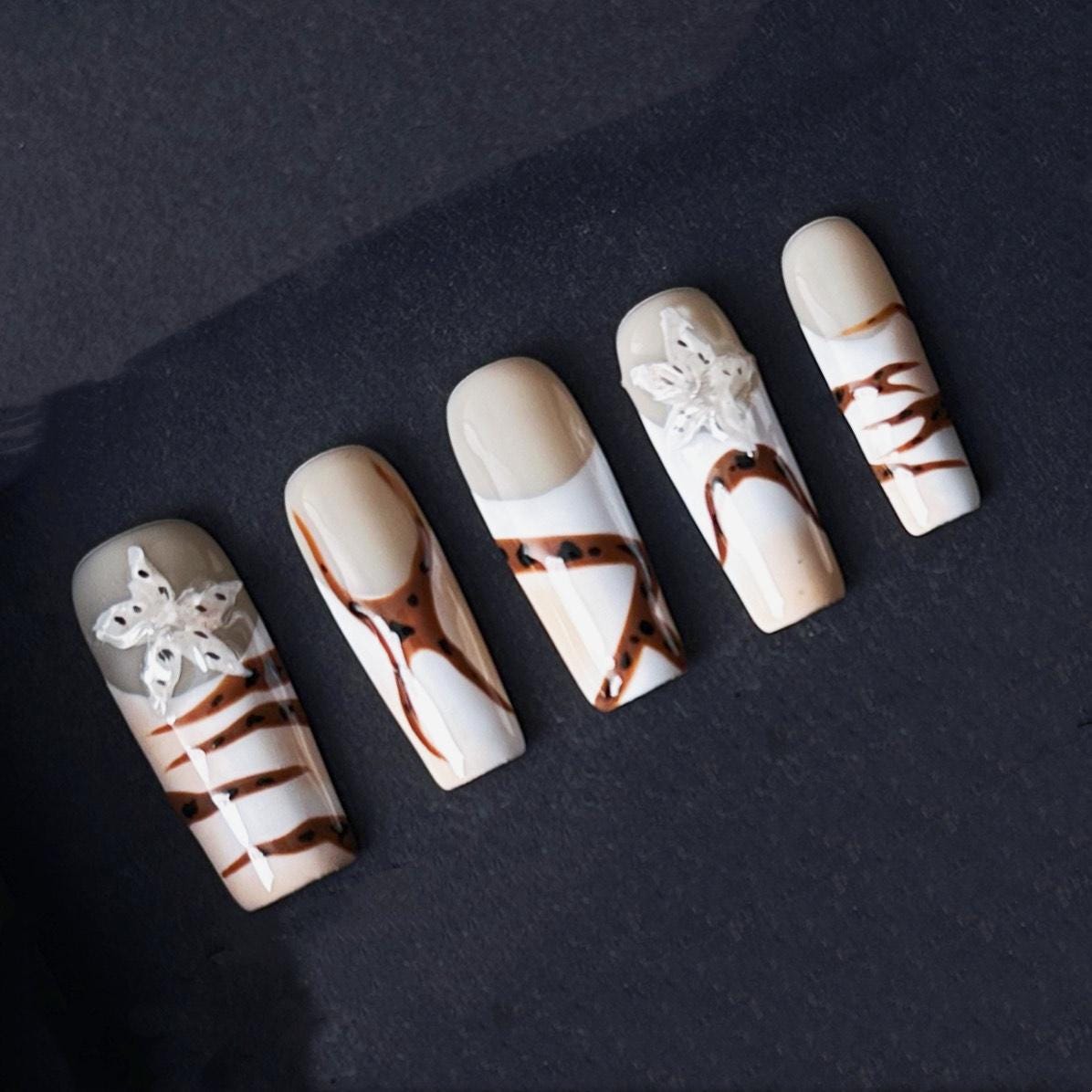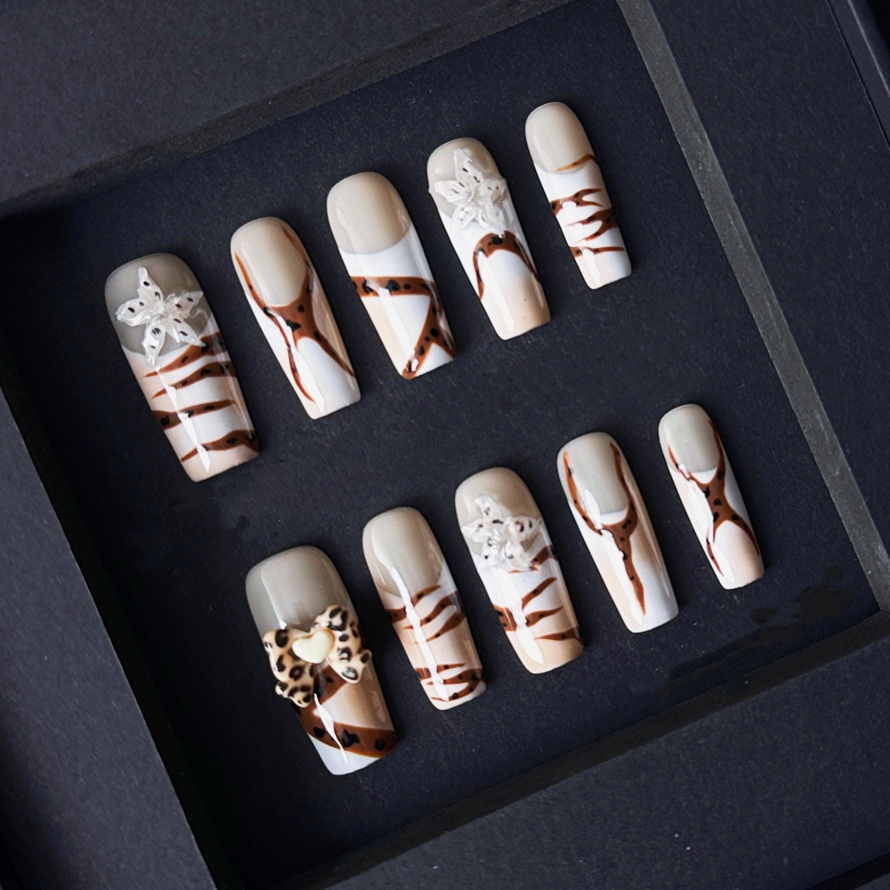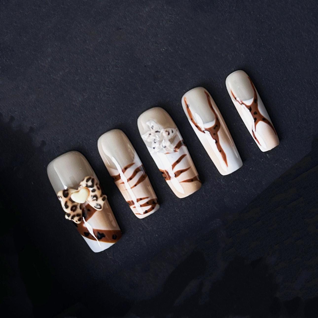 These press on nails feature a chic neutral palette with bold animal print details including a 3d leopard bow and hand painted stripes The warm earthy tones and playful jungle inspired design make this set perfect for anyone who loves stylish wild vibes