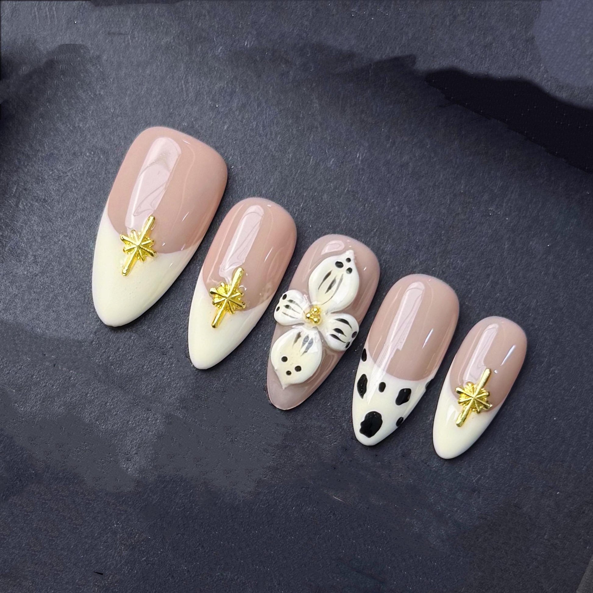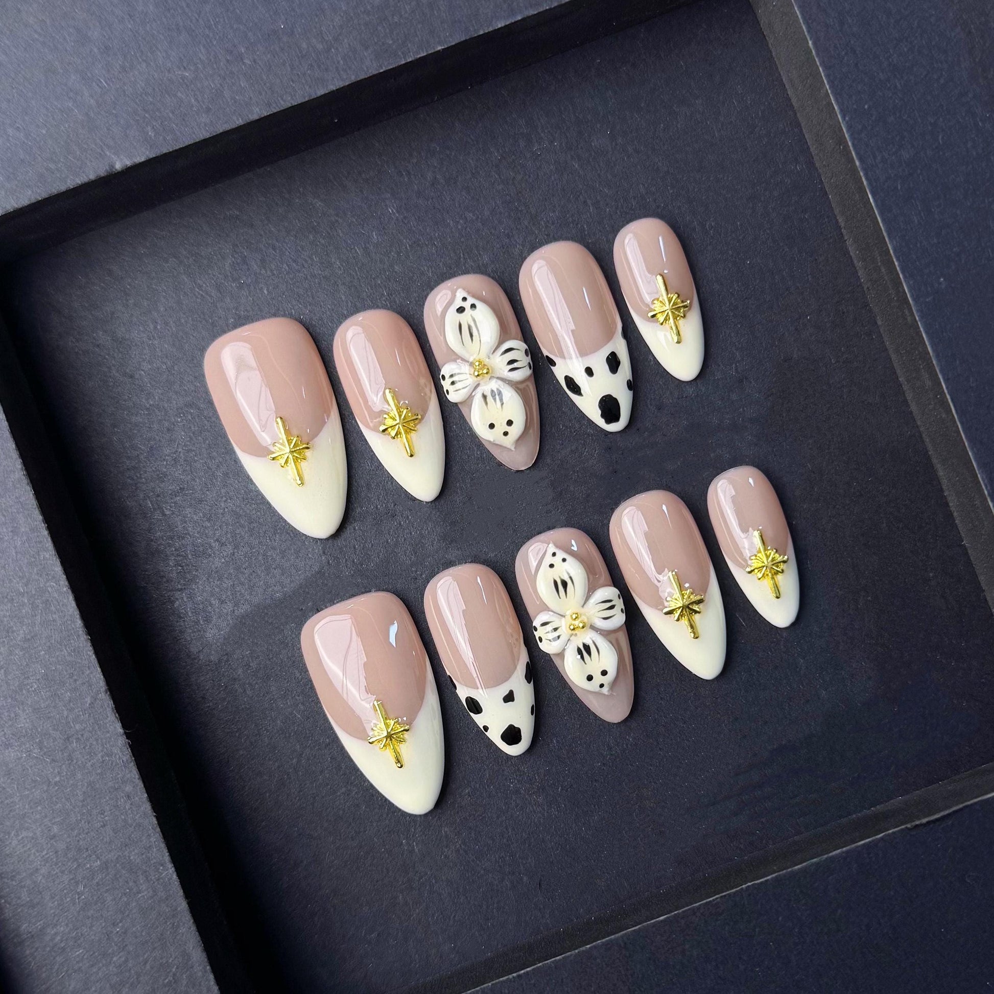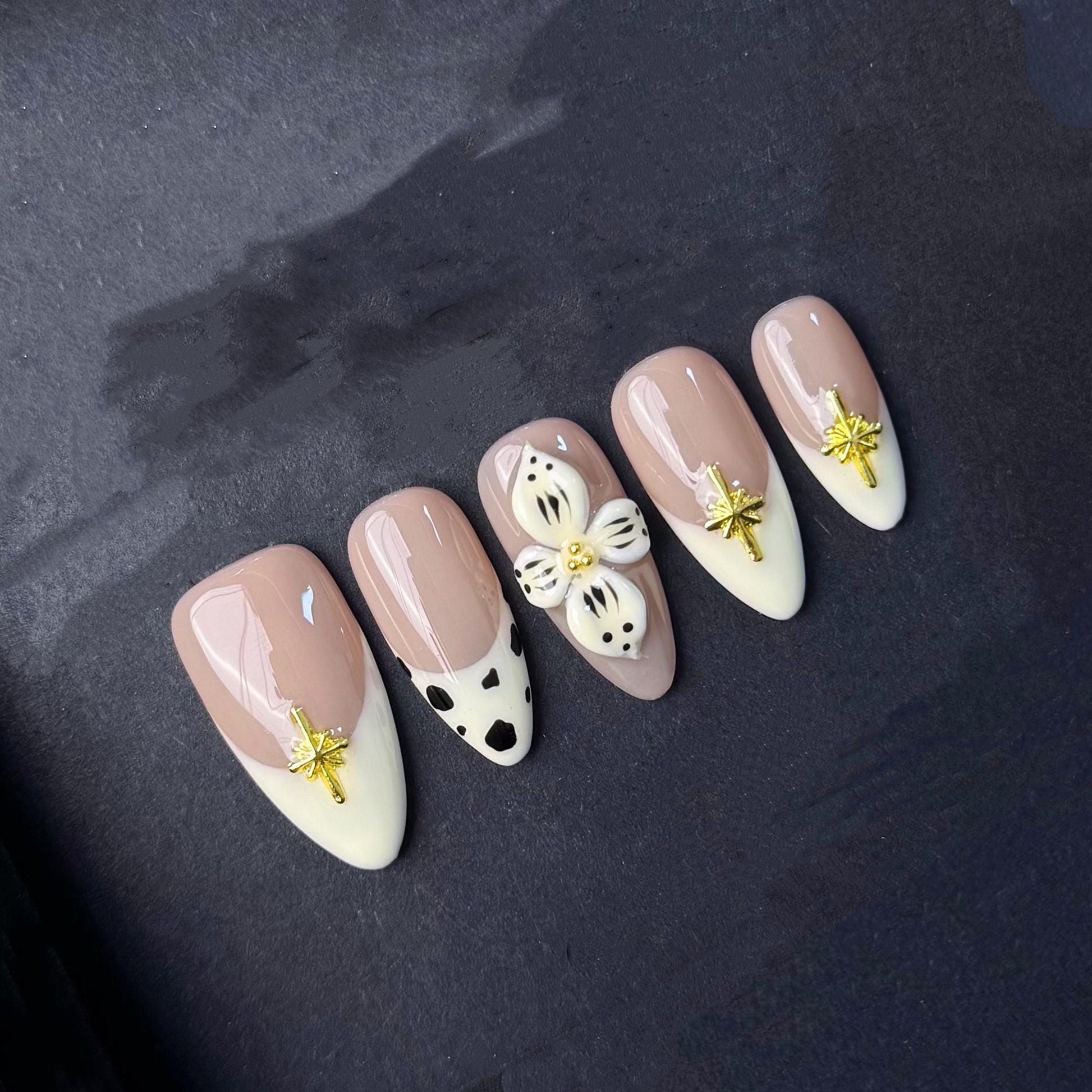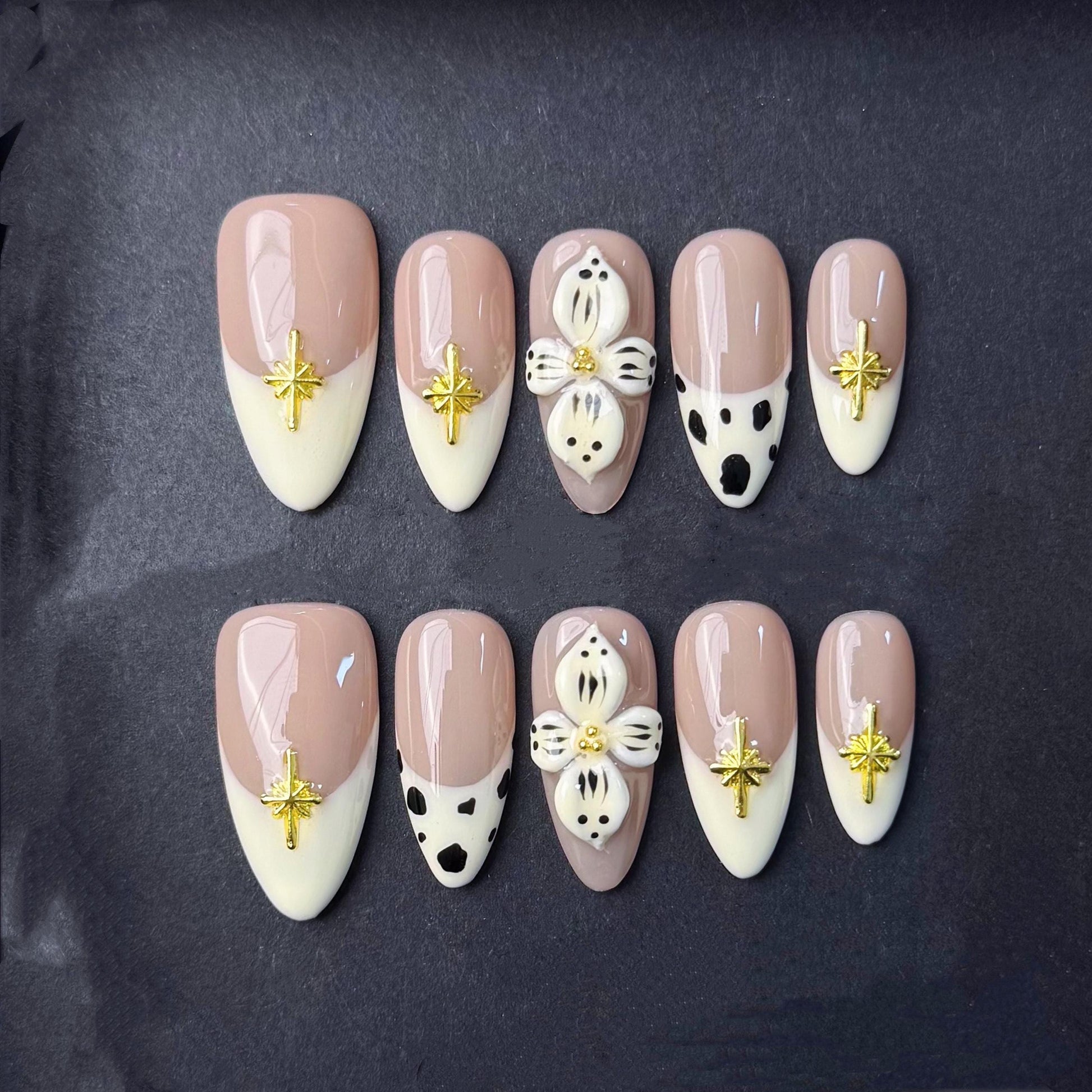 This elegant set of neutral-toned press-on nails features a unique blend of soft taupe and creamy ivory hues. Accentuated with black cow print patterns and intricate 3D white florals, each nail showcases a modern-meets-classic aesthetic. The luxurious gold cross star charms add a celestial and regal finish to the set. Perfect for fashion-forward individuals who love a mix of playful detail and refined embellishment. These almond-shaped nails are ideal for everyday wear, brunch dates, or statement moments, and come pre-designed for easy application.