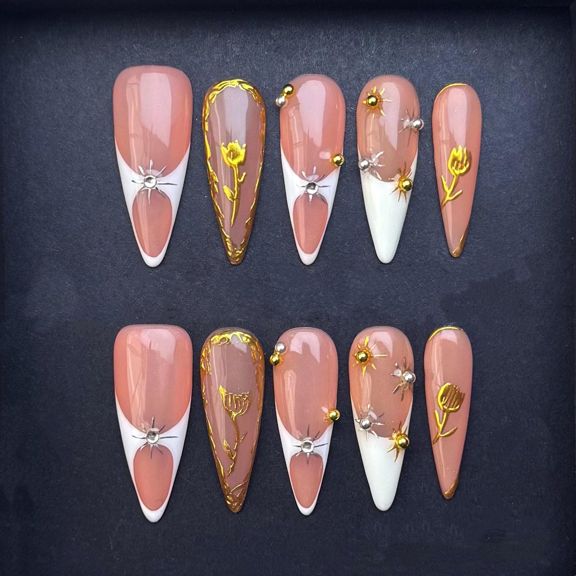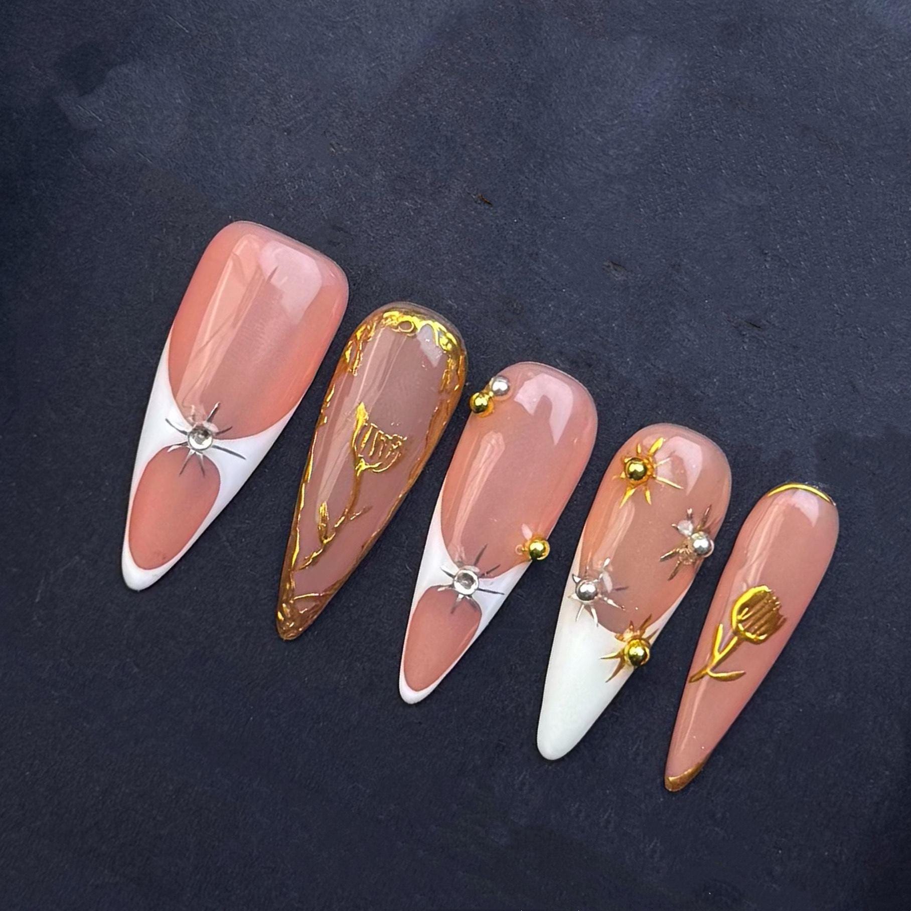 Nude and White Press On Nails with Gold Floral Accents and Rhinestones artificial reusable fake glue on faux manicure nails trendy art