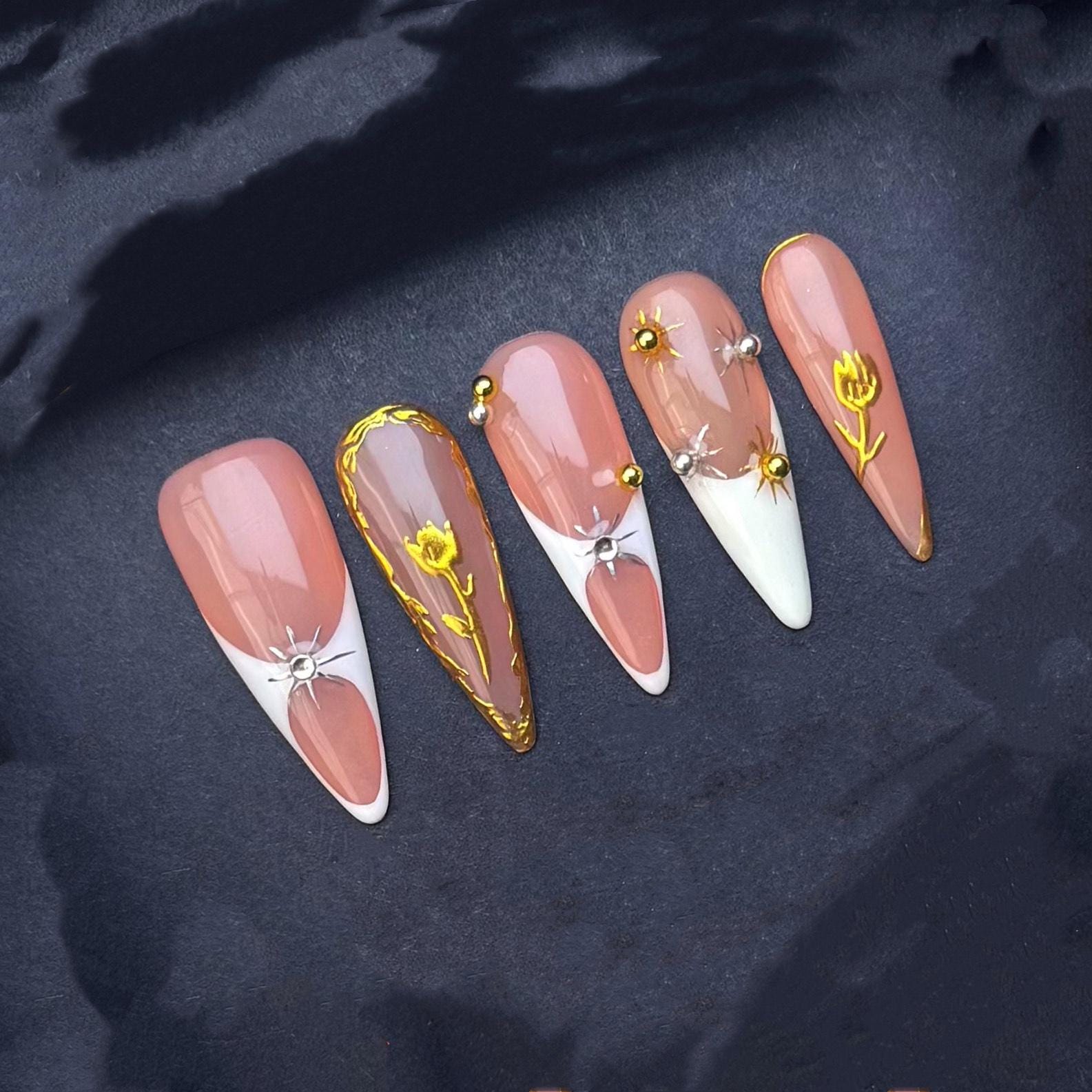 This elegant press on nail set combines nude and white tones with gold foil floral accents and delicate rhinestones Featuring a modern French tip design with subtle detailing each nail is handcrafted for a timeless sophisticated look perfect for weddings events or everyday elegance