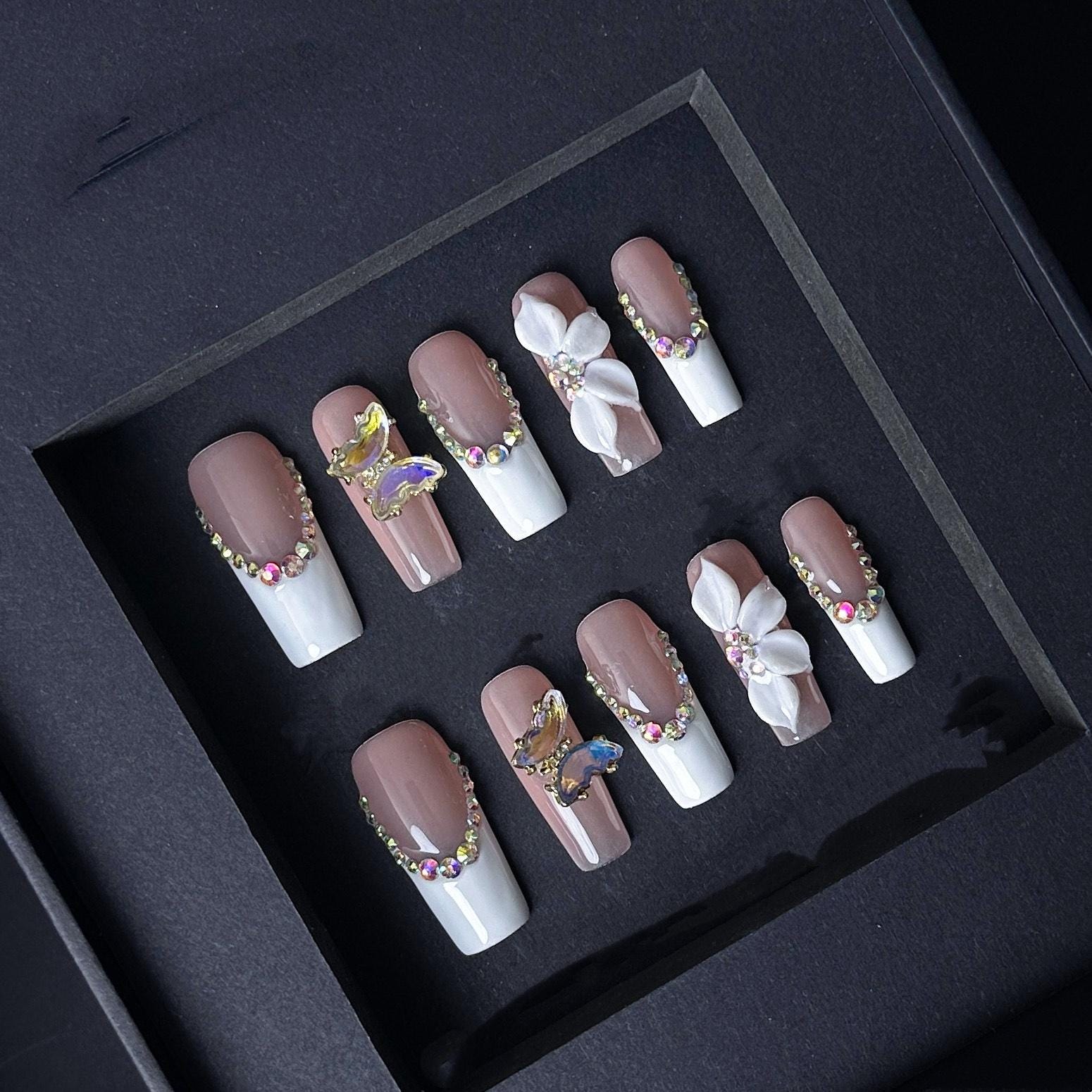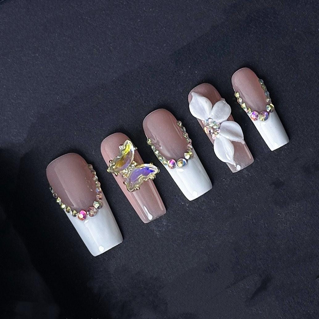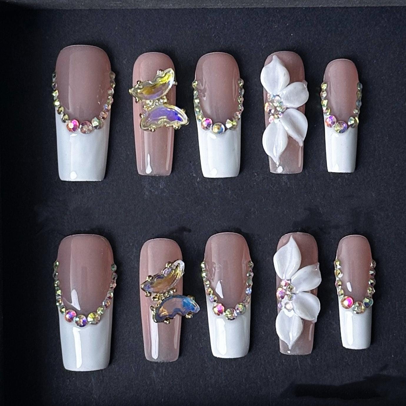 Nude and White Rhinestone Press On Nails with Butterfly and 3D Flower Accents Manicure press on artificial glue on faux reusable trendy nail