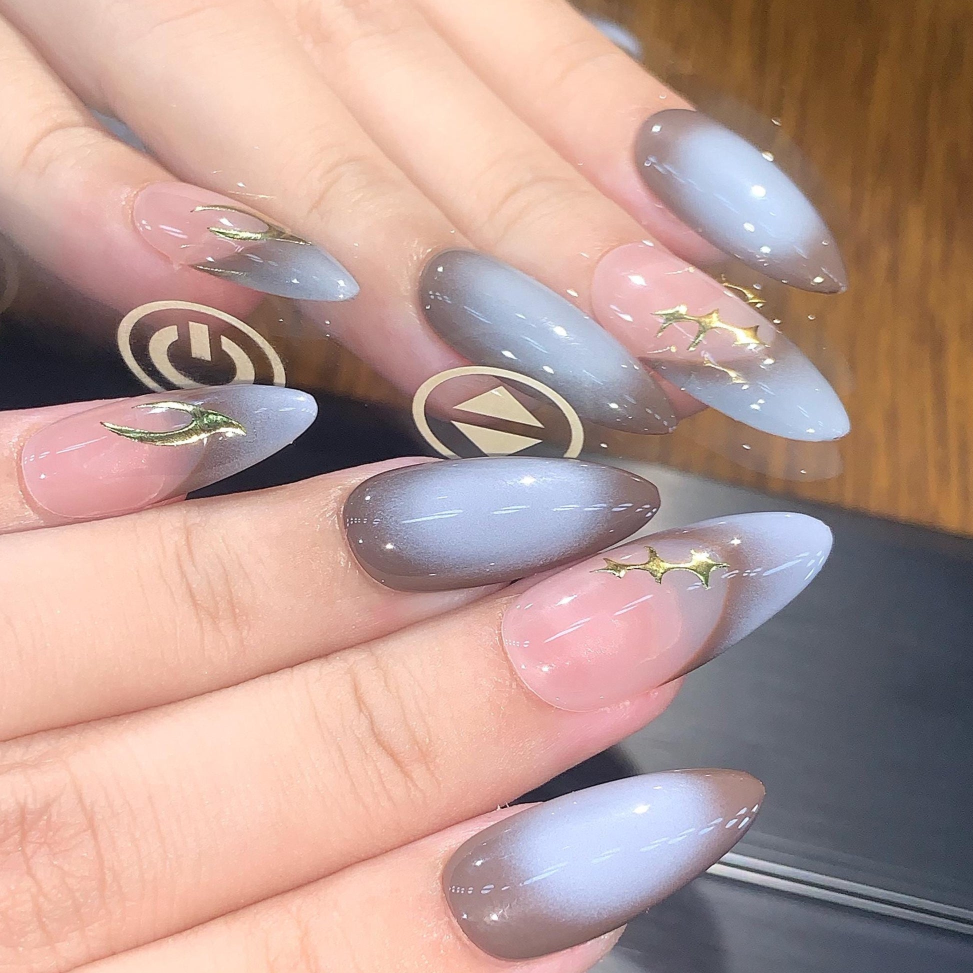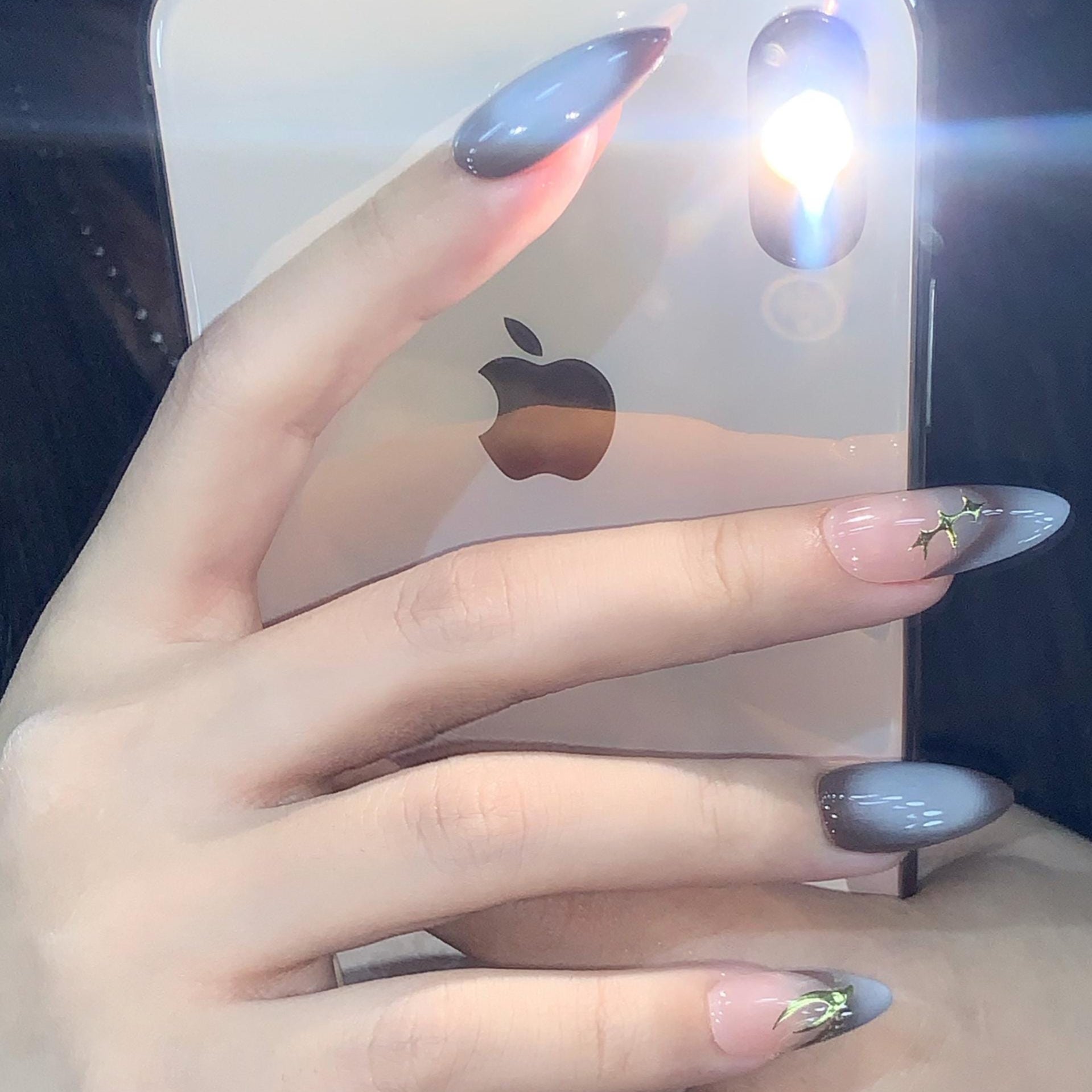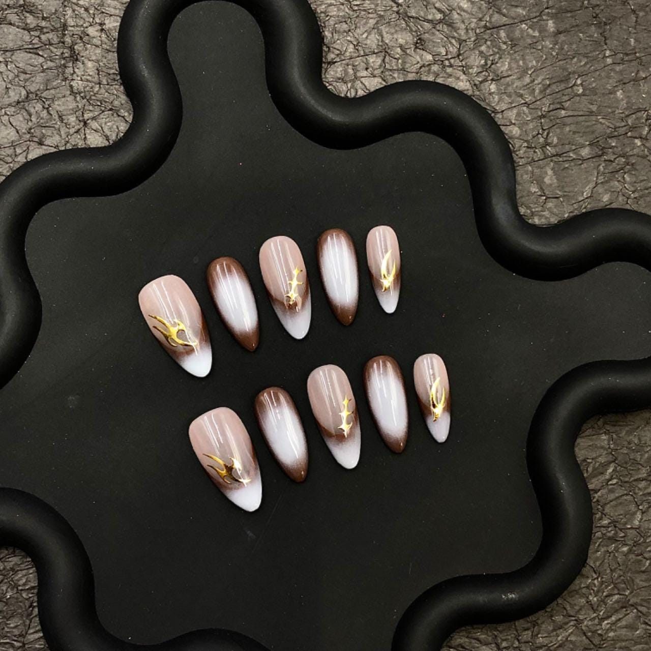 Nude black ombré nails almond-shaped press-on gold nail art elegant manicure minimalist nail style modern nail fashion, glossy subtle luxury