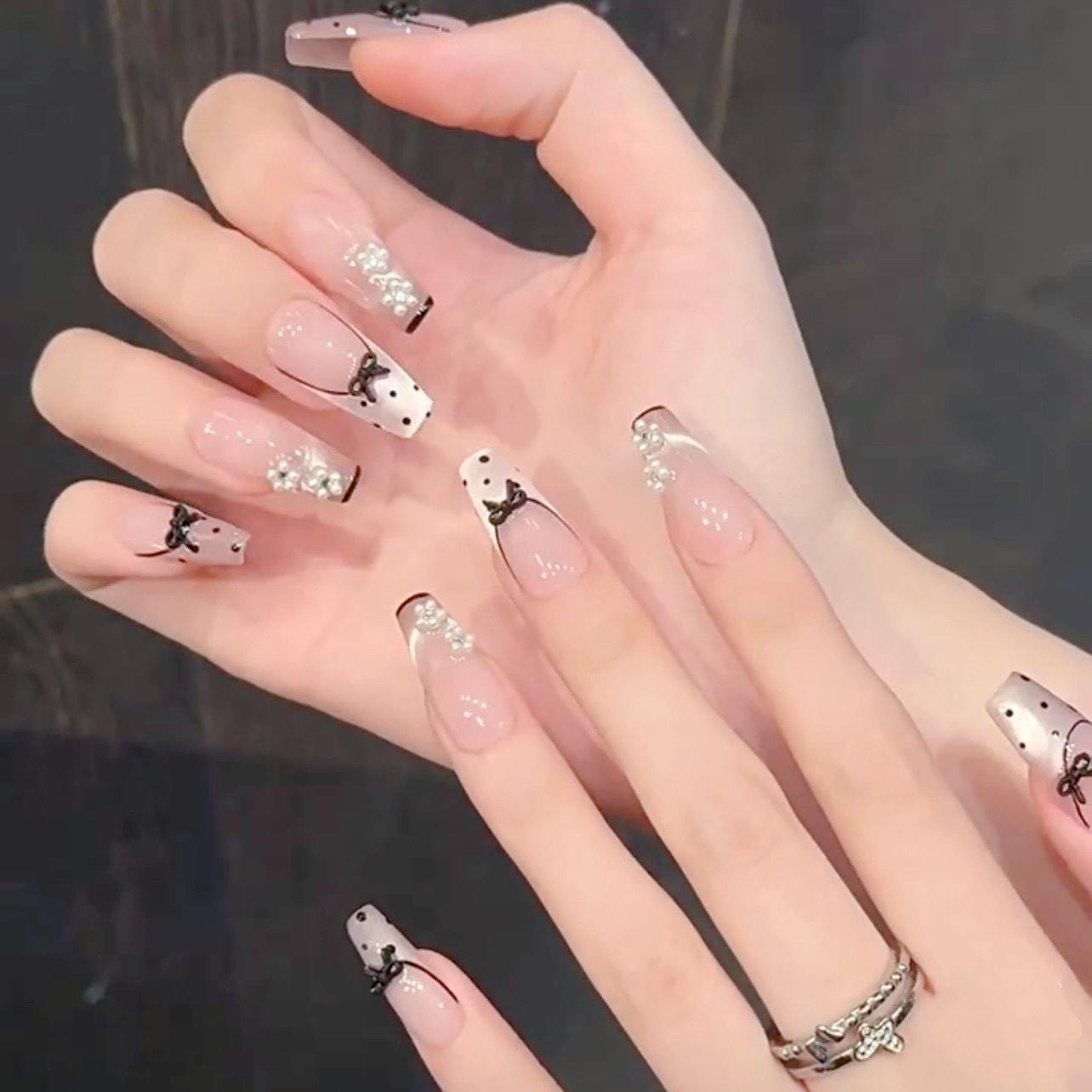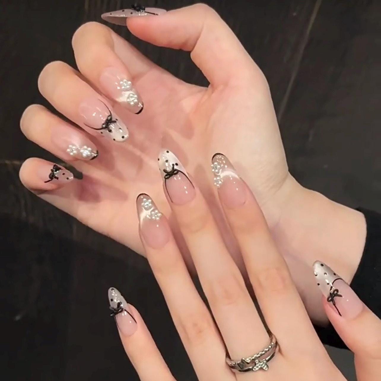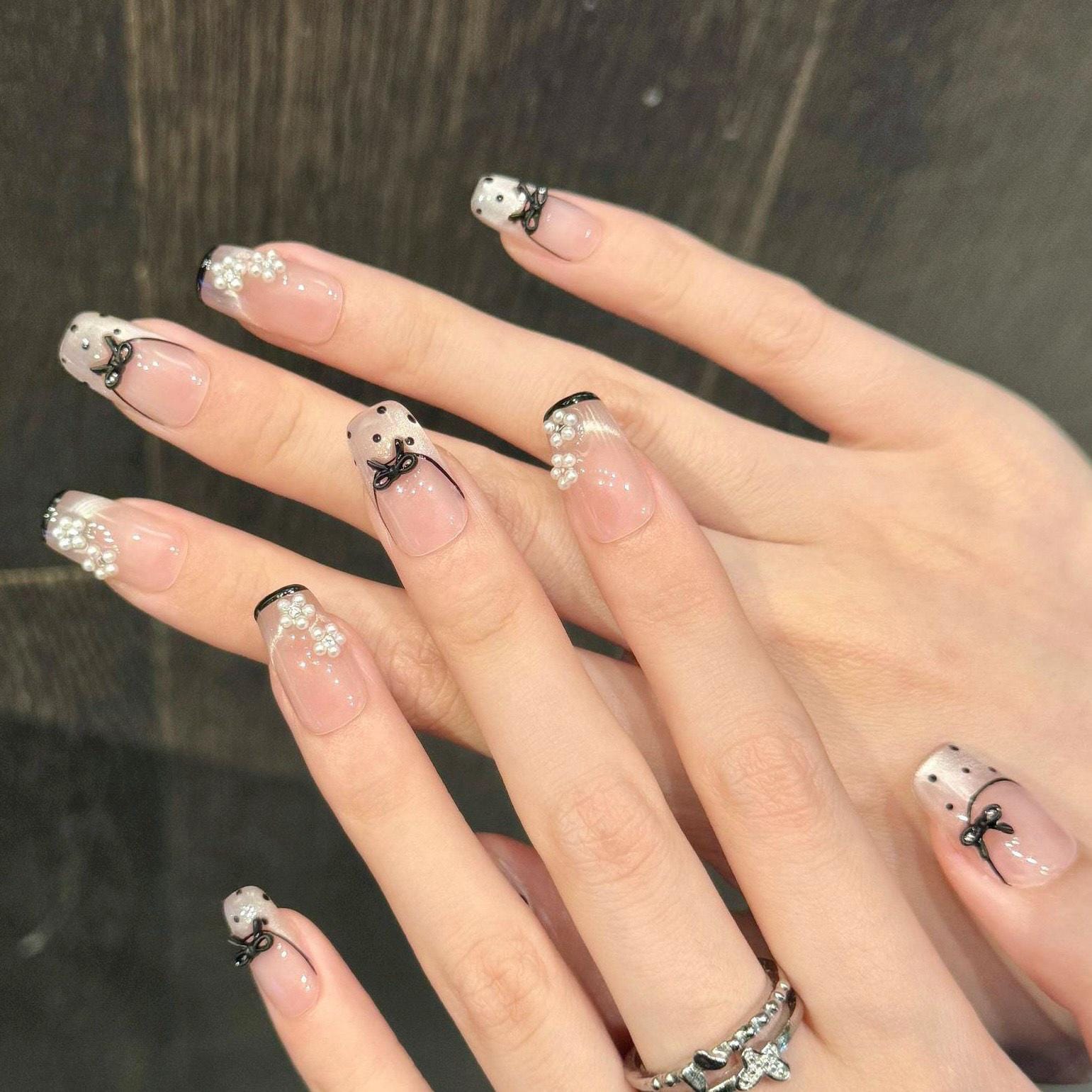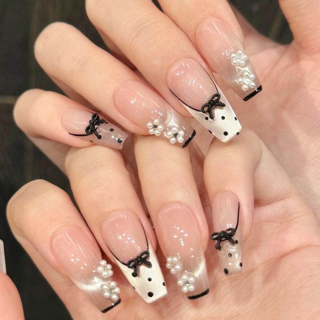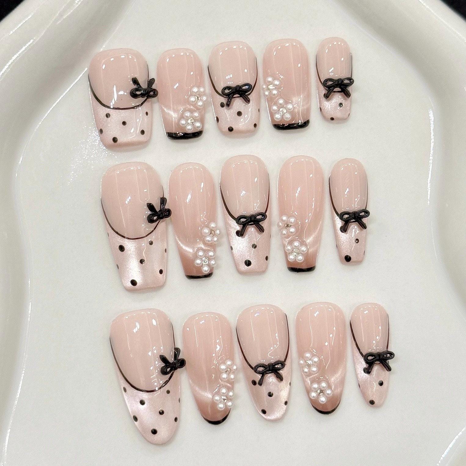 Nude Pearl Press On Nails with Black Bows Polka Dots and French Tips. Artificial reusable fake glue on faux manicure nails trendy art.