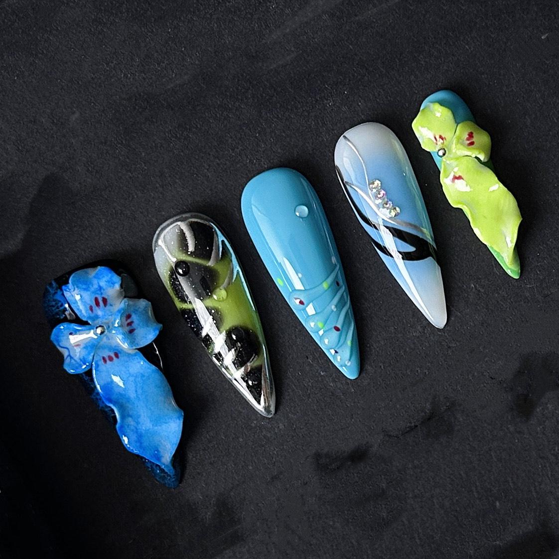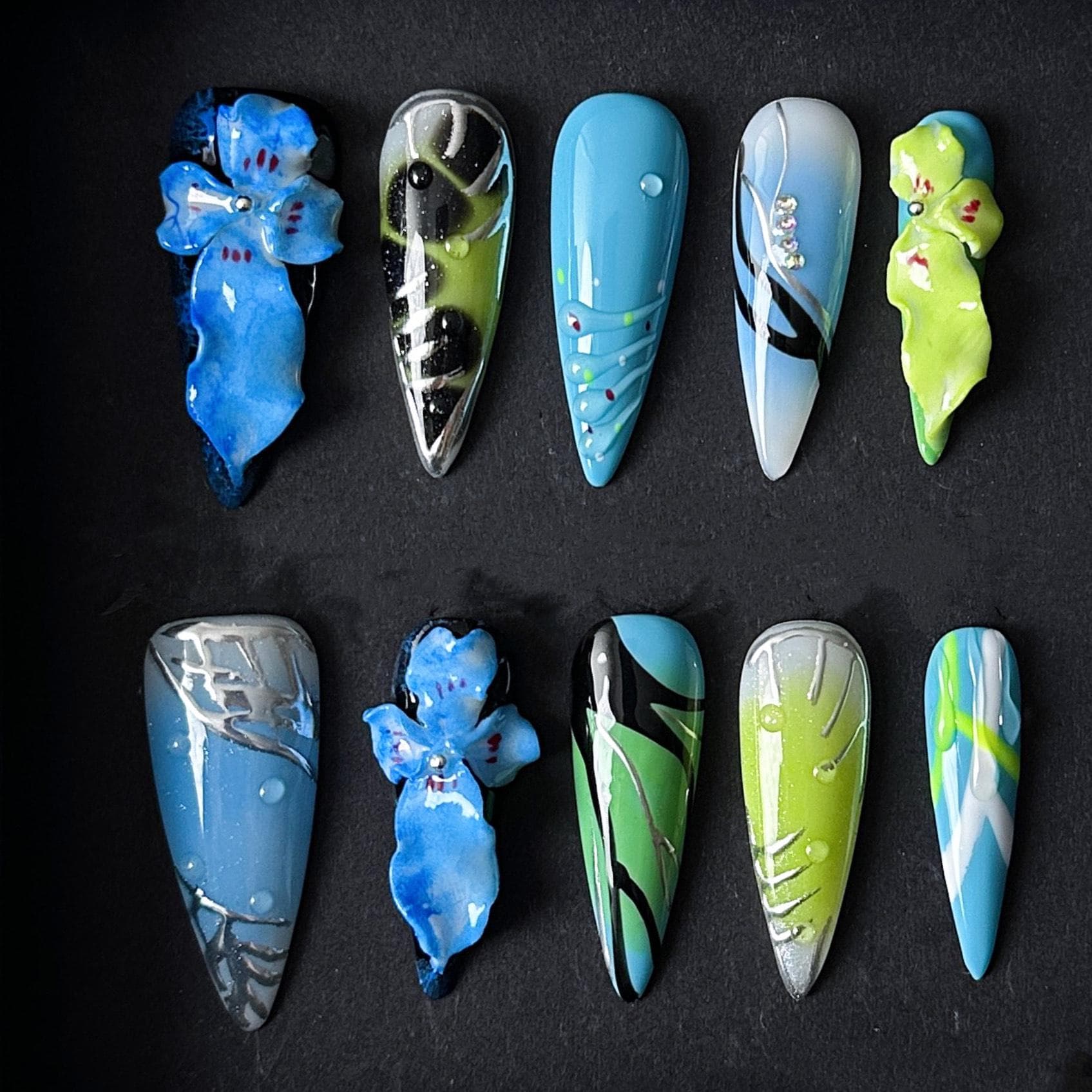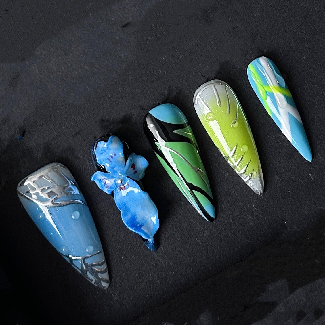 This striking press on nail set features vivid blues and greens with abstract waves futuristic details and sculpted 3D orchids in both sky blue and lime green. A perfect blend of nature and edge for anyone wanting a bold tropical summer statement.