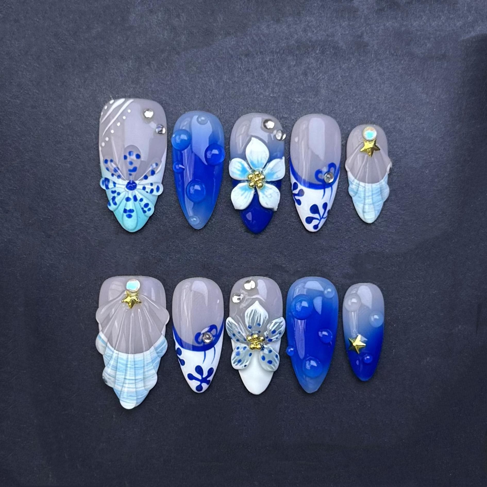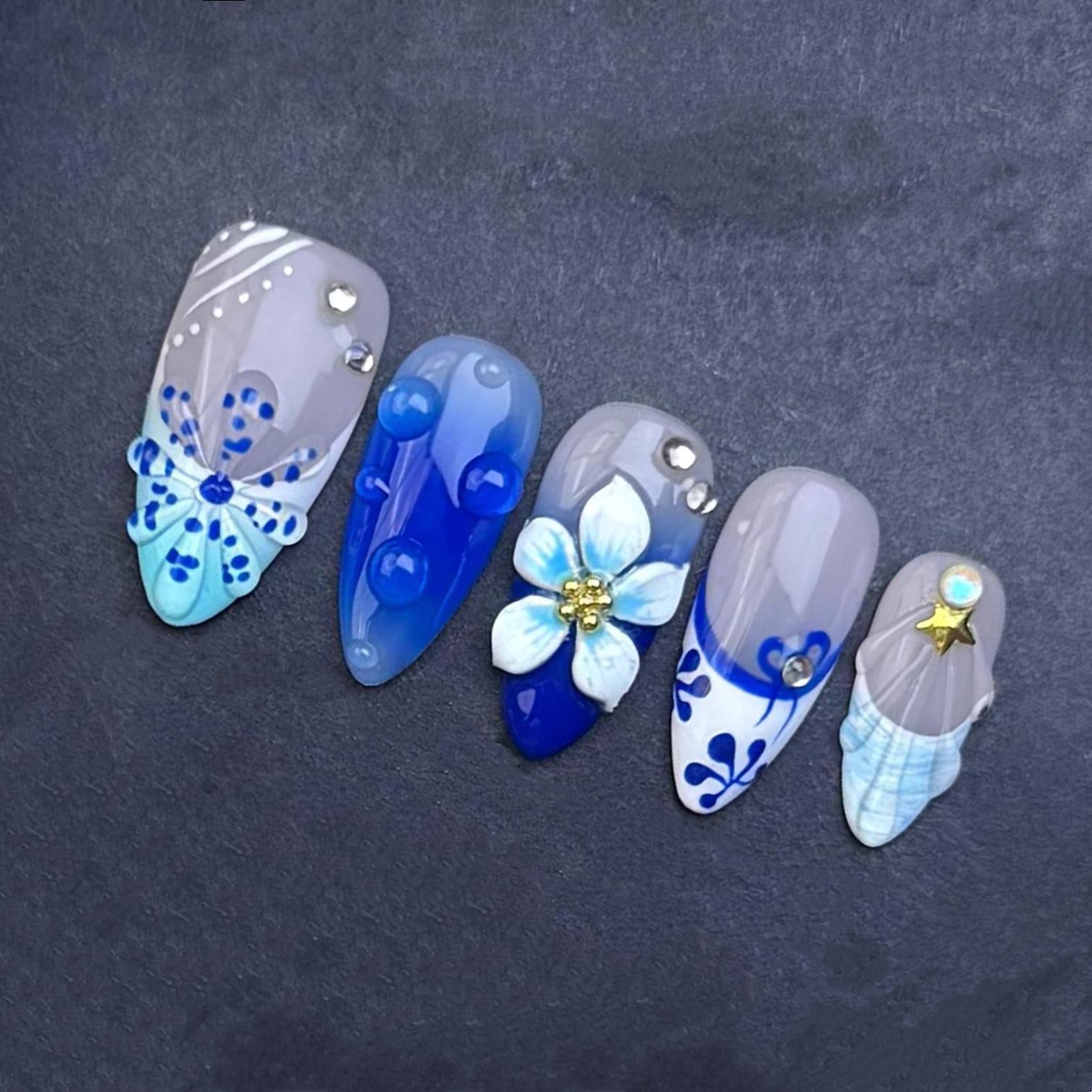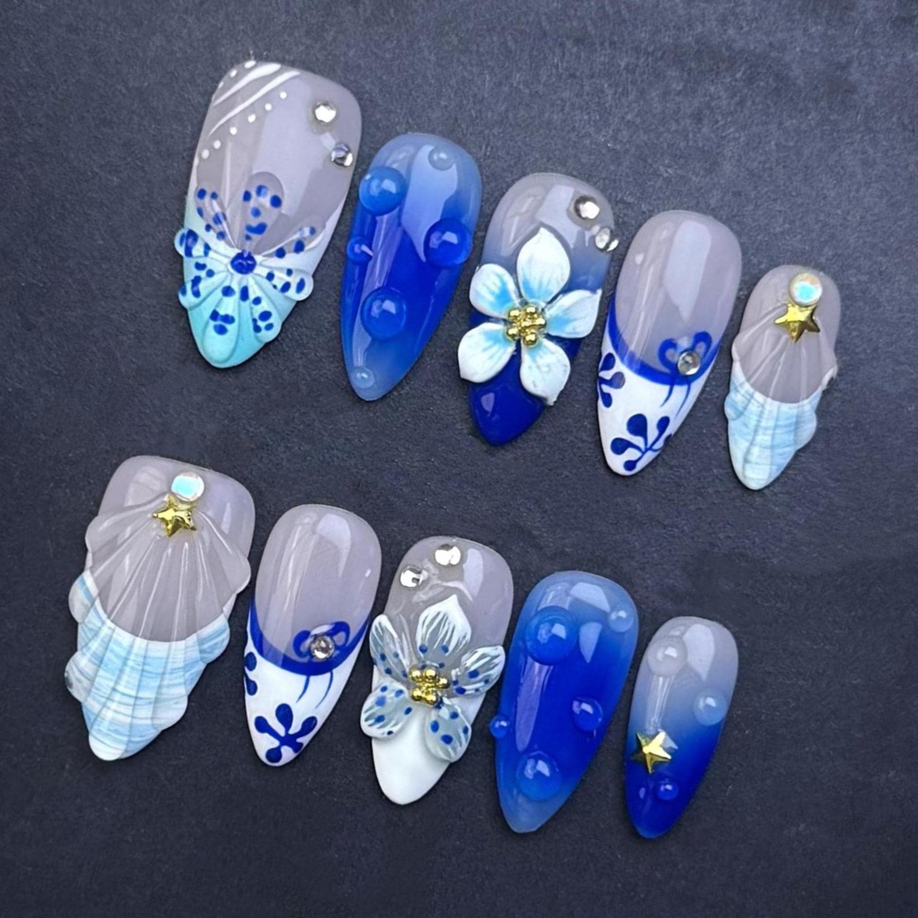 This press-on nail set captures the spirit of the ocean with a harmonious blend of marine blues, seashell accents, and delicate 3D floral art. Featuring a gradient of soft gray to vivid blue, each nail is individually adorned with sparkling rhinestones, embossed sea-themed textures, and miniature sculpted flowers. Detailed shell embellishments, star charms, and underwater bubble effects create a dreamy, mermaid-inspired look perfect for summer getaways, beach weddings, or coastal vacations. The combination of matte and glossy finishes elevates the luxurious feel, giving this set a refined, handcrafted finish with coastal charm.