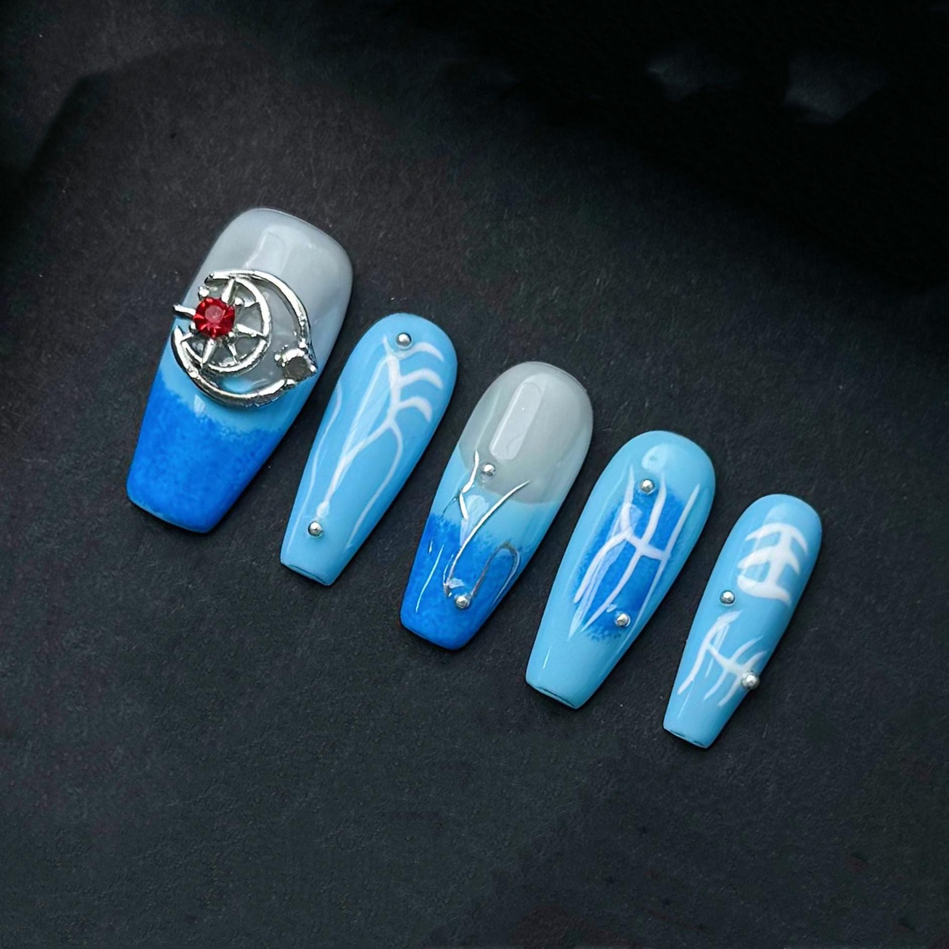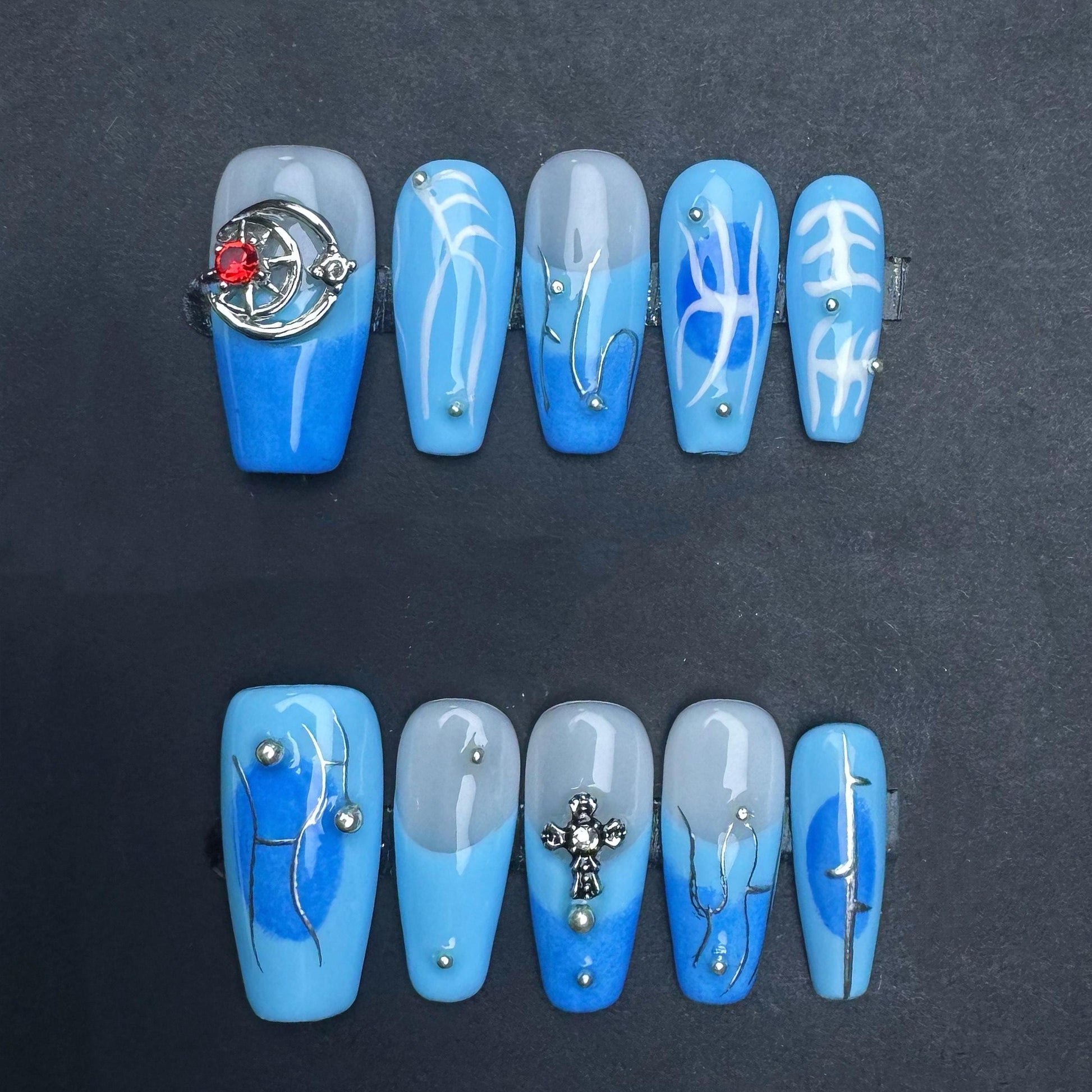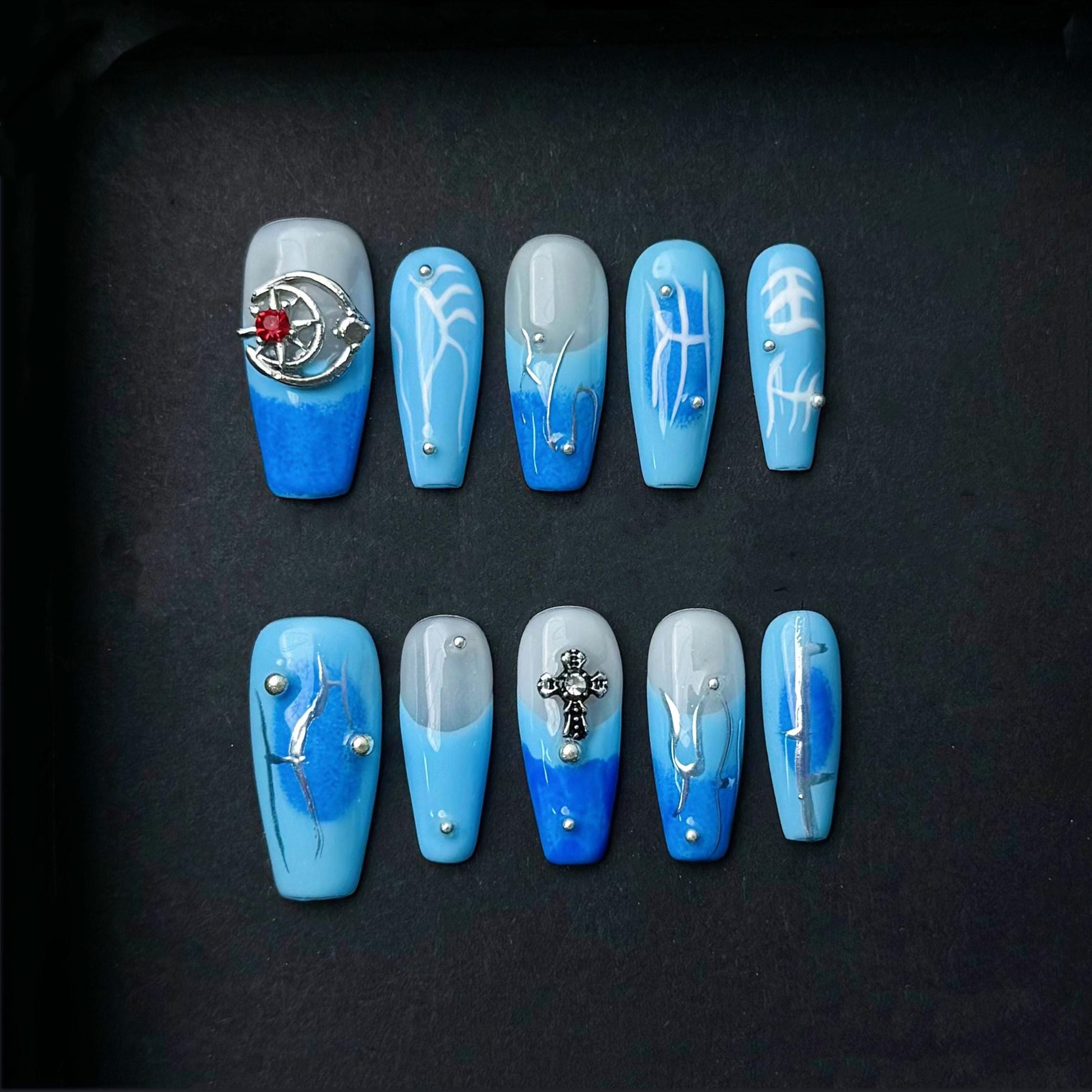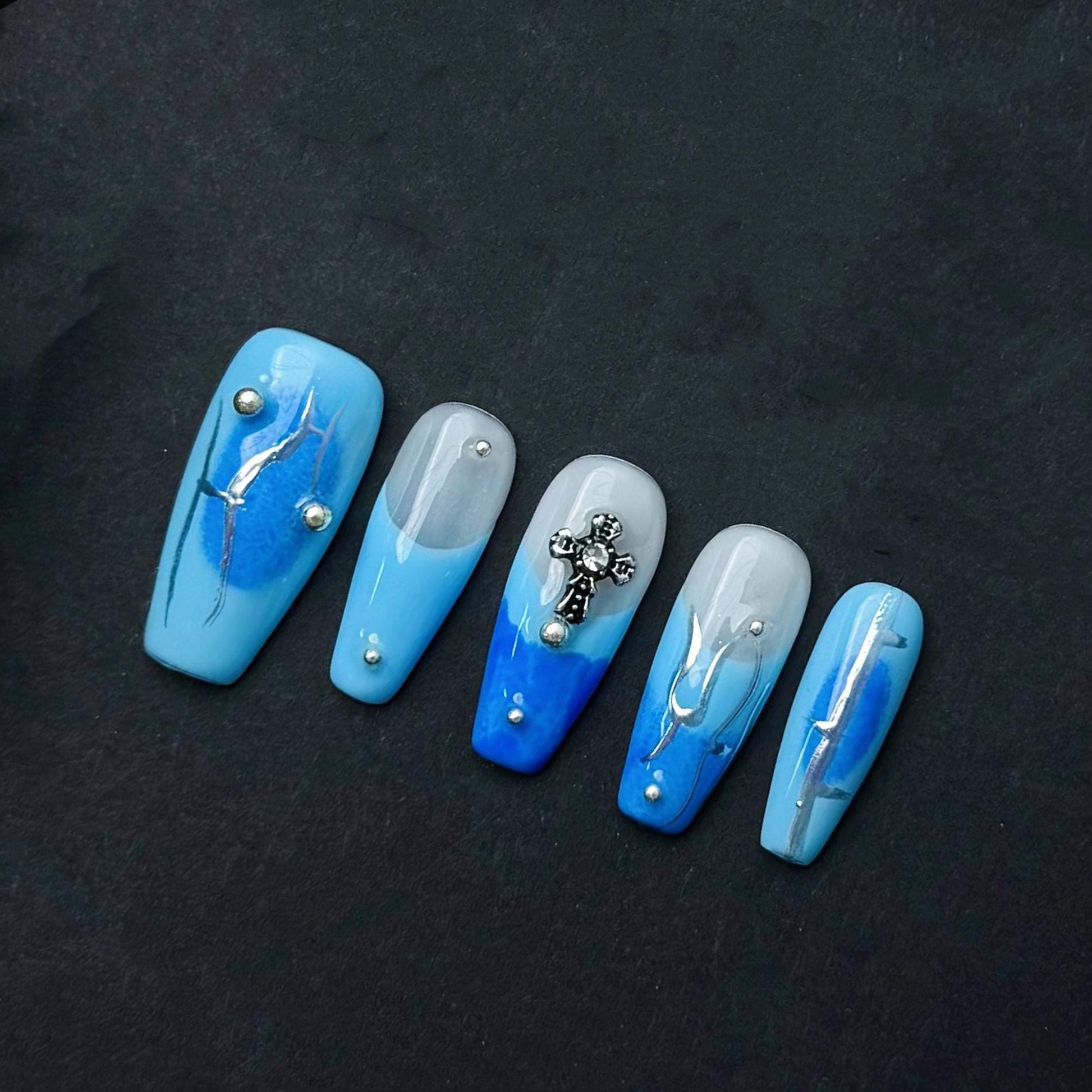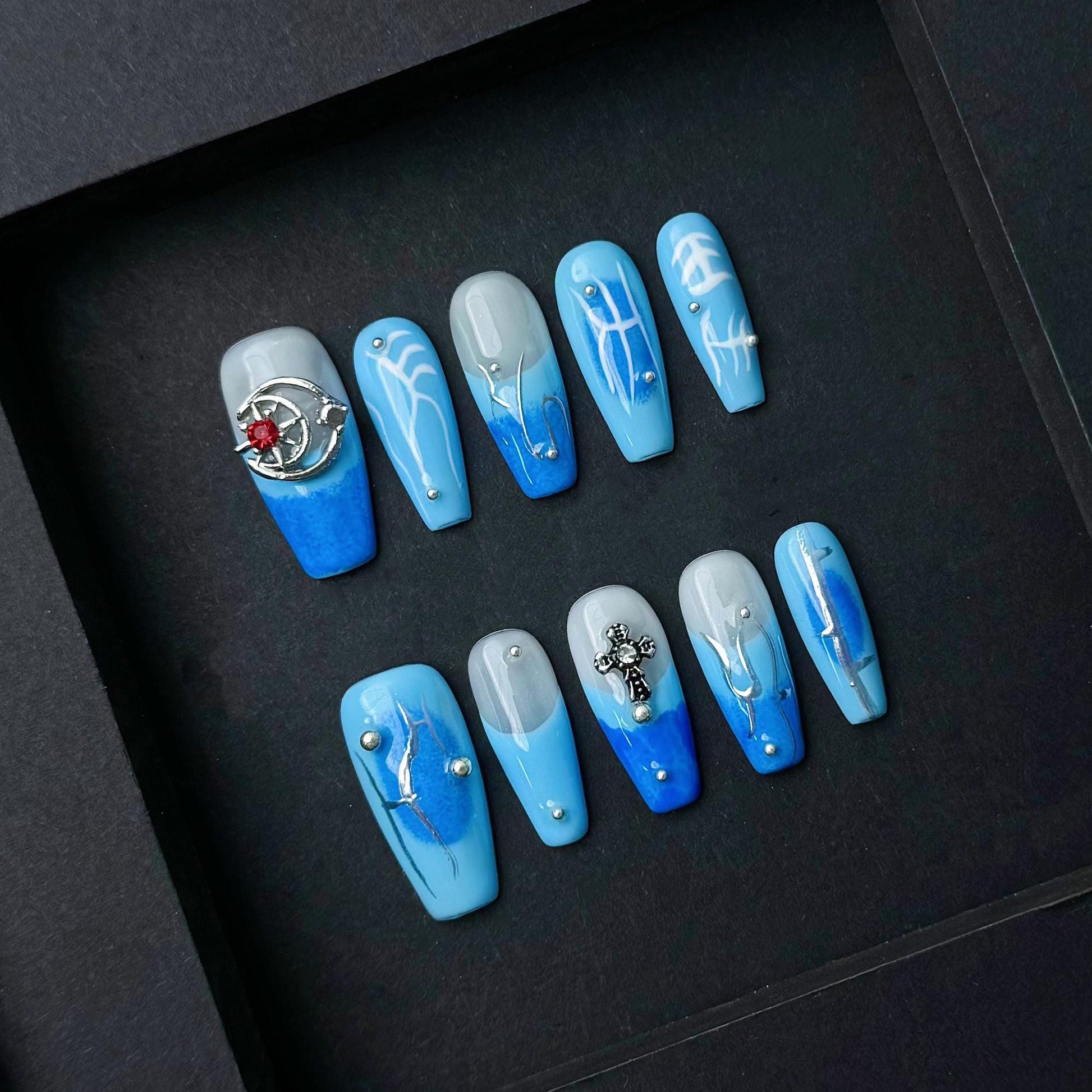Dive into an edgy nautical fantasy with these long coffin-shaped press-on nails. Featuring a cool gradient of ocean blue and soft gray, each nail is hand-decorated with gothic and celestial accents like metallic crosses, compass-inspired charms, and abstract skeletal linework. Thin silver wires and delicate studs add dimension and shimmer, while the matte and glossy finishes contrast beautifully for a bold and mysterious look. Whether you're channeling sea siren energy or just love standout nail art, this set blends marine magic with gothic glam perfectly.