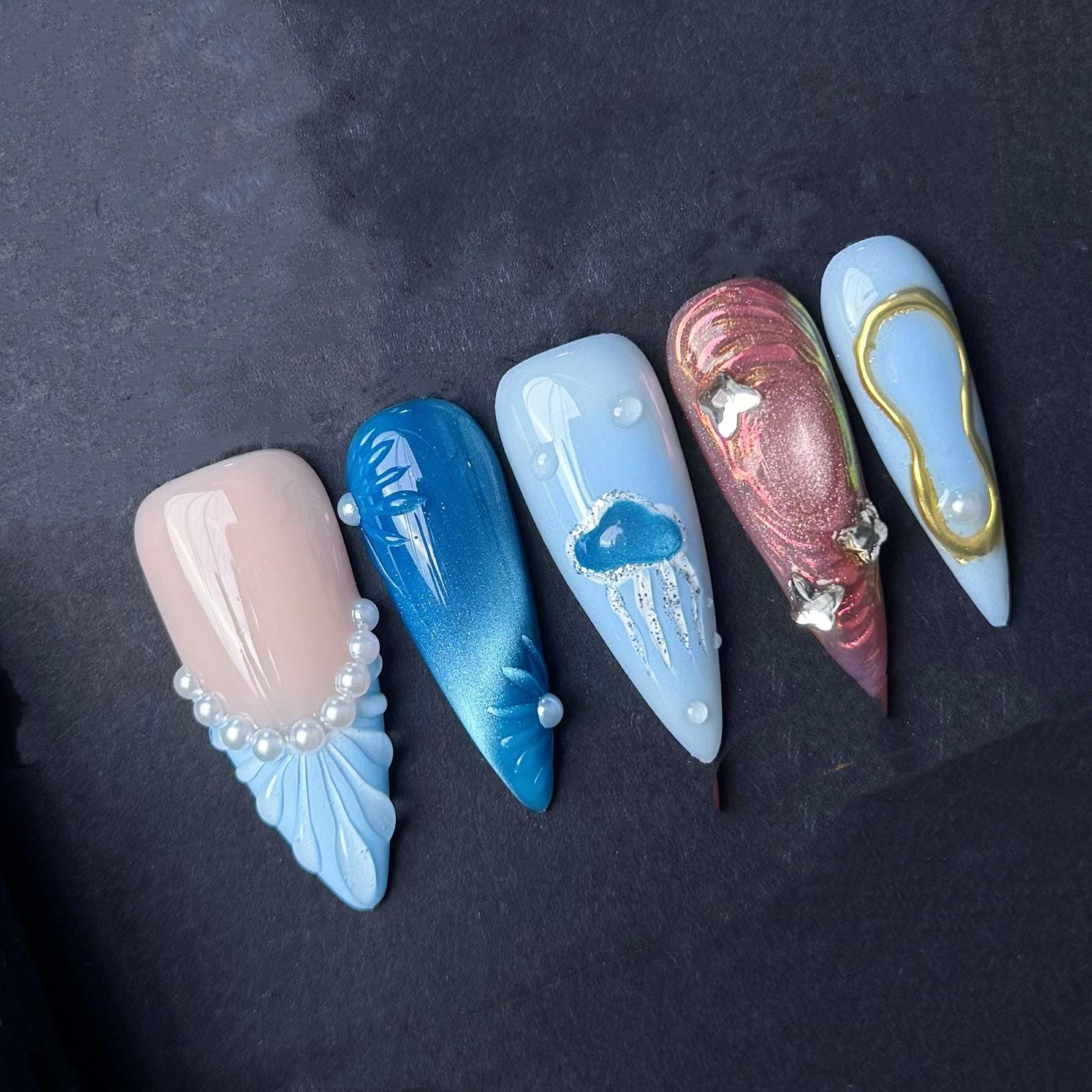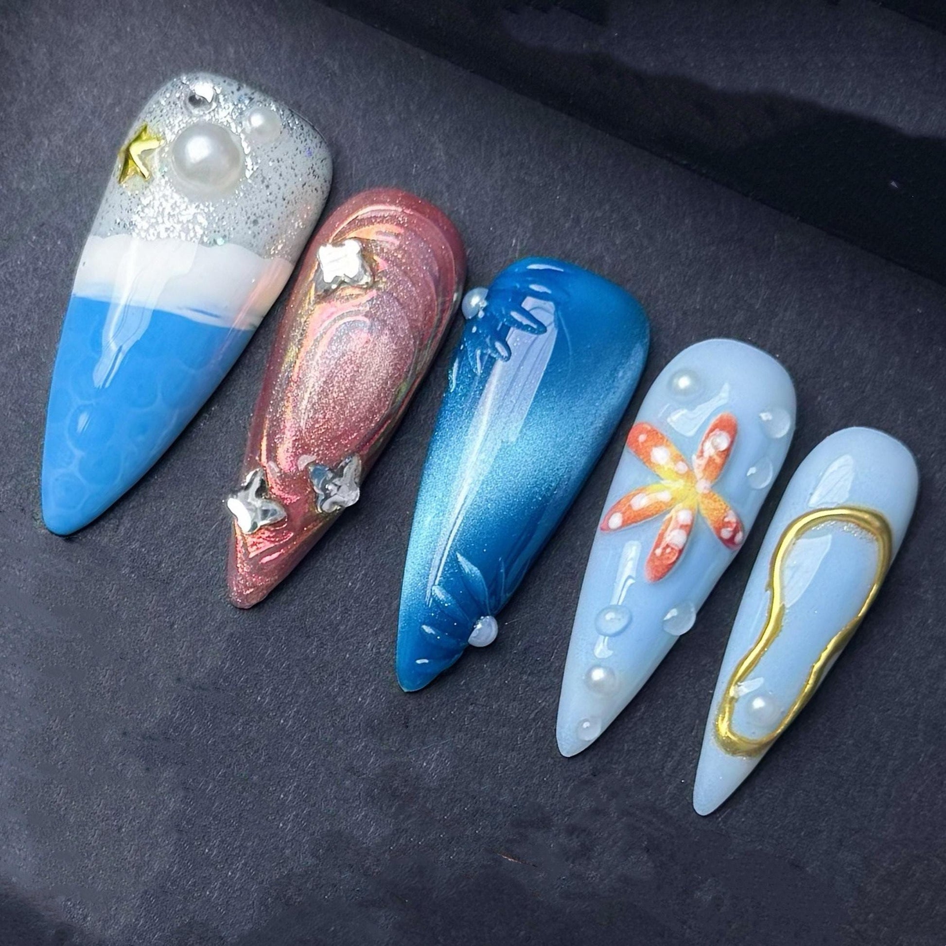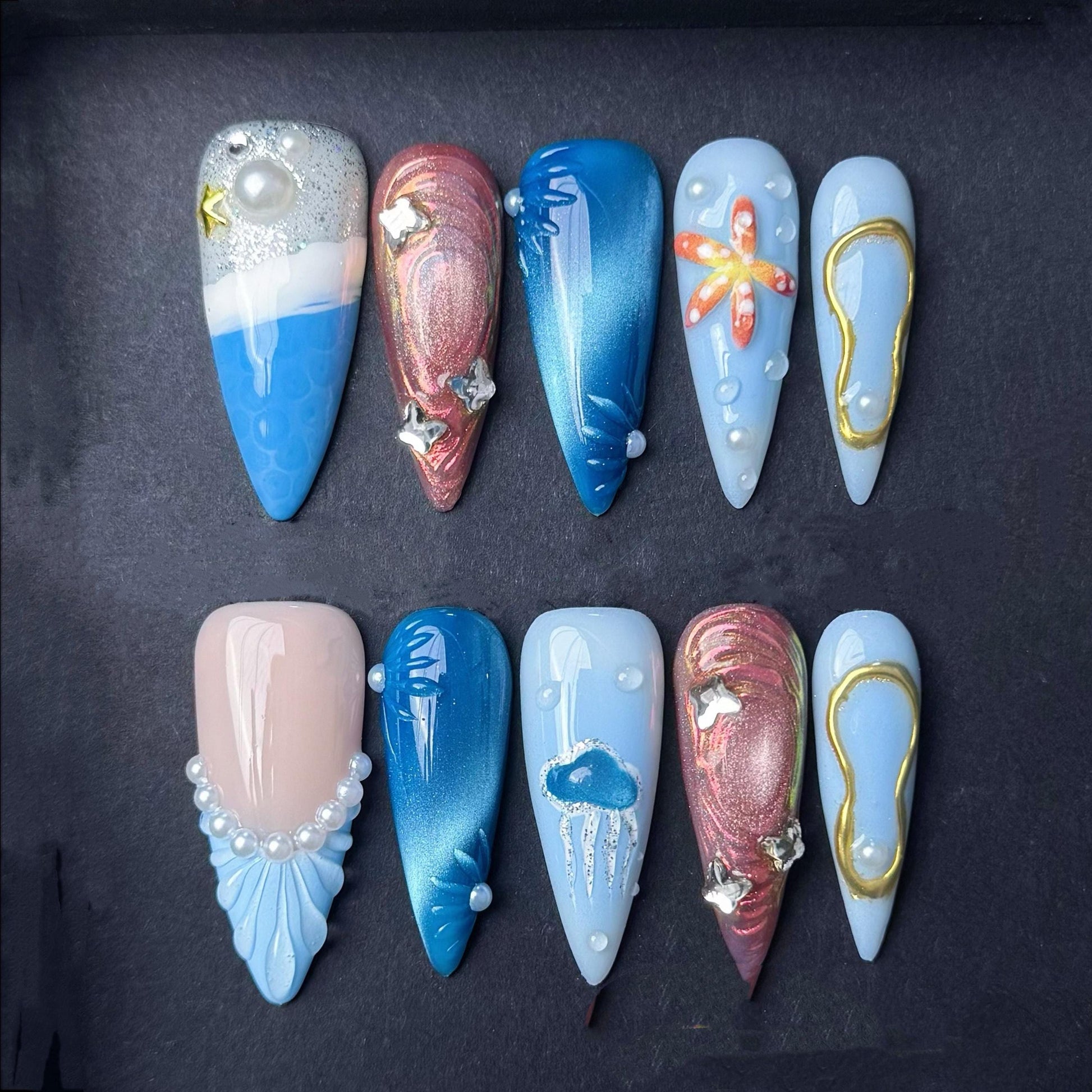 Dive into dreamy undersea vibes with this ocean-themed press-on nail set, featuring pearlescent seashells, 3D jellyfish art, glimmering starfish, and ocean wave accents in soft blue, shimmer pink, and deep sea tones. A whimsical look perfect for beach lovers and mermaid souls.