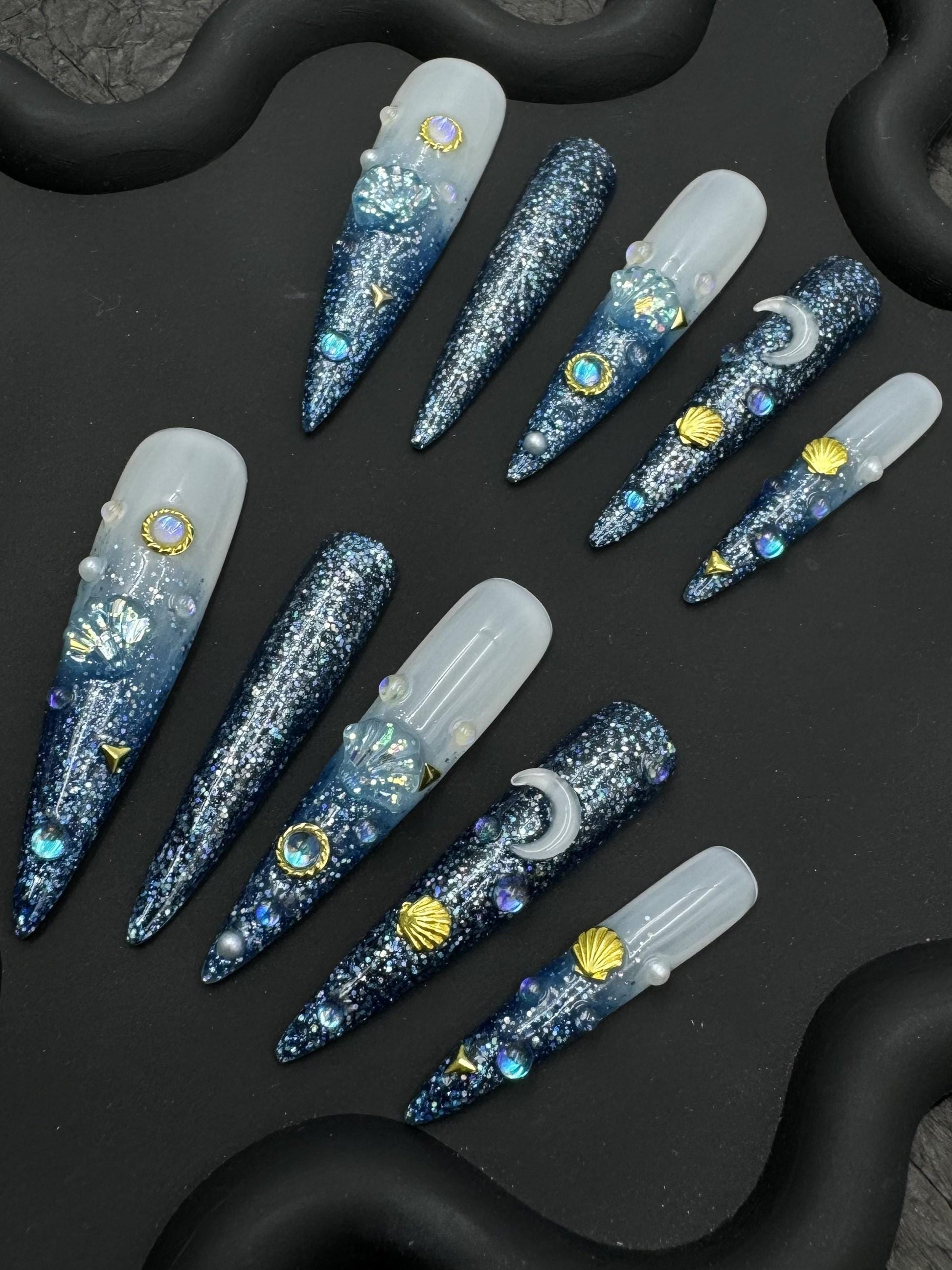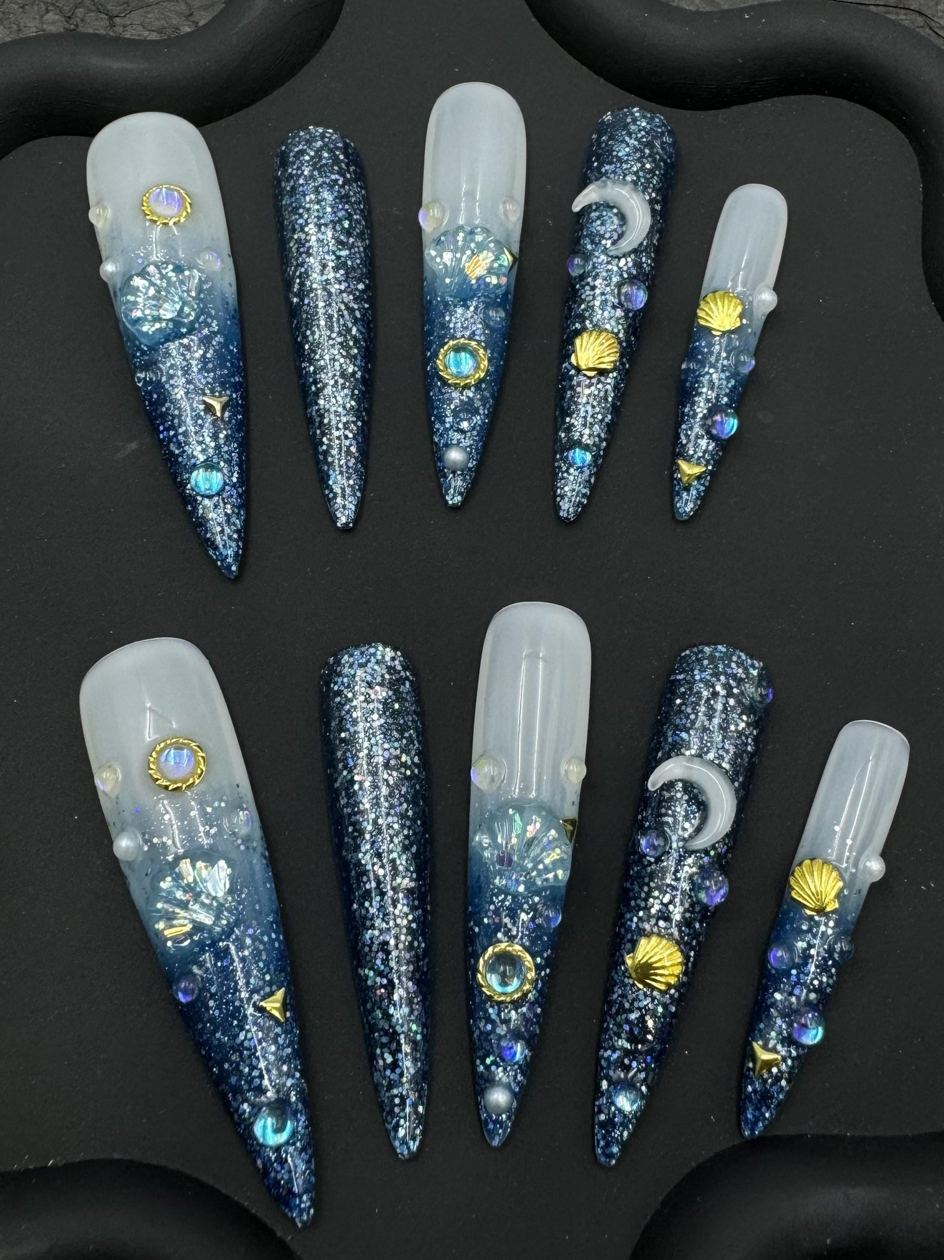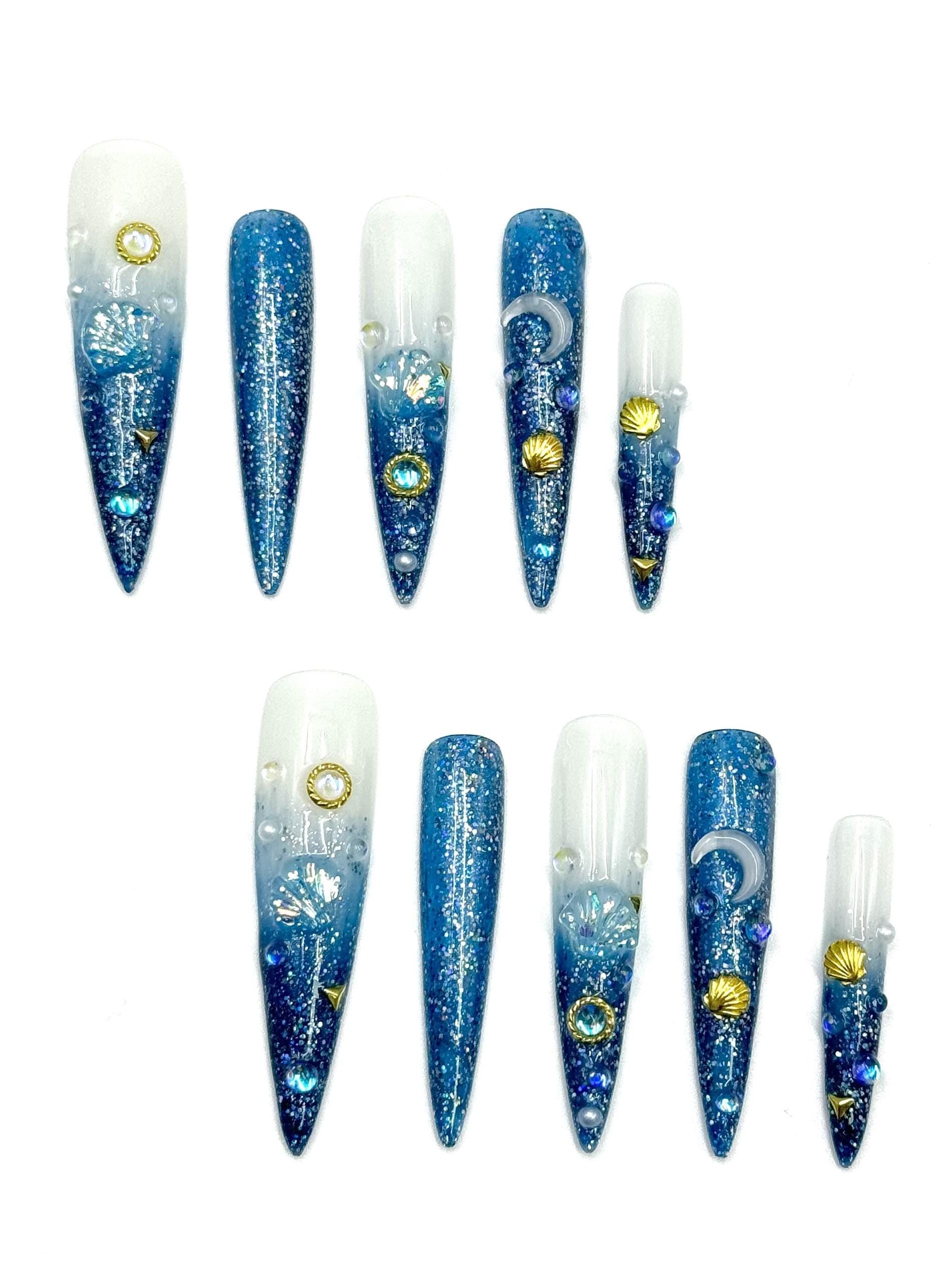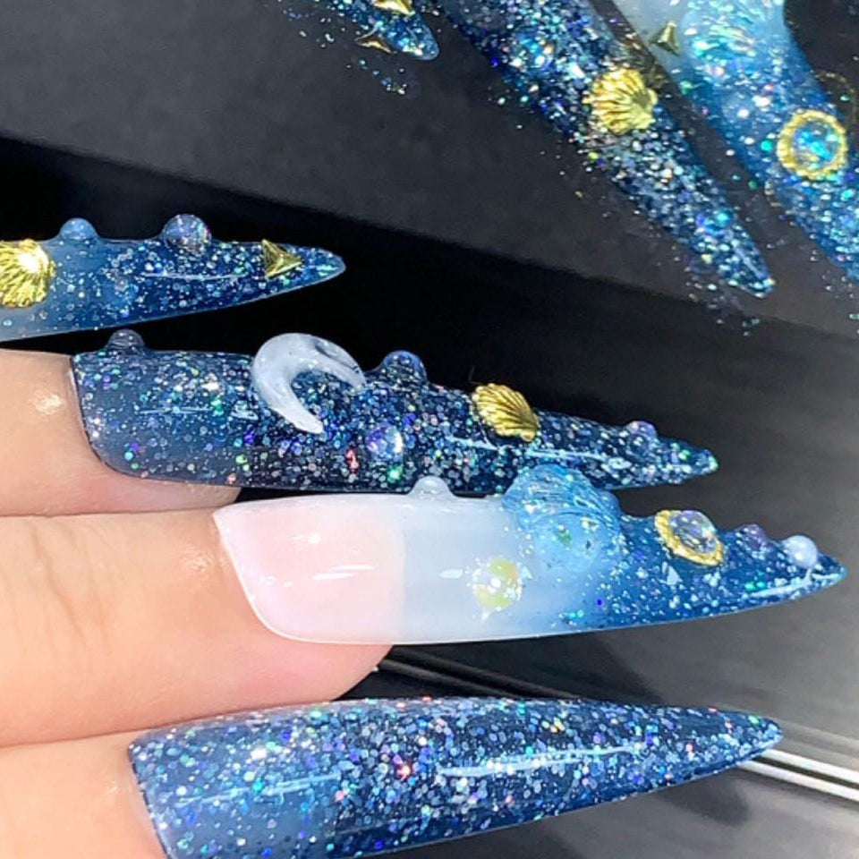 Dive into celestial seas with this stunning mermaidcore-inspired press-on nail set! Featuring a sparkling blue-to-white ombré base, this long stiletto design is adorned with glitter, 3D seashells, moons, and gold accents for an enchanting under-the-sea meets outer space vibe. Perfect for summer glam, festivals, or fantasy lovers.