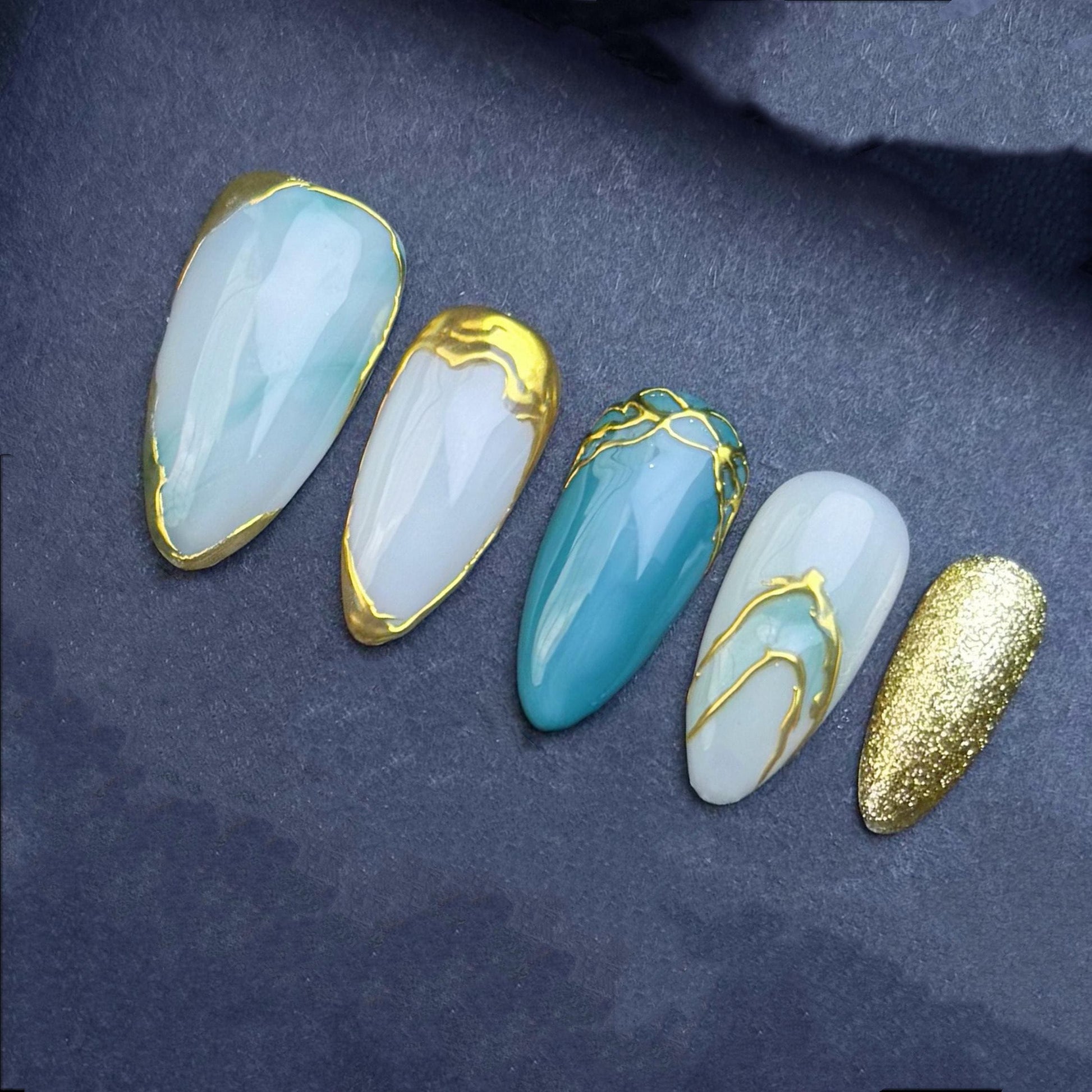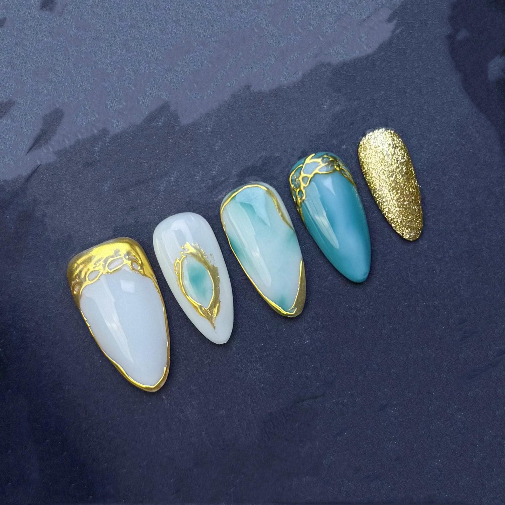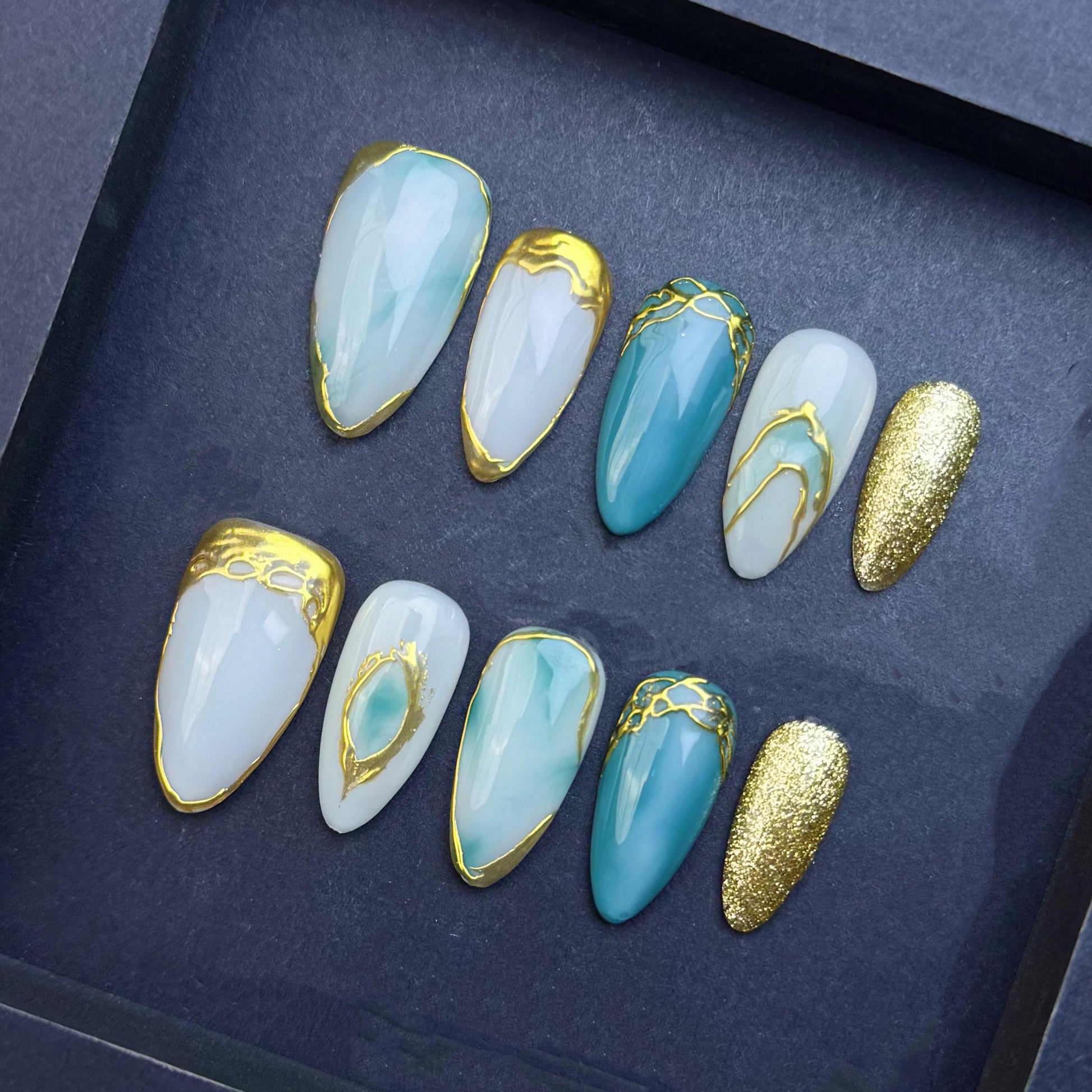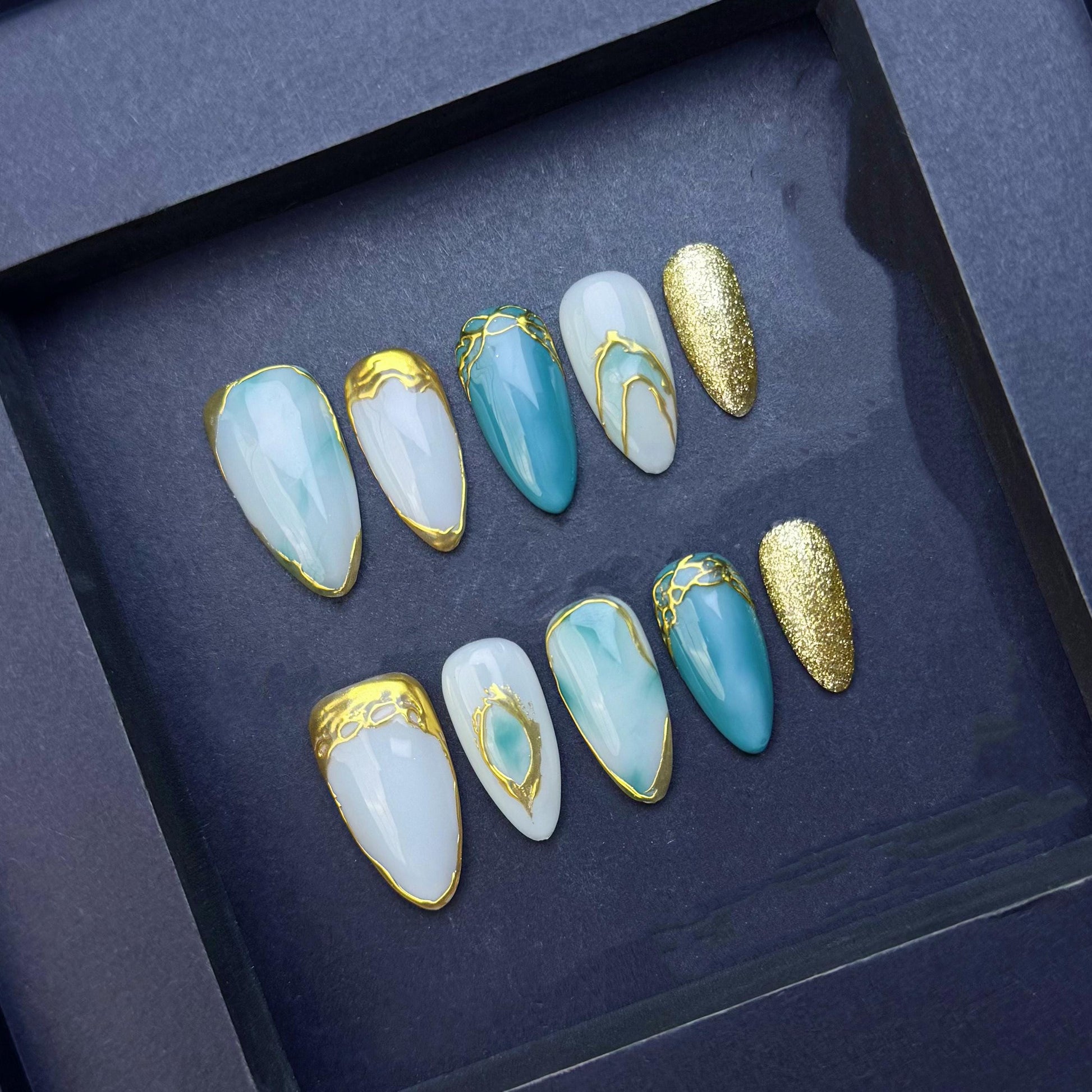 Dive into coastal elegance with this luxurious set of press on nails inspired by ocean gemstones. Featuring marbled aqua and white tones, each nail is adorned with hand-painted gold foil detailing and finished with rich gold glitter accents. The unique blend of shimmering textures and fluid stone-like patterns creates a classy and artistic look. Perfect for special occasions, beach events, or anytime you want your nails to shine like polished jewels. Reusable and made with salon-quality gel.