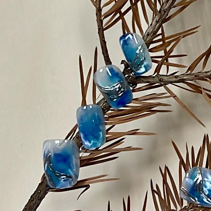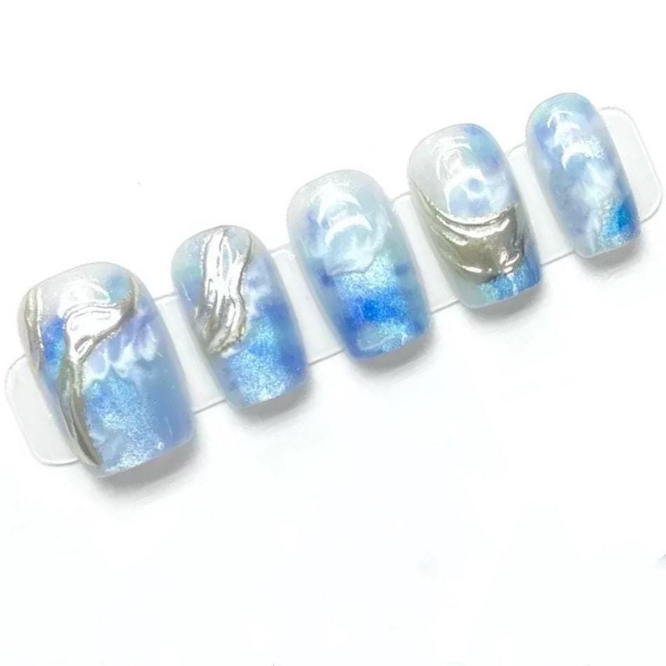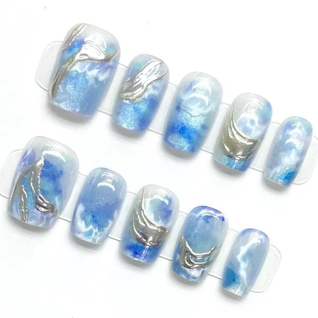 Dive into a dreamy ocean vibe with these blue marble press-on nails, featuring swirling waves of pearlized blue and white with raised silver accents for a flowing, water-like effect. The glossy finish and subtle shimmer give a gel-style look without the salon time. Each nail mimics ocean currents and sky reflections, perfect for a coastal escape aesthetic or a tranquil, elegant vibe. Easy to apply and reusable, these nails are both modern and soothing—great for everyday wear or special beachy occasions.