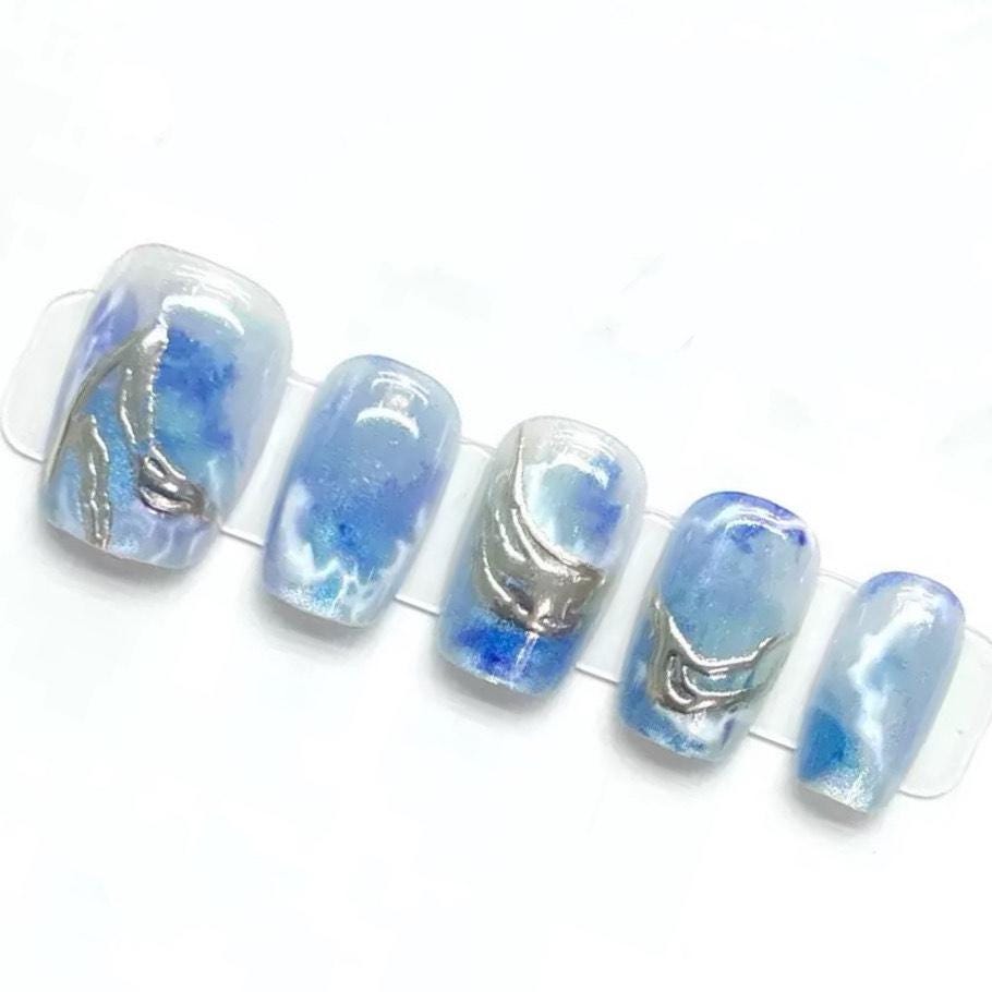 Ocean Swirl Blue Marble Press-On Nails with Silver Wave Accents. Artificial reusable fake glue on faux manicure nails trendy art.