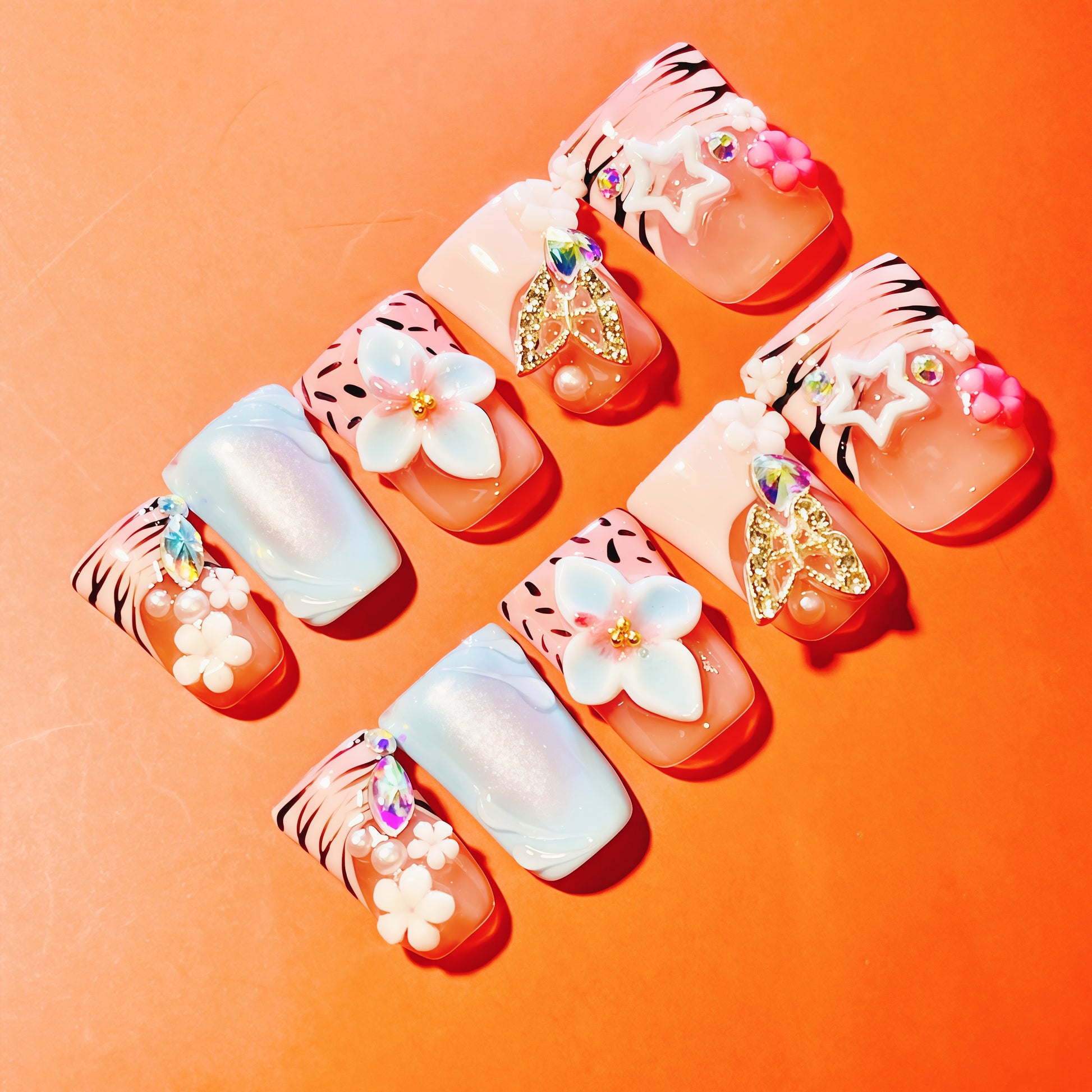 Each nail is hand-crafted with premium gel, layered detailing, and high-shine top coat to create a luxury finish that looks salon-perfect. The combination of kawaii florals, shimmering gemstones, and sweet star charms makes this set ideal for anyone who loves soft, feminine, yet eye-catching nail art.