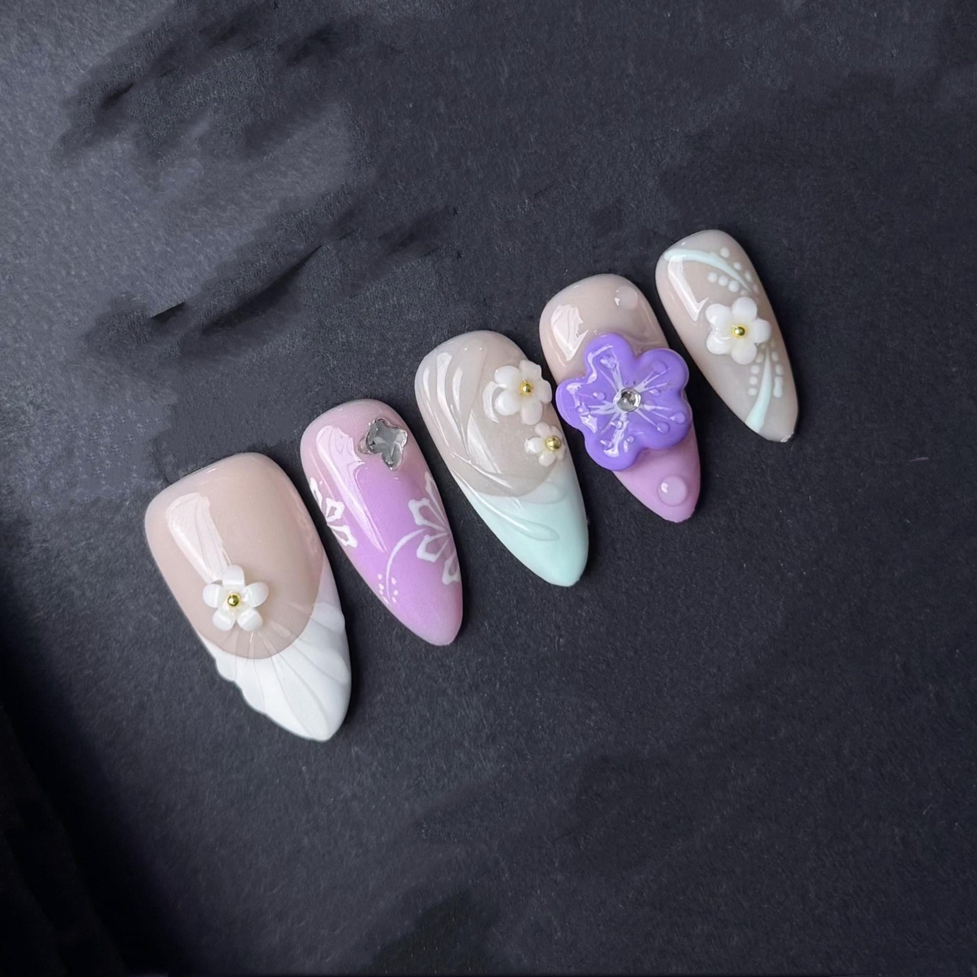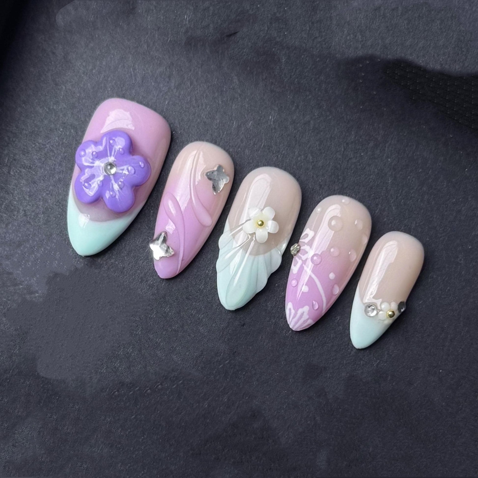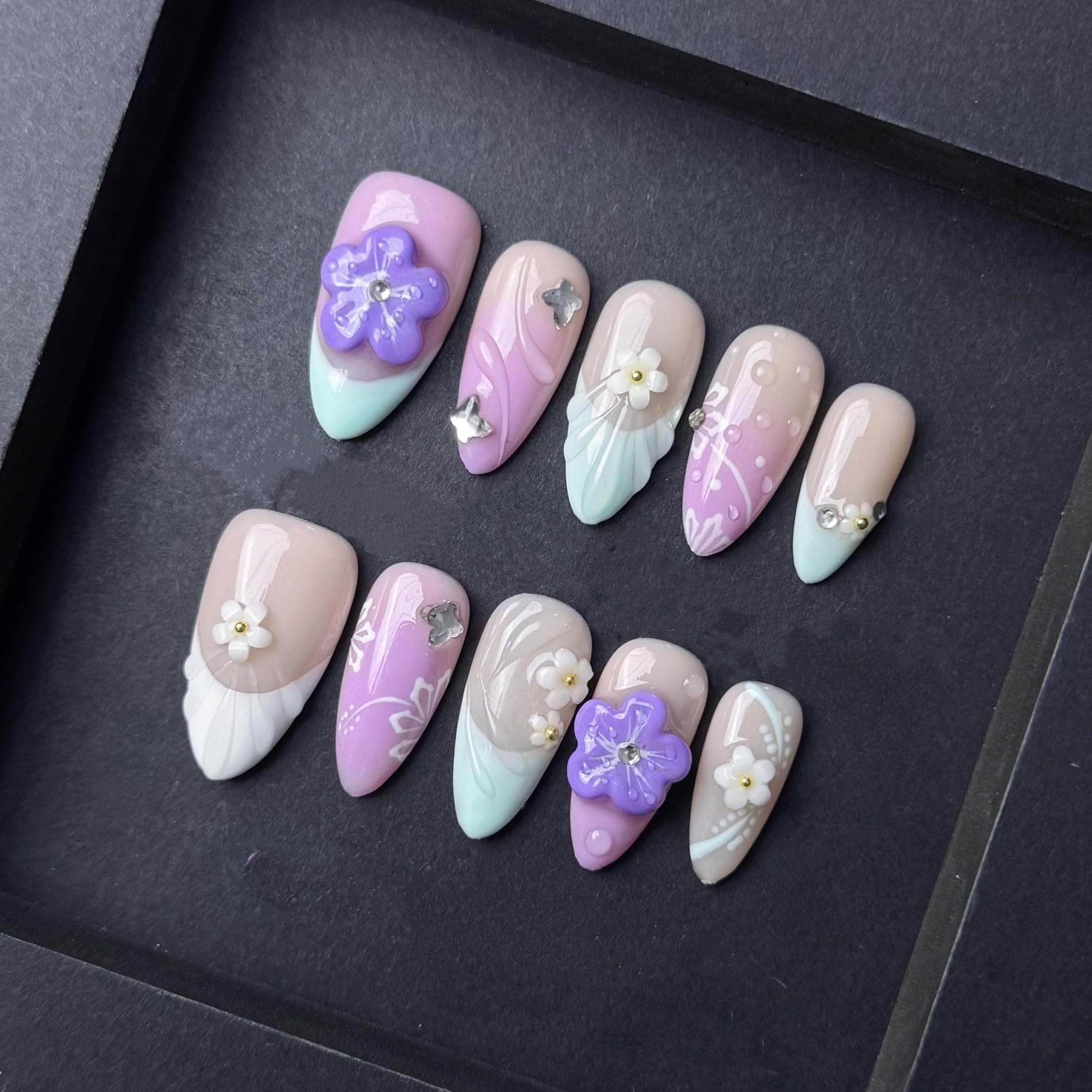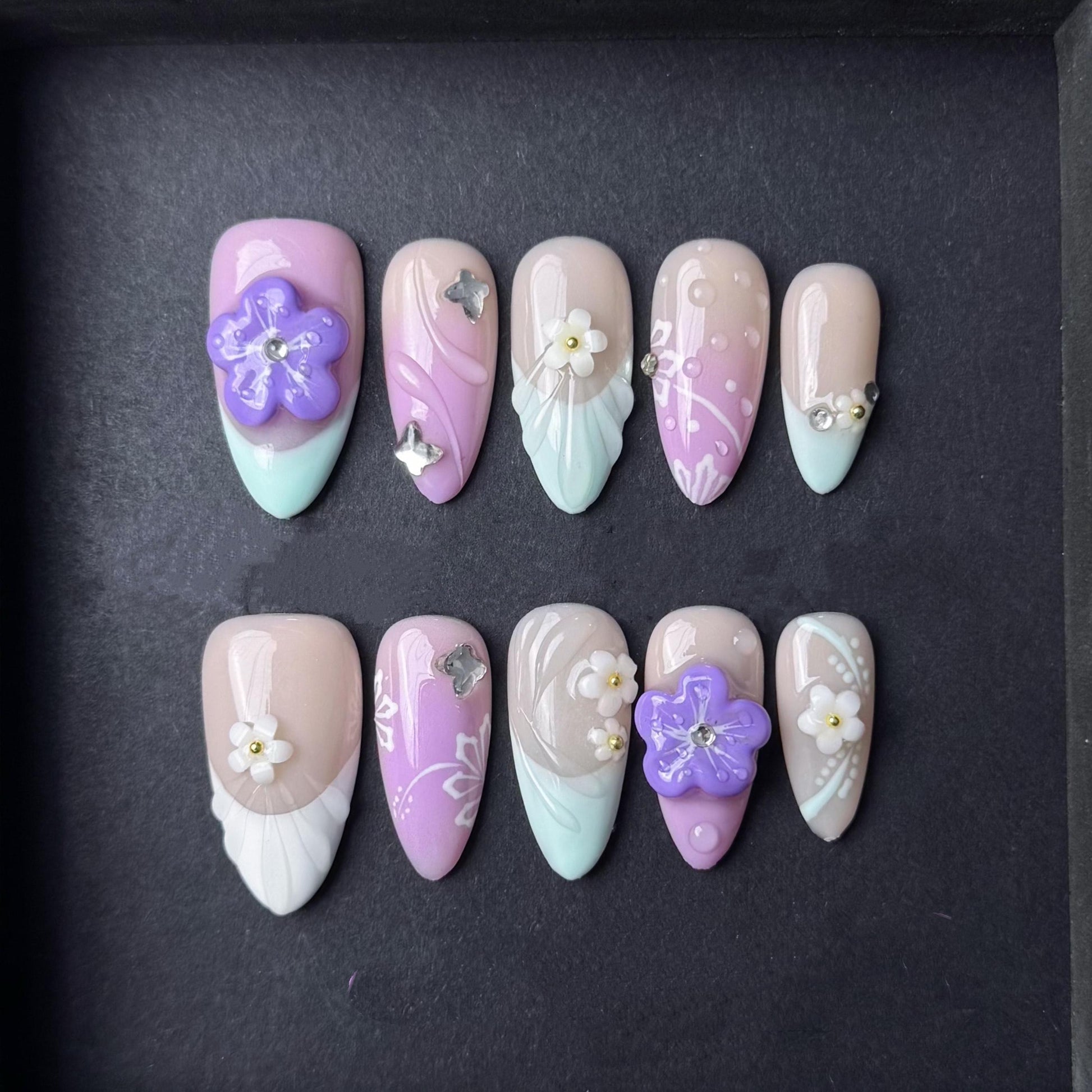 This enchanting pastel press on nail set features a soft mix of pink mint and nude tones adorned with 3D purple flowers mini white blossoms and silver butterfly charms. Elegant swirls and dot details add a dreamy hand painted touch perfect for spring or garden party vibes. These gel press ons combine soft colors and cute elements for a playful yet graceful finish ideal for anyone who loves floral and whimsical designs. Reusable and handmade with love.