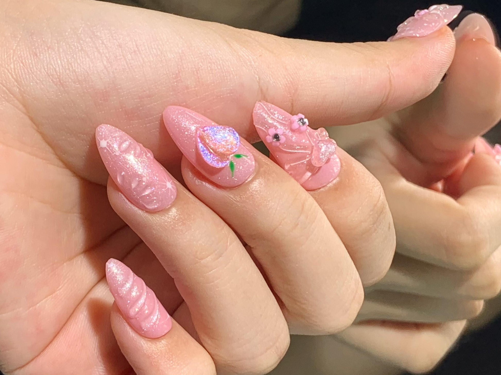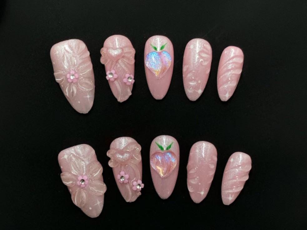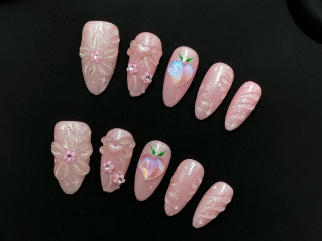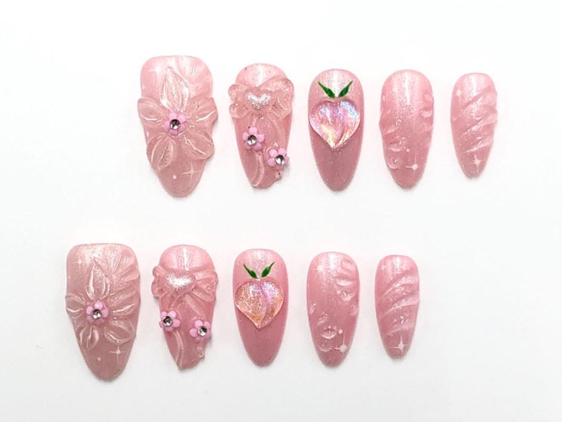 Peachy Pink 3D Jelly Nails – Kawaii Fruit & Floral Fantasy Press-On Set glue on artificial faux nails fruity holographic cute nail art