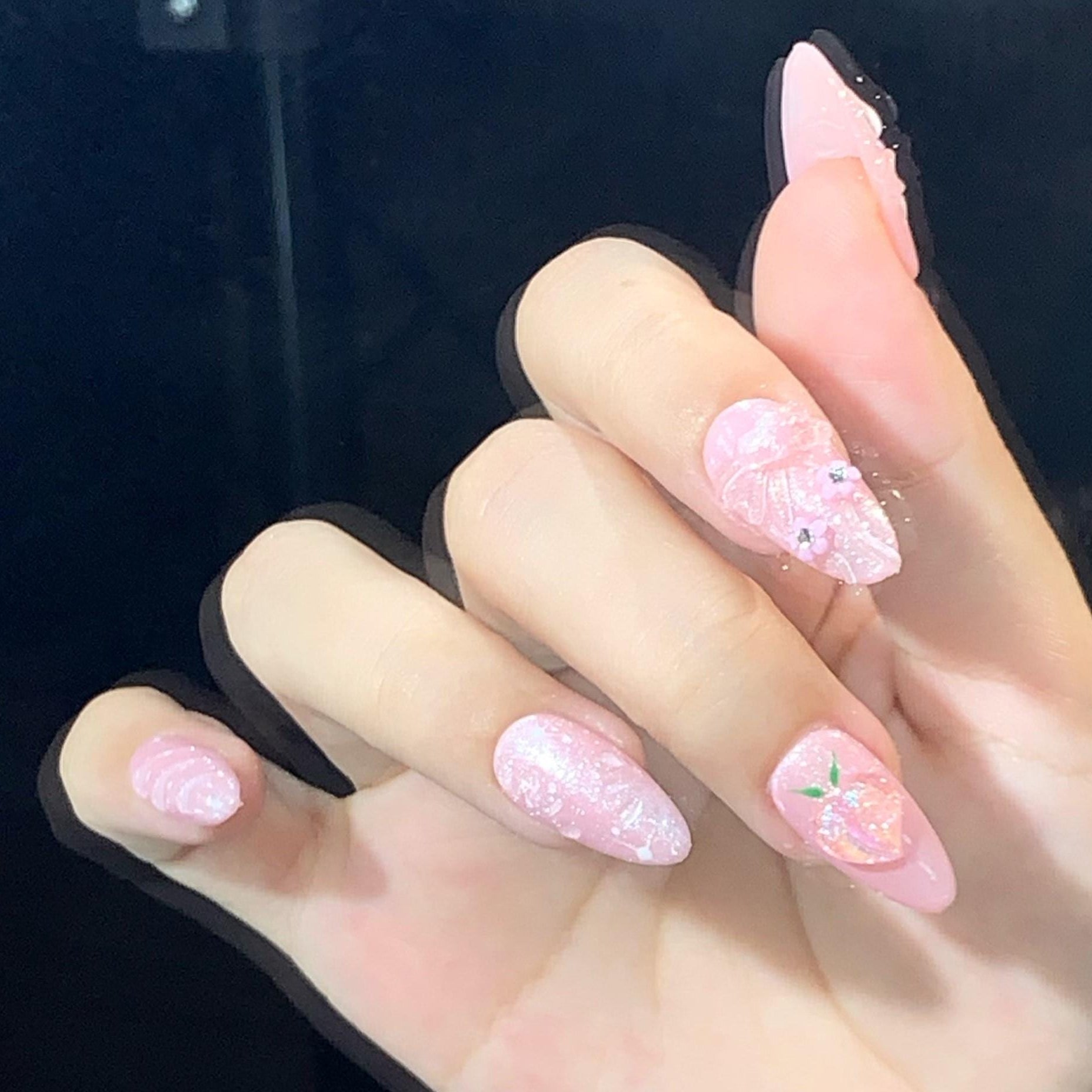 This adorable pink press-on nail set is bursting with charm, featuring glossy 3D jelly textures, soft sculpted florals, and a sparkly holographic peach accent nail. With pastel pink hues, cute bead details, and layered designs, this set is perfect for lovers of kawaii, fruity, or whimsical nail art aesthetics.