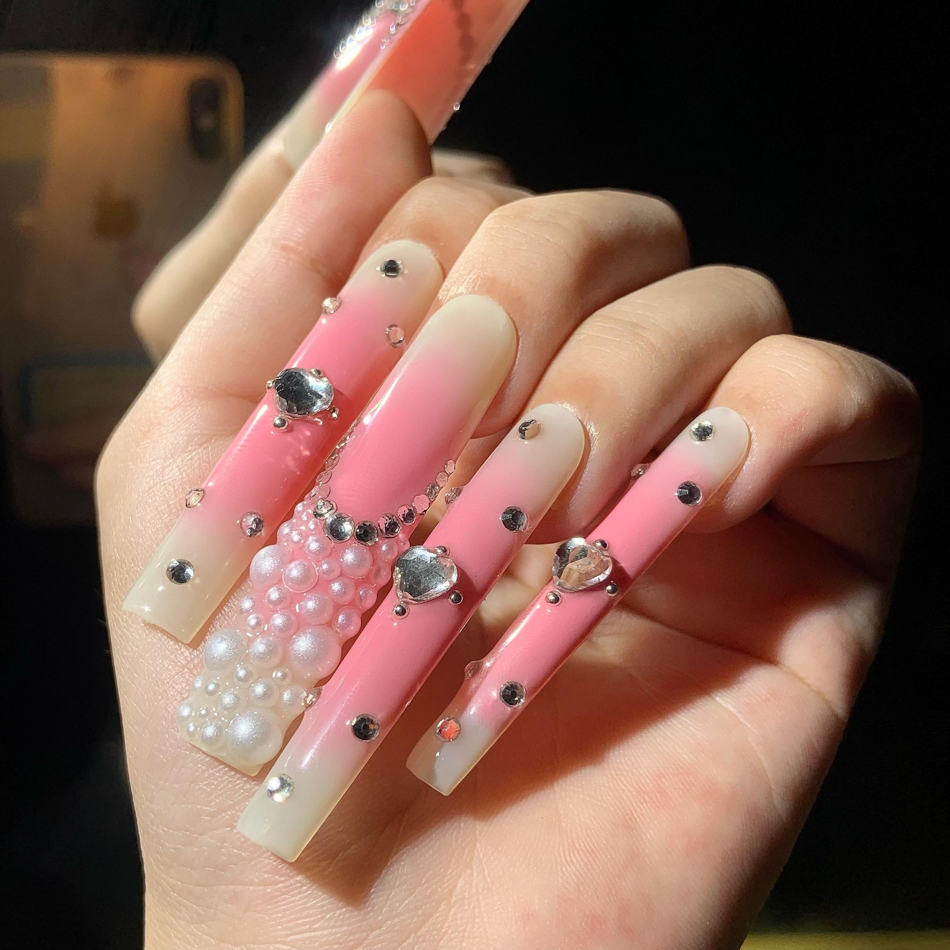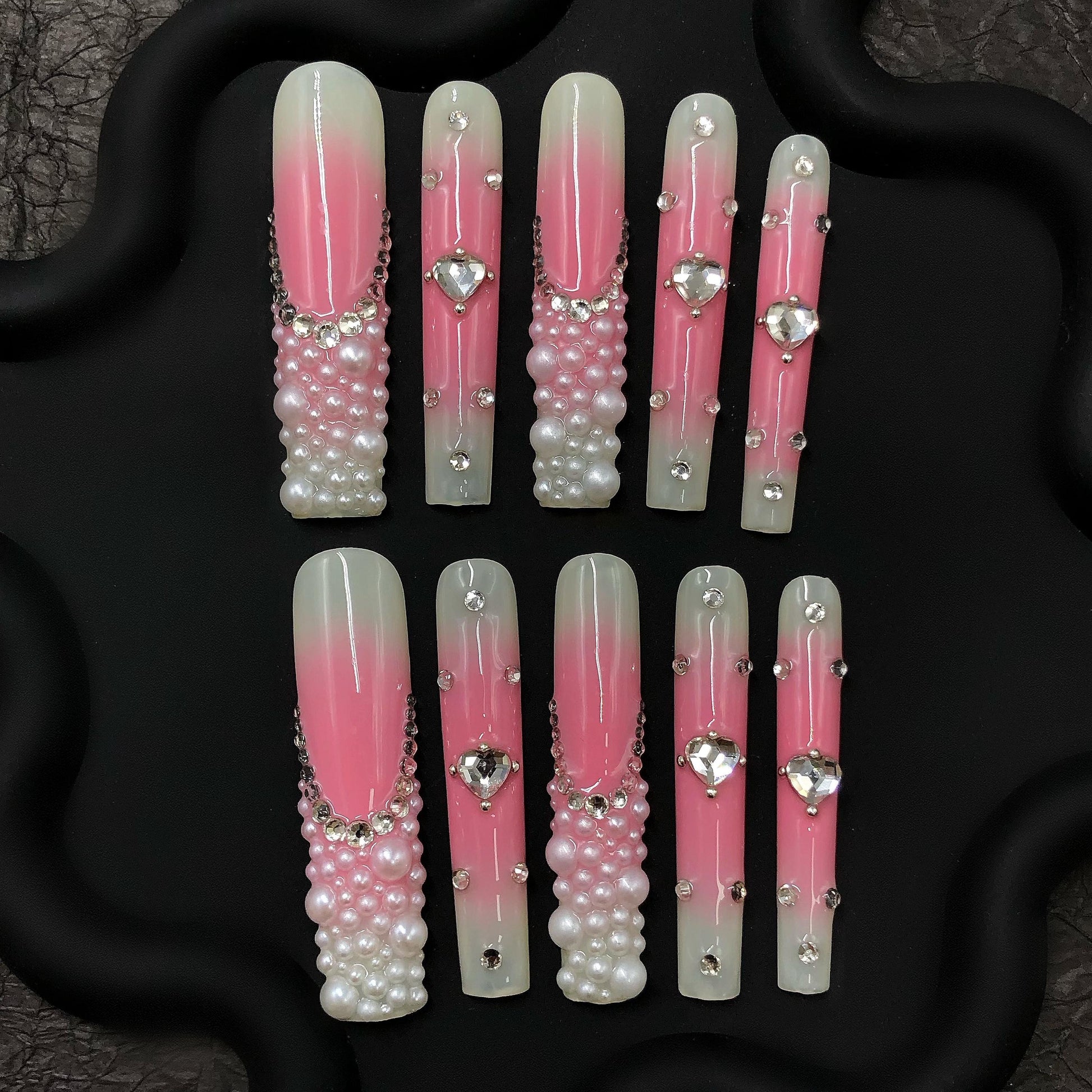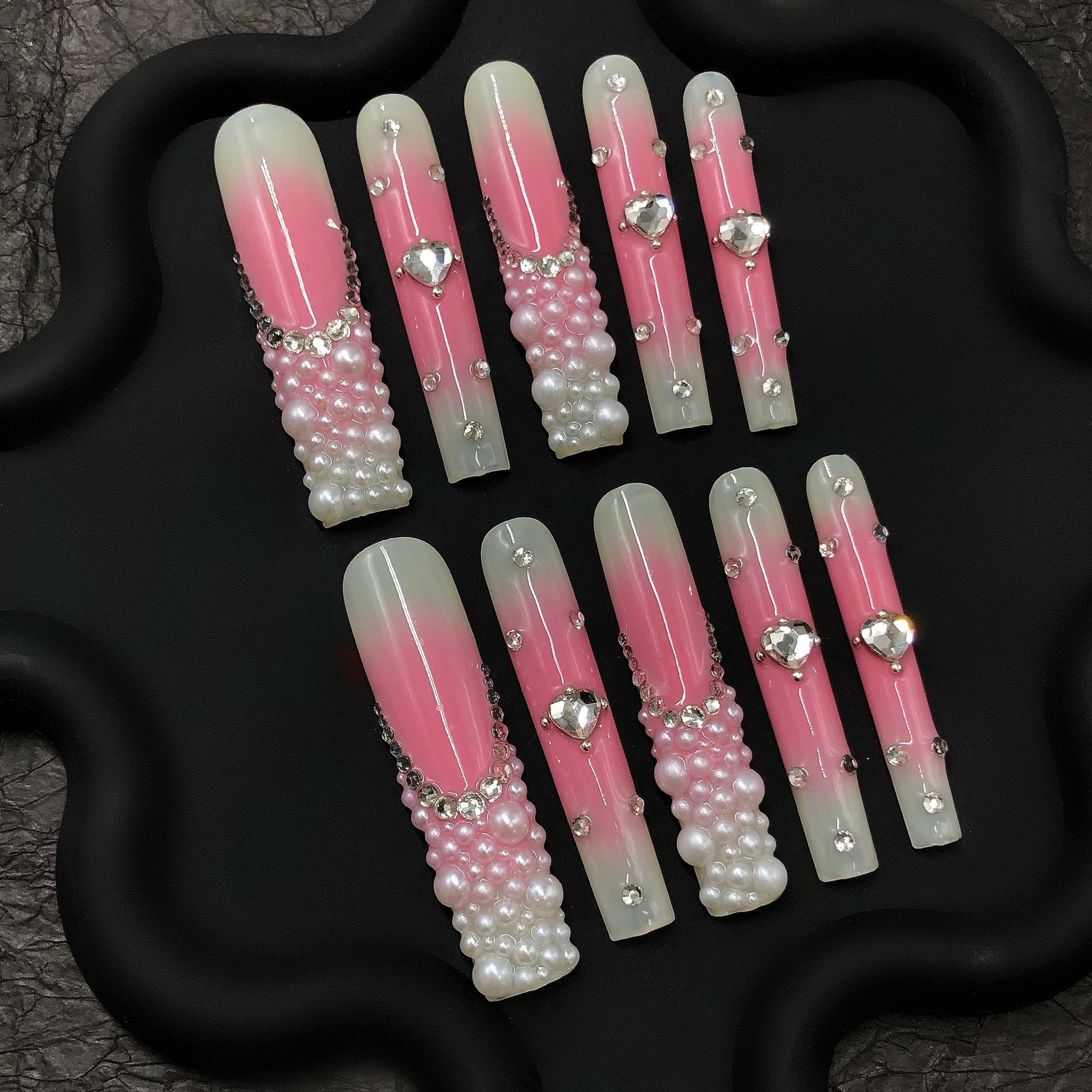These glamorous press-on nails feature a dreamy white-to-pink ombré base adorned with cascading pearl embellishments and sparkling rhinestones. With luxurious heart gems and elegant detailing, this long square nail set delivers a high-fashion, bridal or princess-inspired vibe—perfect for weddings, photo shoots, or any ultra-glam occasion.