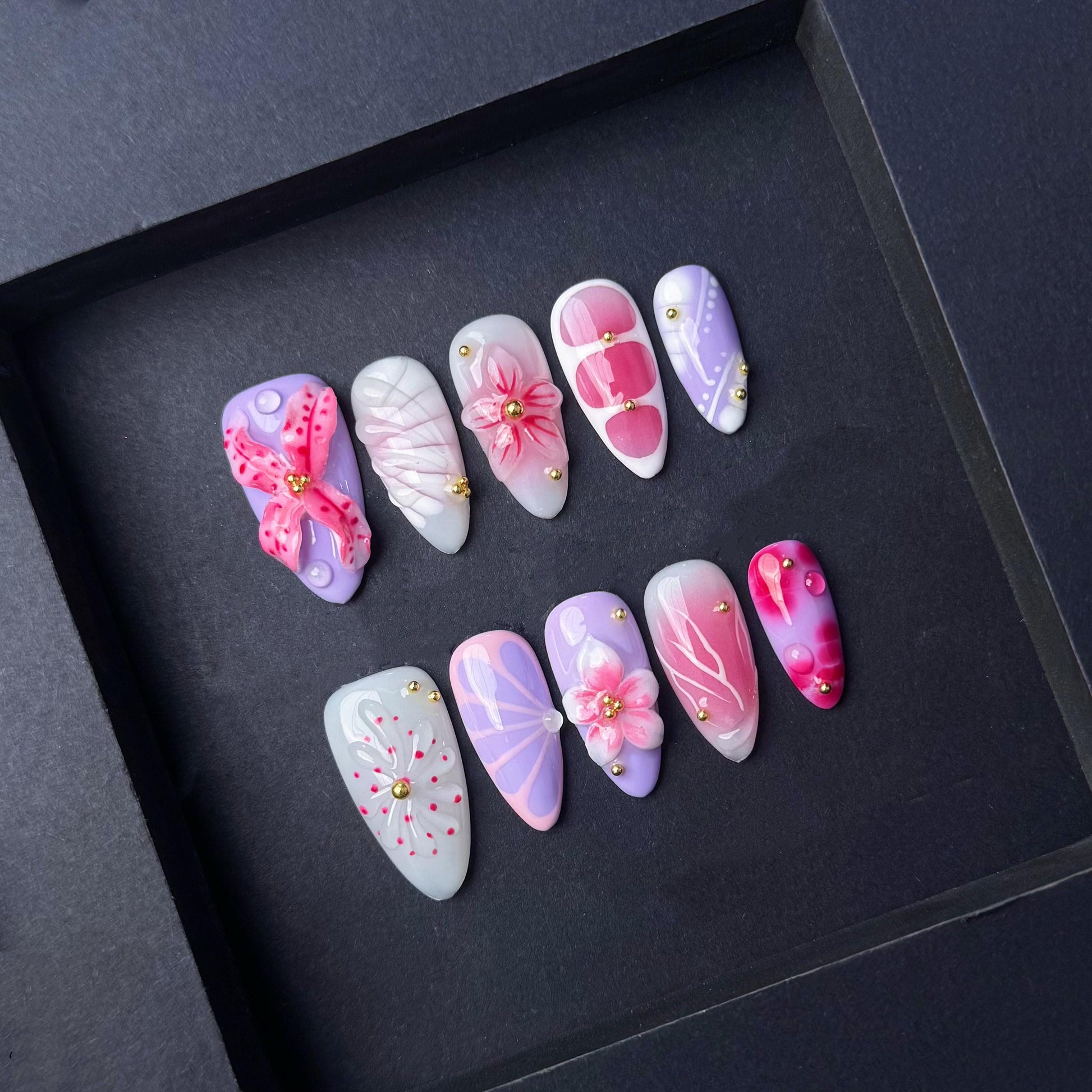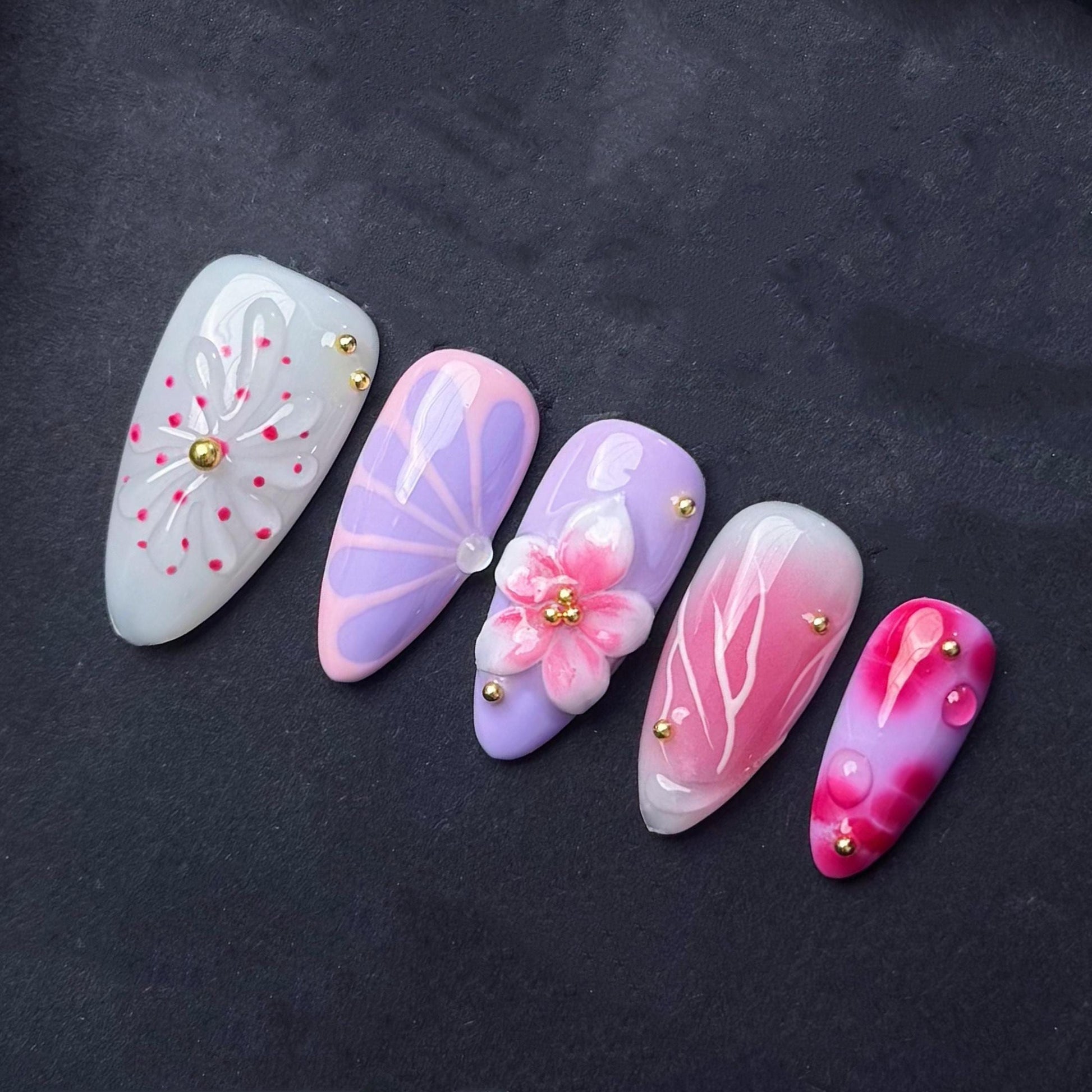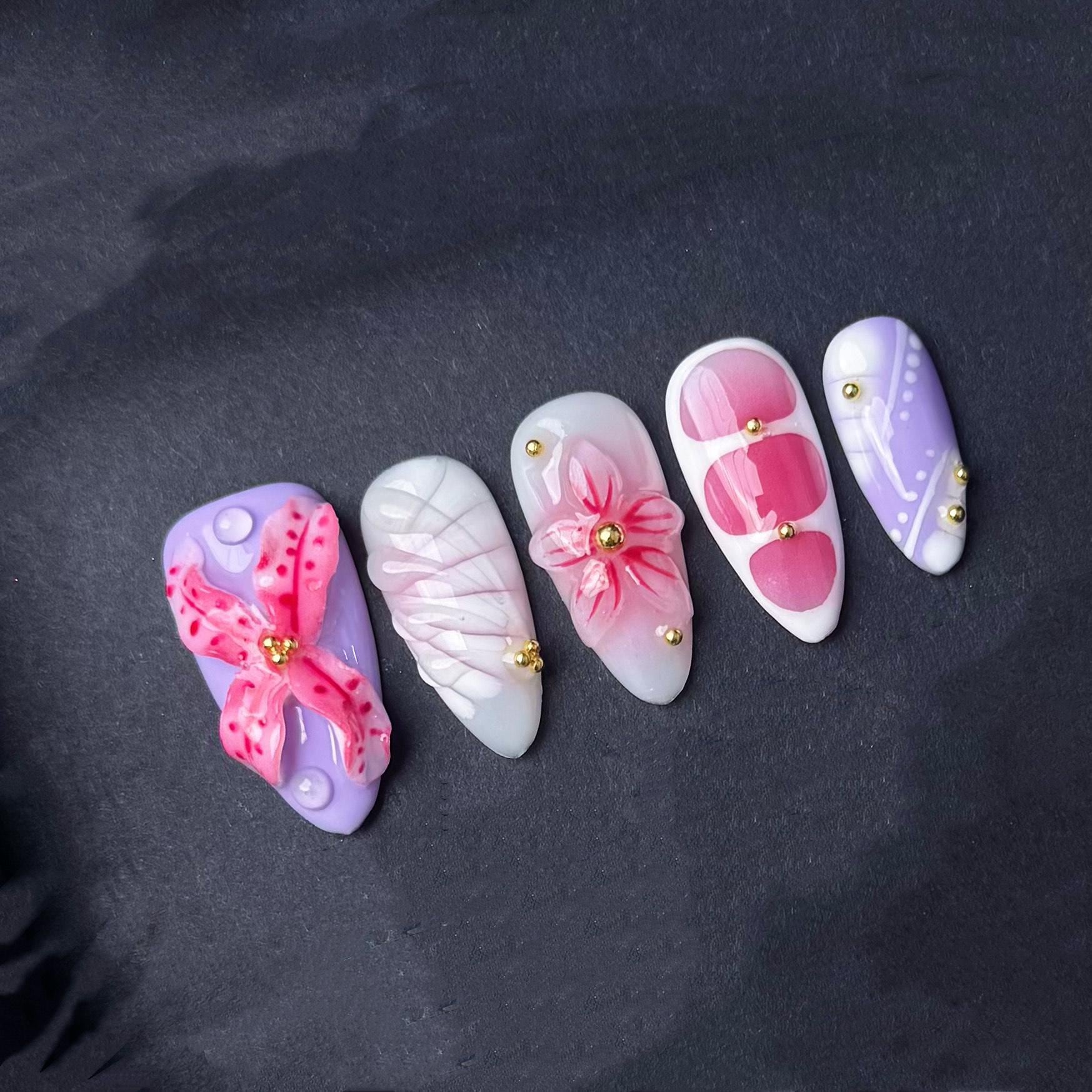 This whimsical press on nail set features 3D floral designs in soft pink and purple tones with gold studs and glossy details for a playful yet elegant look perfect for spring or special events.