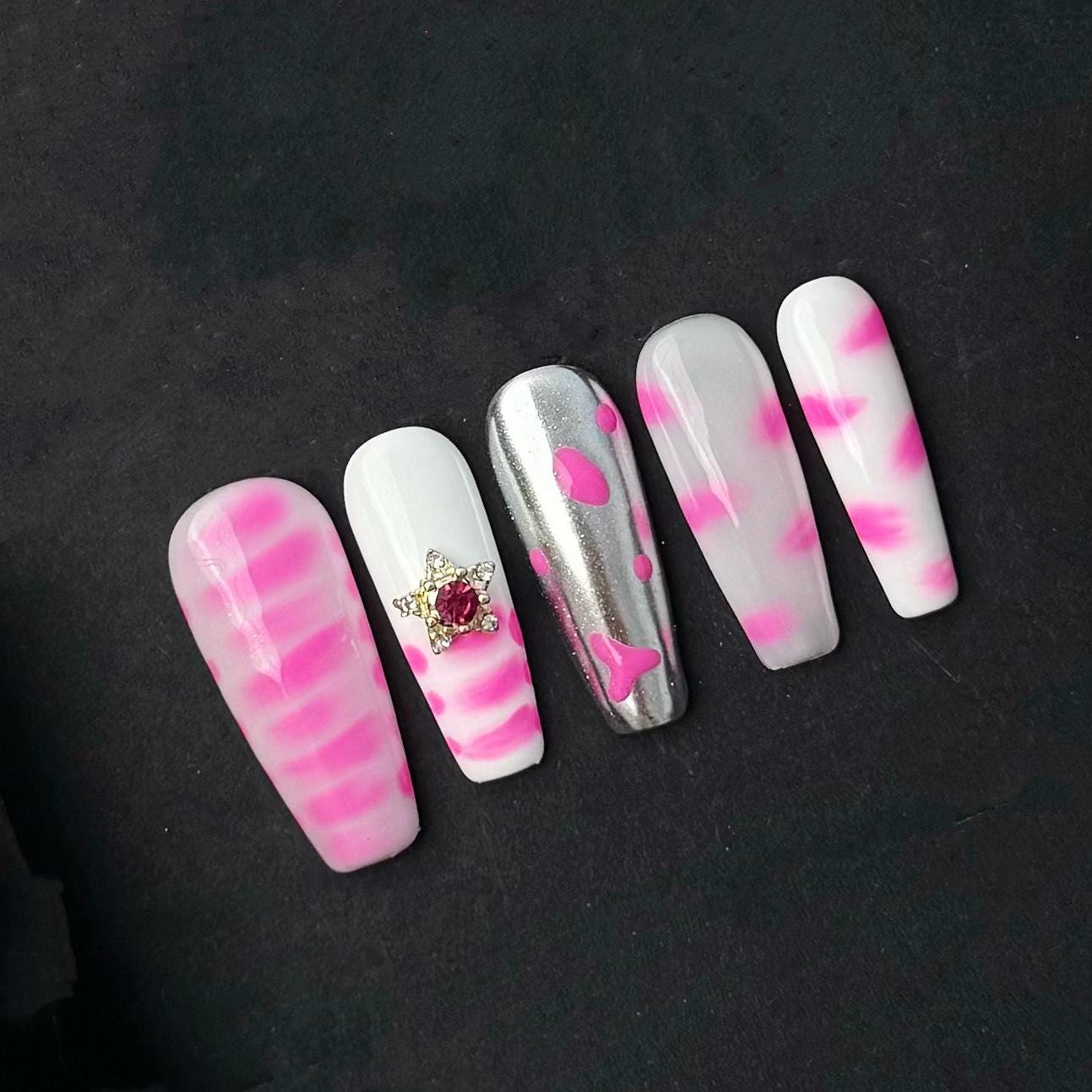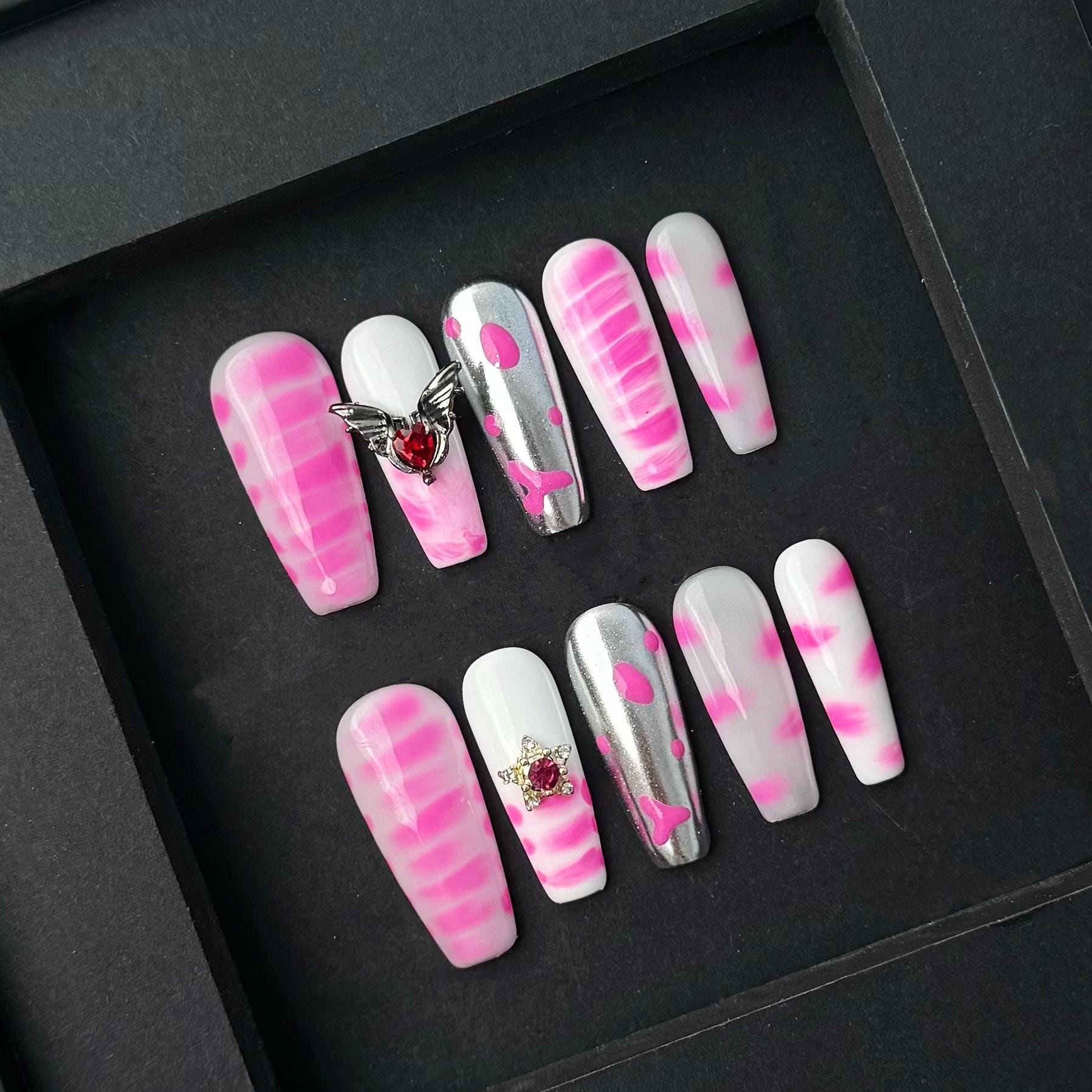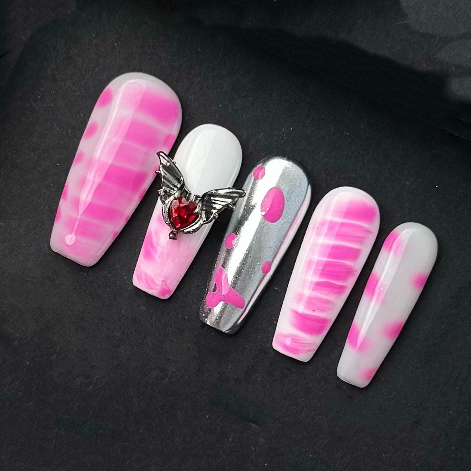 This glam and girly press-on nail set combines dreamy pink airbrush effects with chrome accents and a bold 3D heart charm. Featuring soft gradients, polka dots, and a metallic silver nail with playful pink detailing, this set adds a unique and edgy flair to your look.