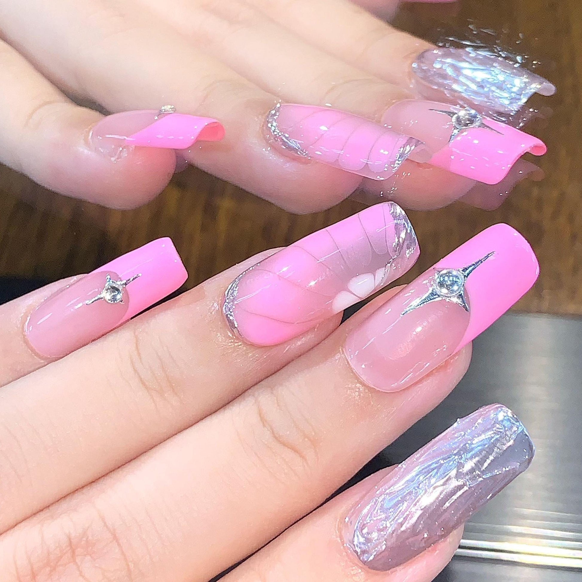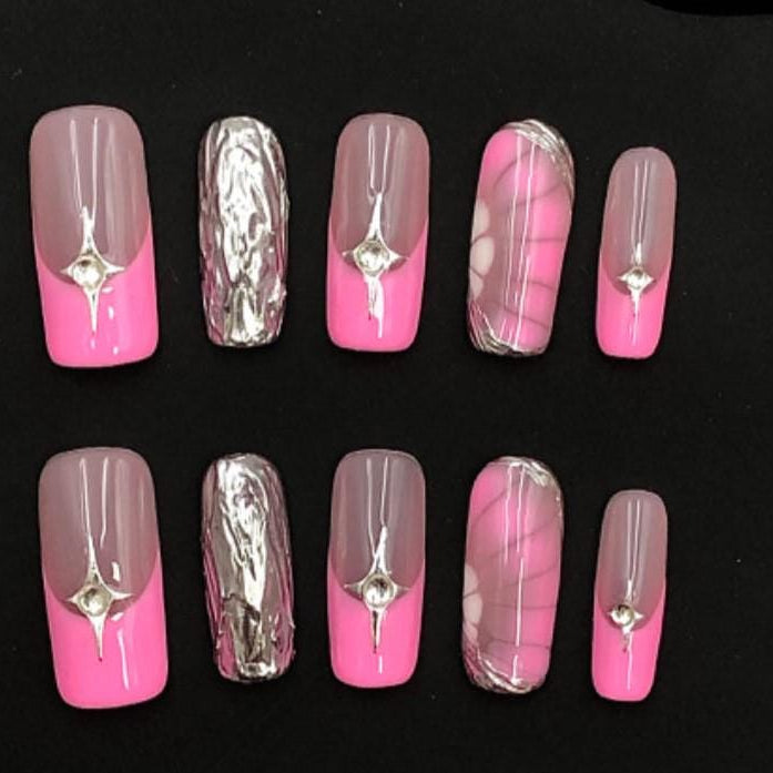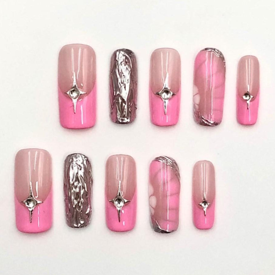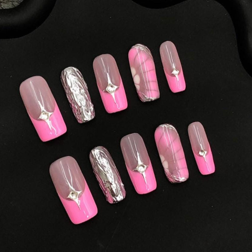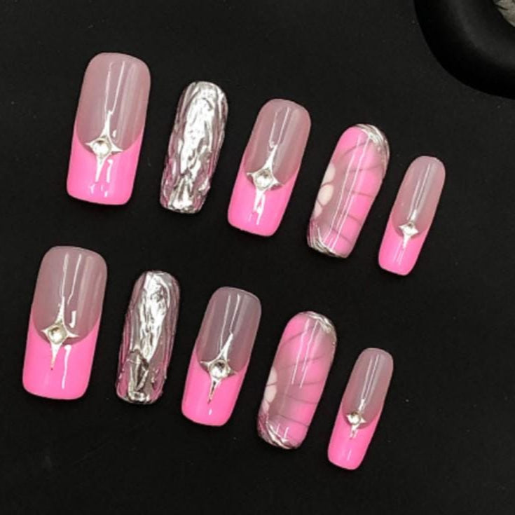 Elevate your manicure game with these chic pink and mauve press-on nails. Featuring a sleek two-tone design, silver chrome accents, marbled patterns, and delicate rhinestone embellishments, this set blends trendy glam with sophisticated shine. Perfect for date nights, parties, or a luxe everyday look.