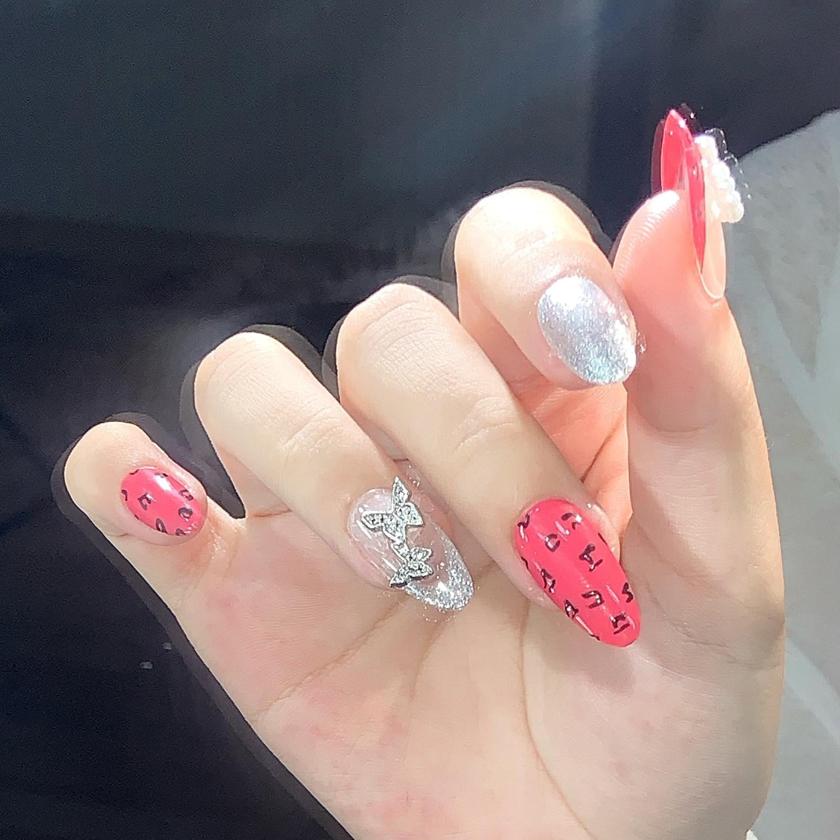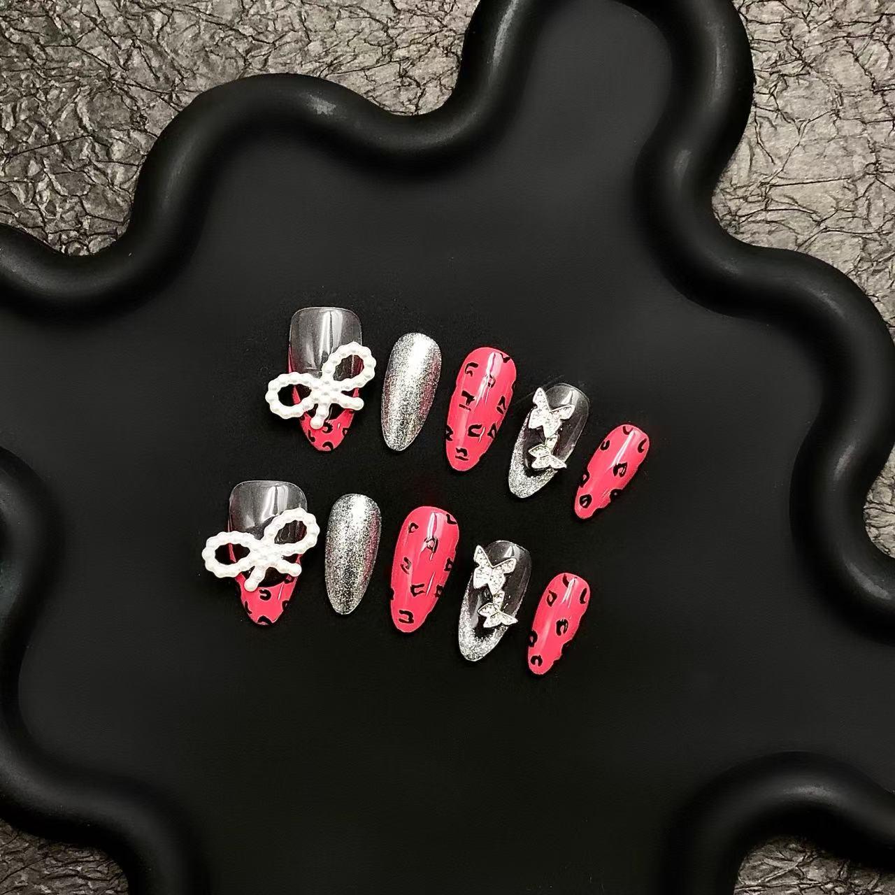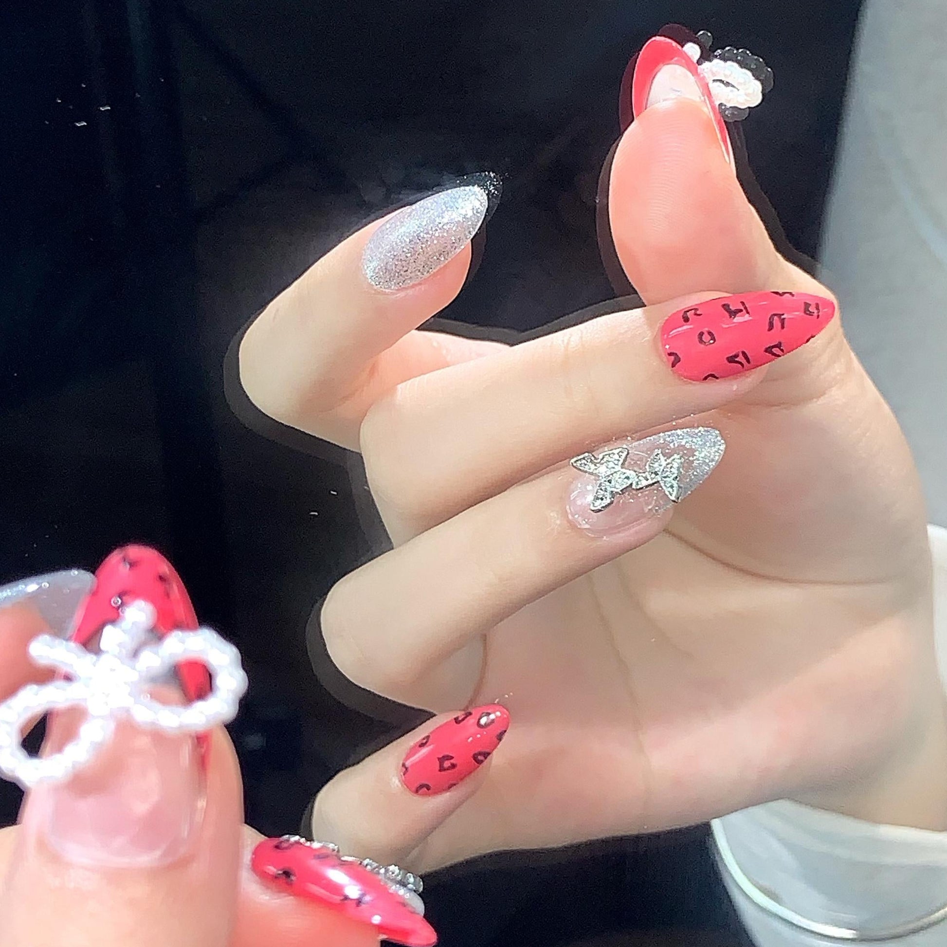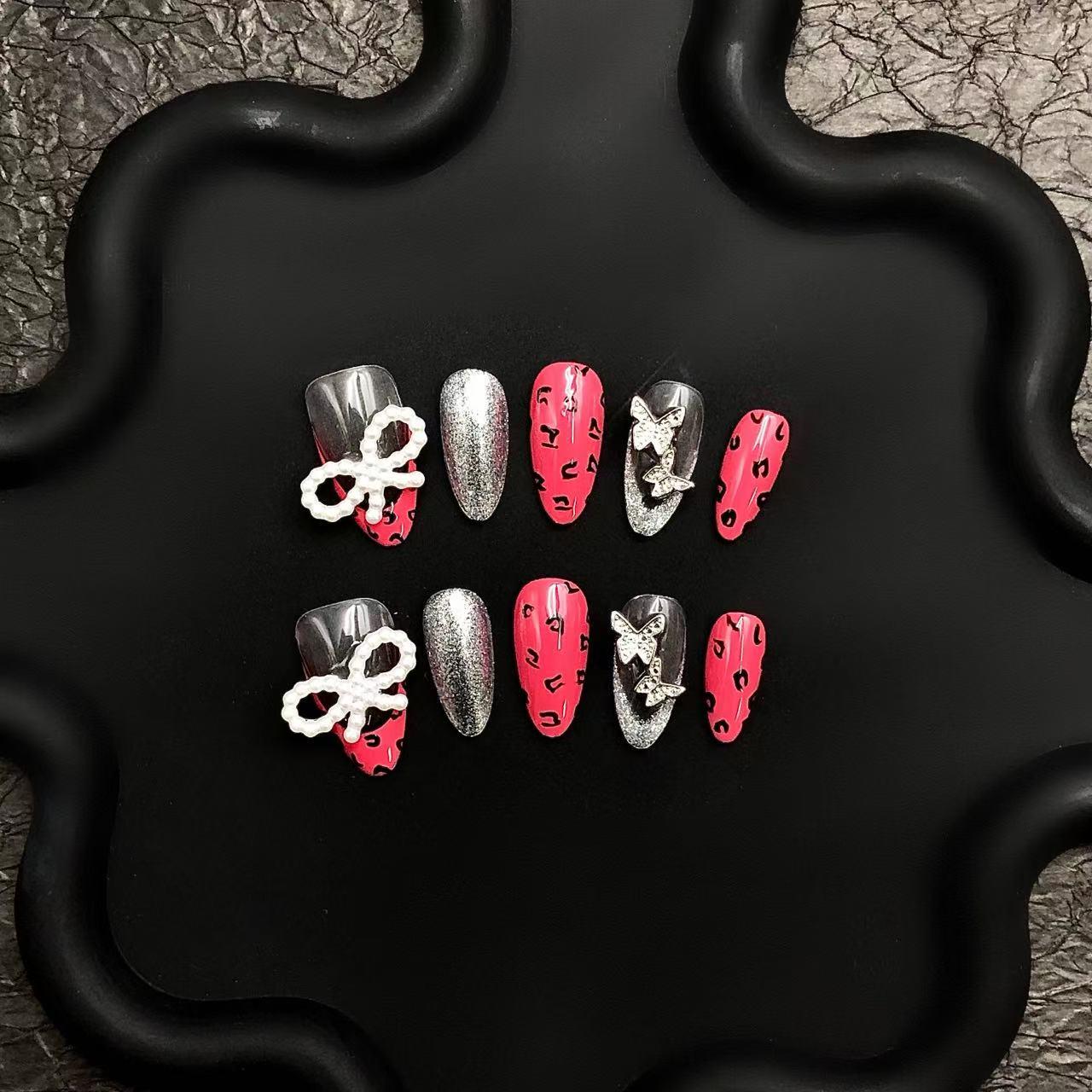 This playful press-on nail set brings together hot pink leopard print, silver chrome shine, and dazzling glitter tips. Featuring bold patterns and topped with 3D pearl bows and butterfly charms, these nails blend wild vibes with sweet details—perfect for fashion-forward looks and statement moments.