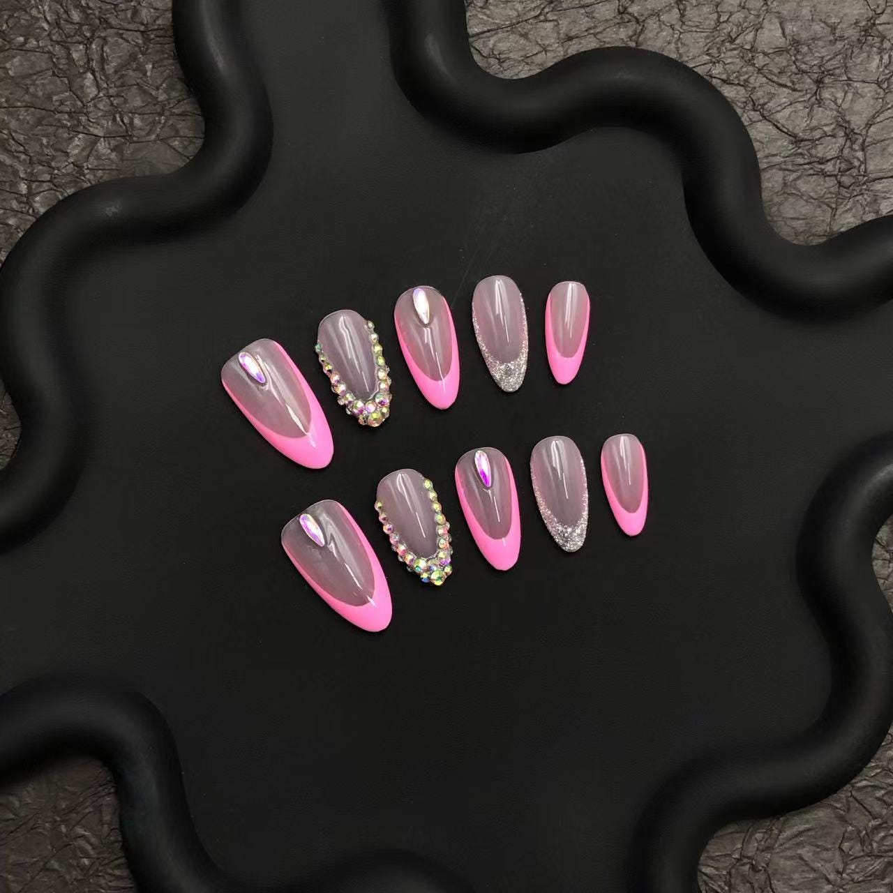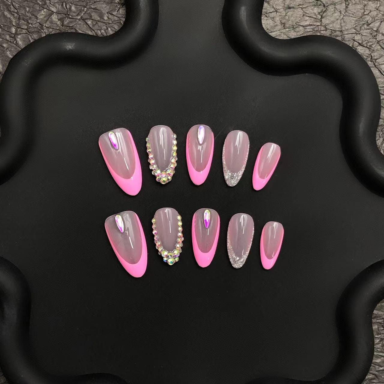 A stylish set of almond-shaped press-on nails featuring a nude base with vibrant pink French tips. The design includes glittery silver accents and decorative rhinestones for added glam. Some nails are adorned with iridescent gems and a chain of rhinestones, creating an eye-catching, luxurious look. Perfect for a bold and fashionable manicure.