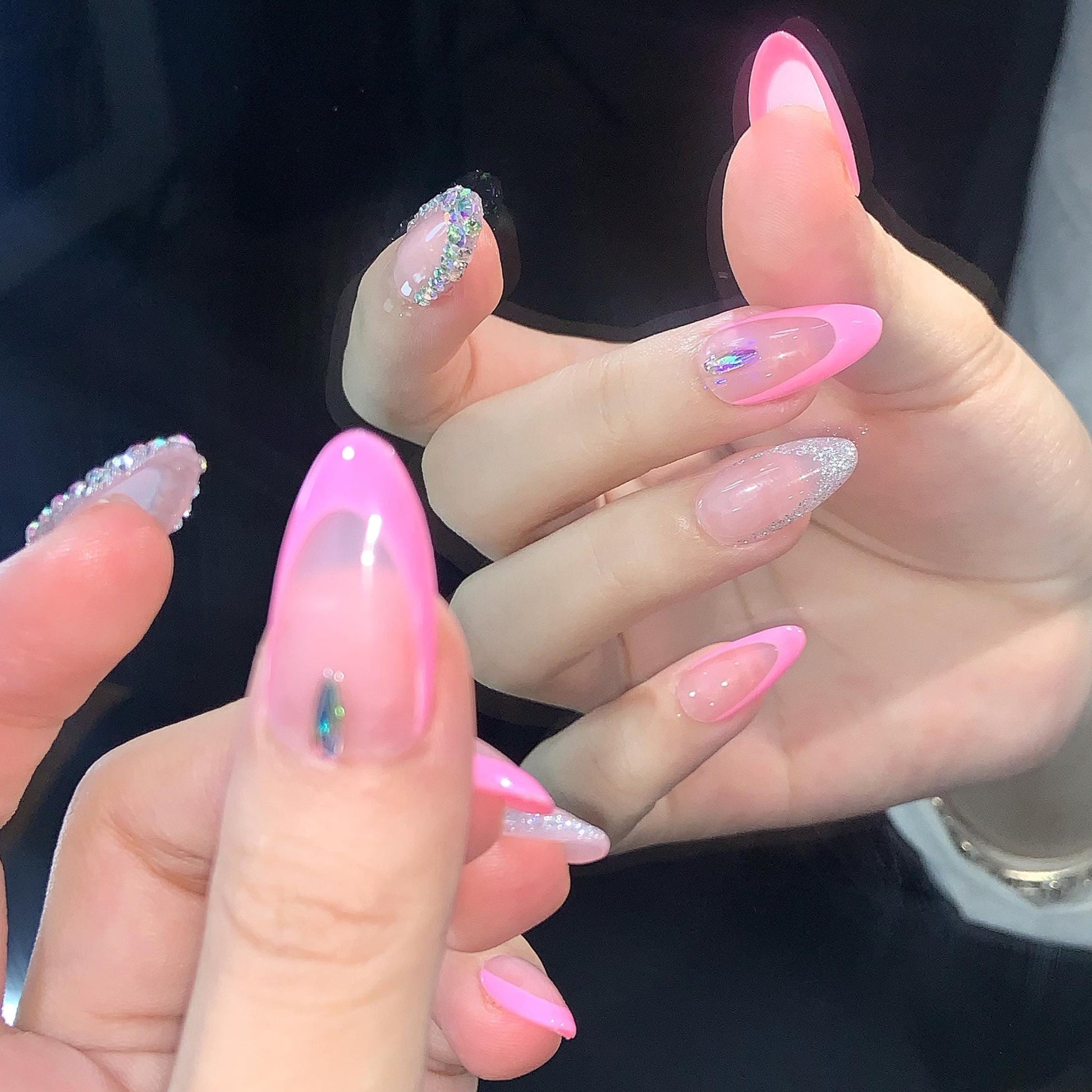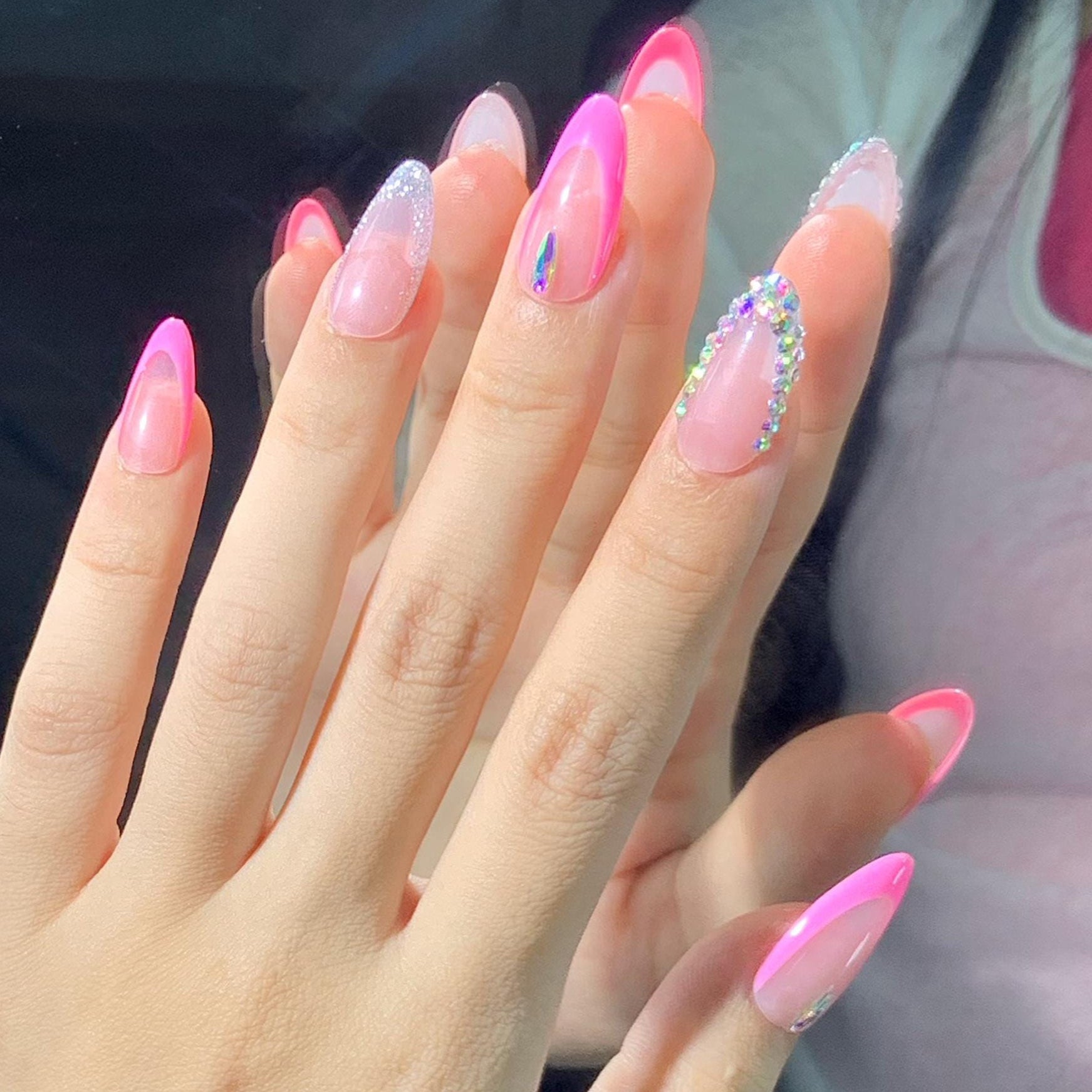 Pink French tip nails rhinestone art almond-shape press-on nude pink glitter accent glam trendy sparkly decorative fake manicure design.
