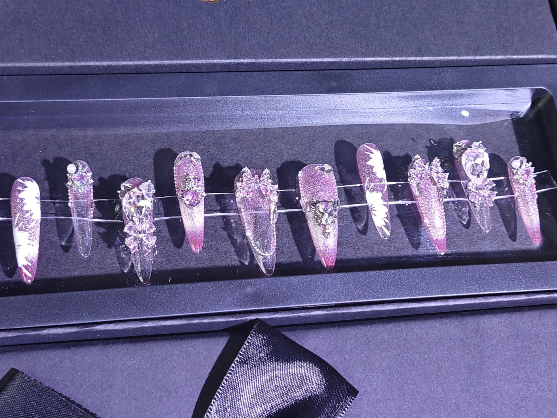 Add a touch of enchantment with these pink glitter ombre press-on nails, featuring delicate 3D crystals, pearls, and hand-detailed floral accents. Perfect for weddings, proms, or anytime you want to feel effortlessly magical.