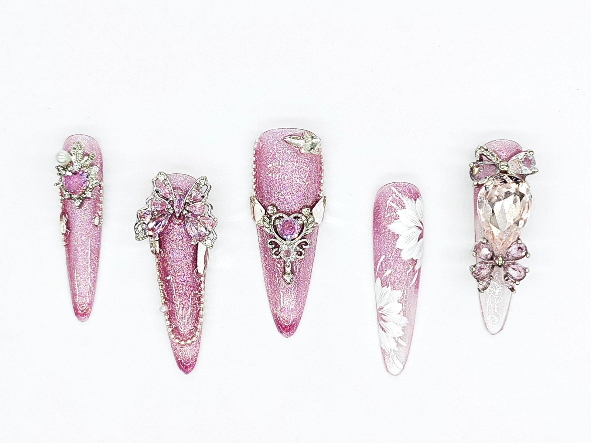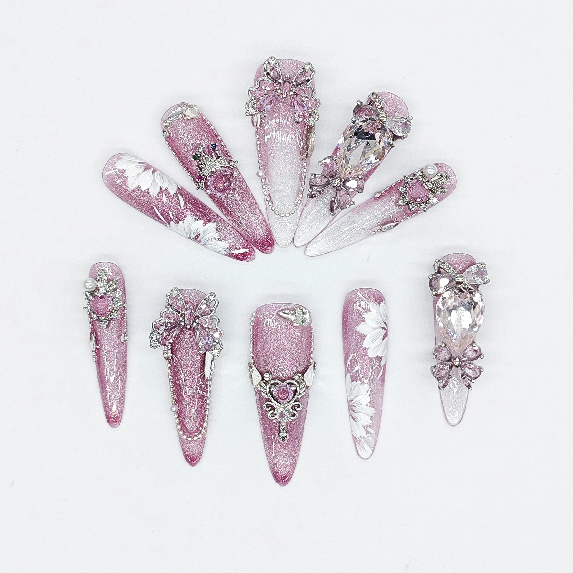 Pink Glitter Ombre Press-On Hand Painted Nails – 3D Crystals, Pearls & Floral Accents – Long Luxe Nails for Bridal, Prom and Fairycore Looks