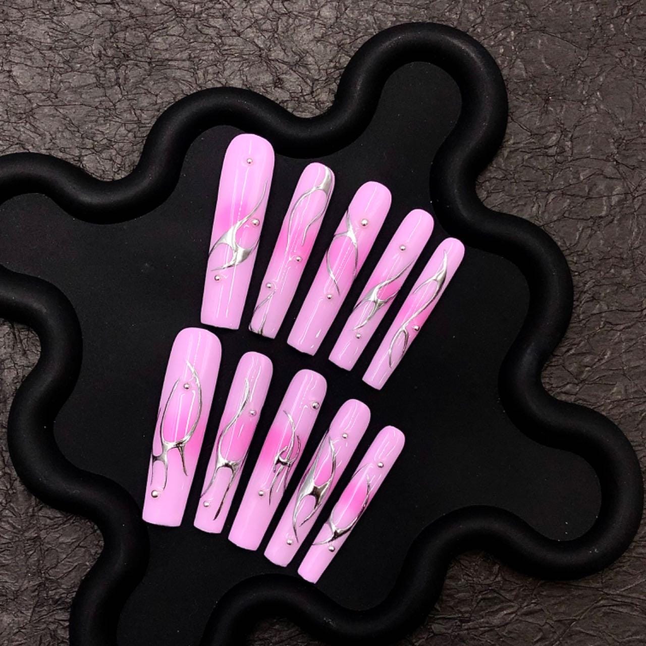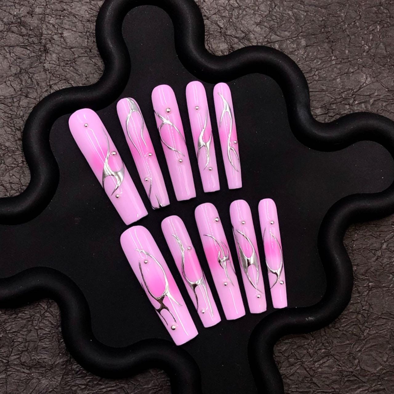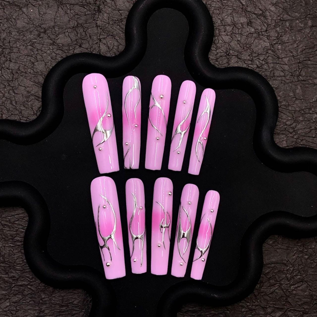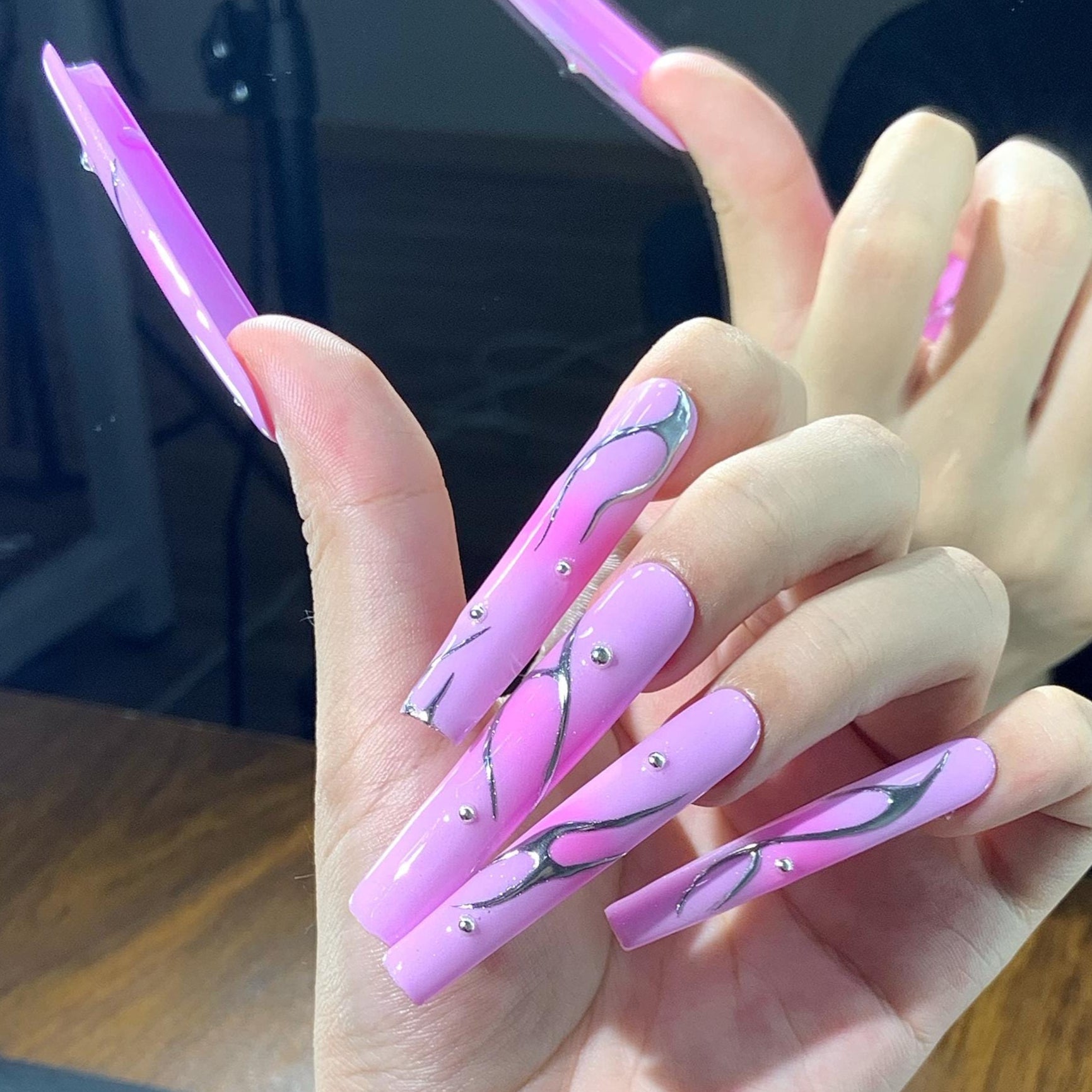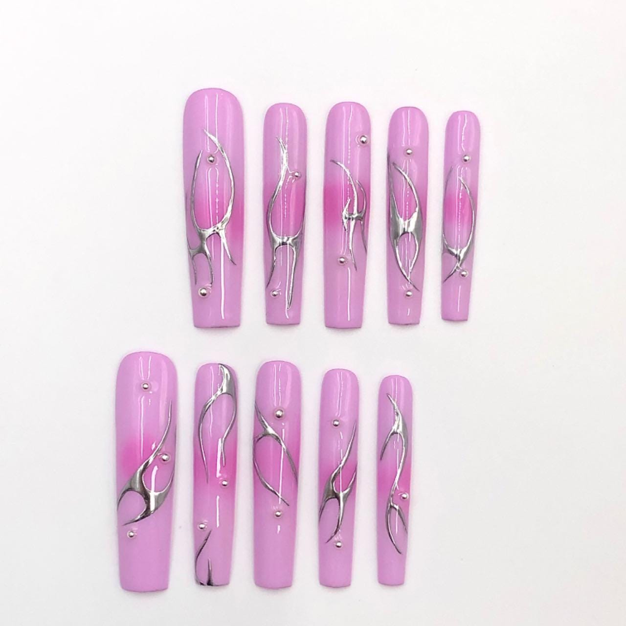 Long, coffin-shaped press-on nails with a glossy pink base. Each nail is adorned with sleek, abstract chrome silver swirls and small metallic studs, creating a modern and elegant aesthetic. The design is minimal yet eye-catching, combining soft feminine tones with bold metallic elements for a trendy and fashionable look. Ideal for stylish occasions or everyday chic.