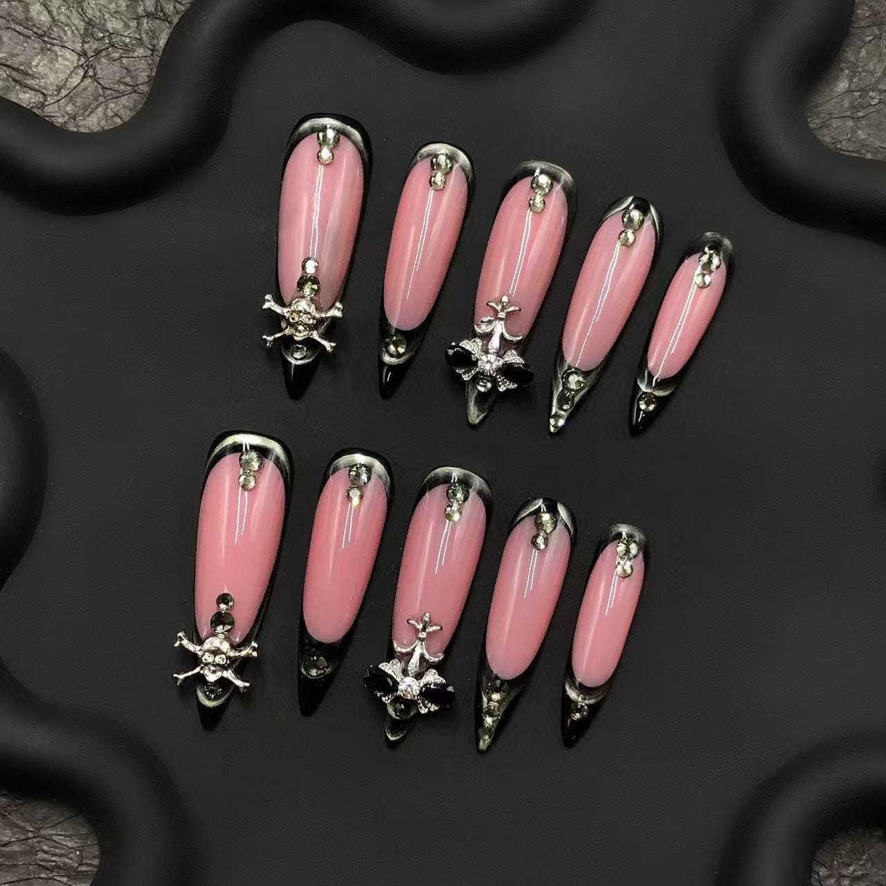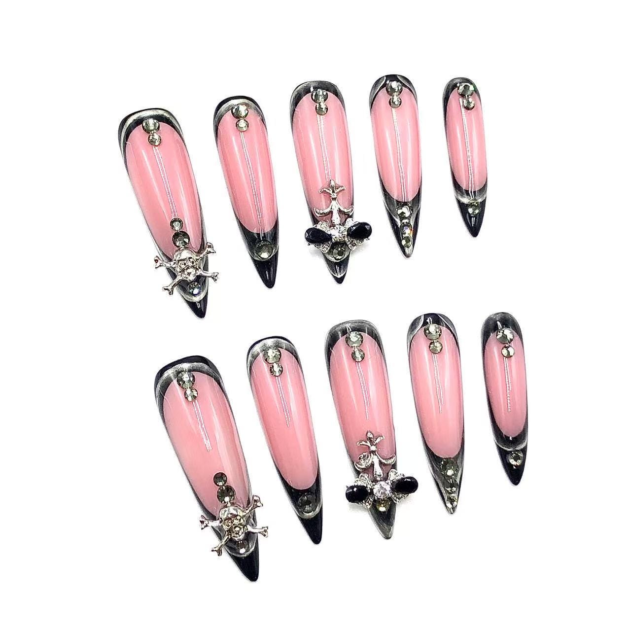 A striking set of pink stiletto nails with black French tips, adorned with gothic-inspired metallic embellishments. The design features silver skulls, crosses, and rhinestones, adding an edgy and luxurious touch. The combination of soft pink with dark accents creates a bold contrast, perfect for those who love a punk-glam aesthetic.