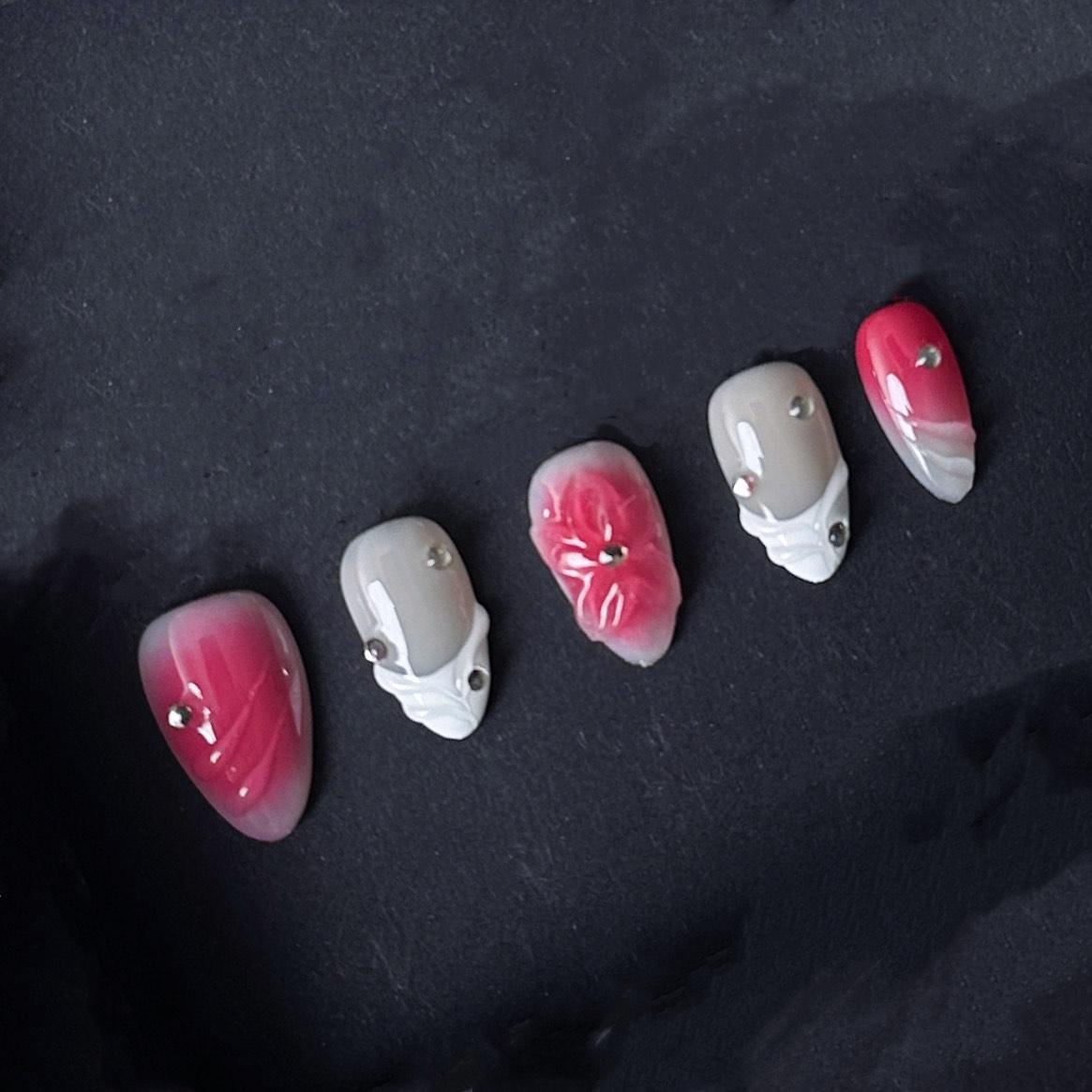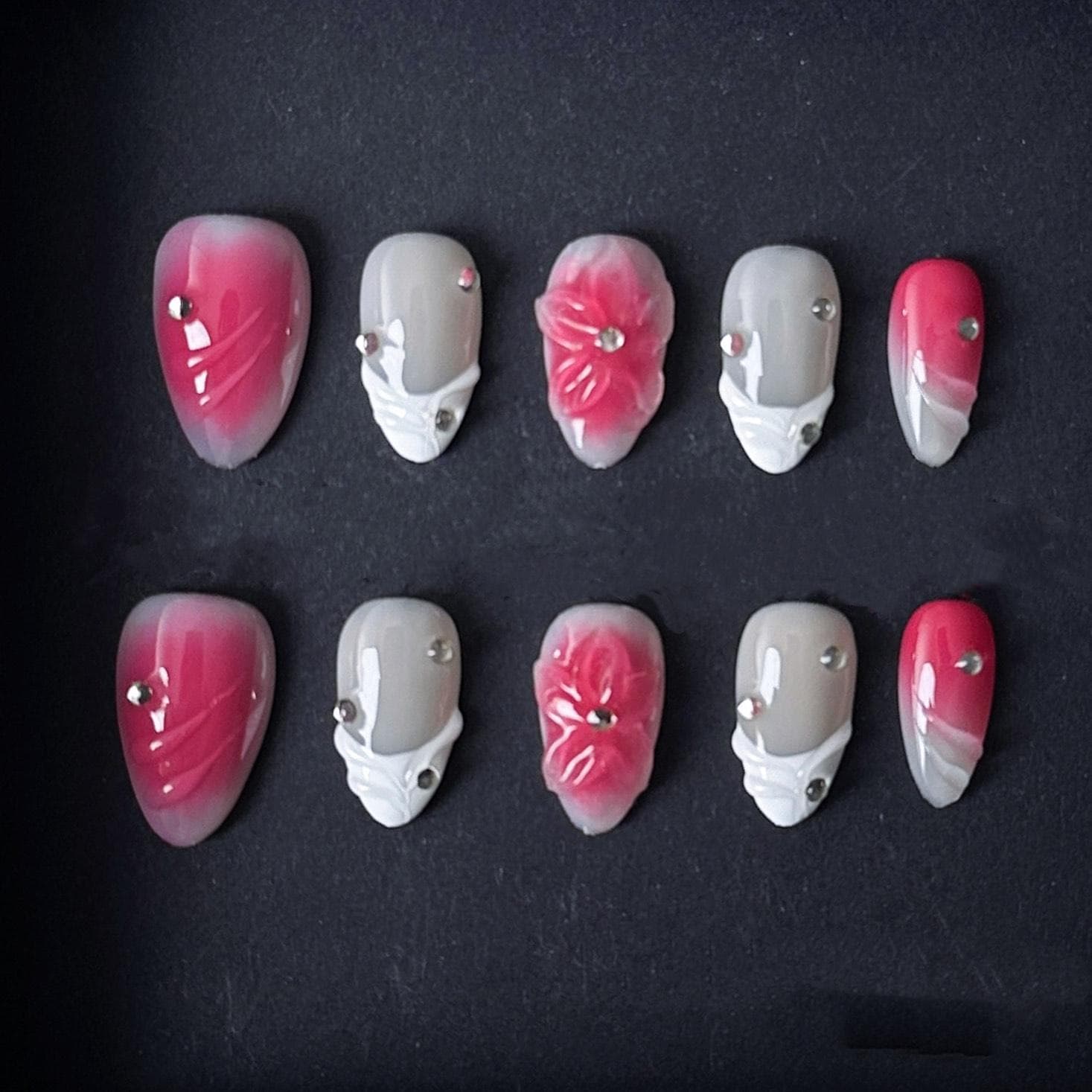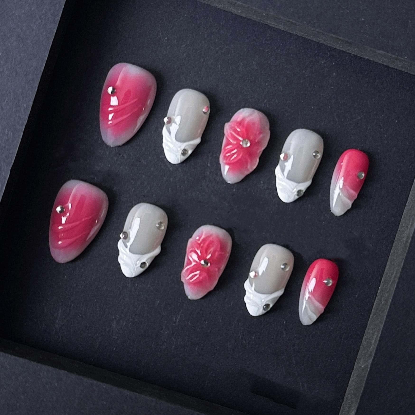 This soft glam press on nail set features a dreamy blend of pink ombre and taupe gray tones accented with crystal embellishments and sculpted 3d floral art. The center nail showcases a bold raised flower design while surrounding nails are enhanced with smooth white swirls and glossy finishes. The combination of romantic color and subtle texture makes this set ideal for everyday elegance weddings or feminine statement style. Reusable and handcrafted with salon quality gel.