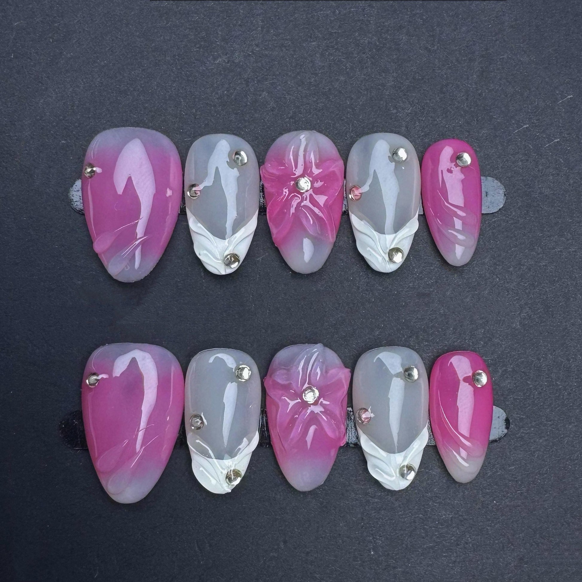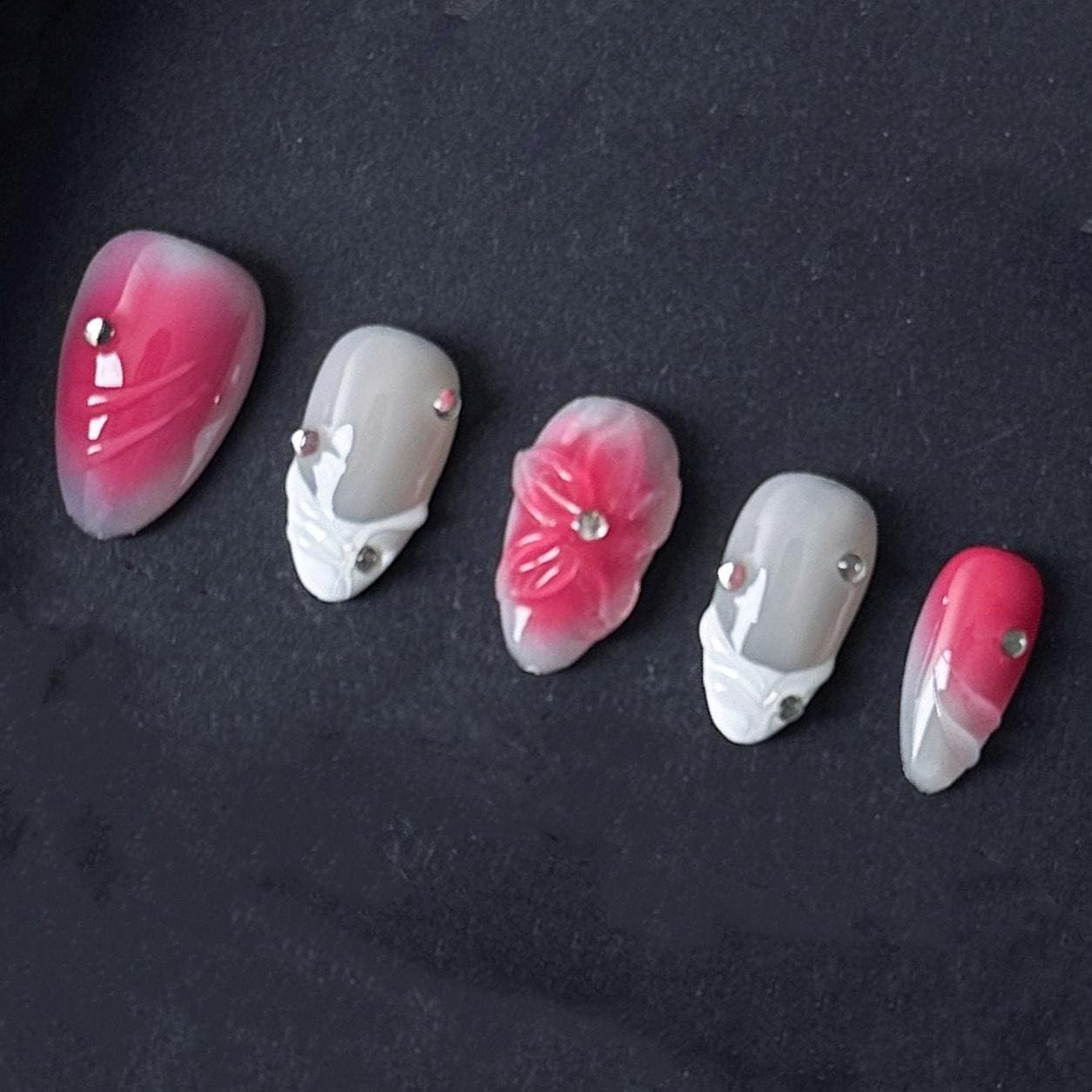 Pink Ombre and Gray Press On Nails with 3D Floral Accent and Crystal Details artificial reusable fake glue on faux manicure nails trendy art