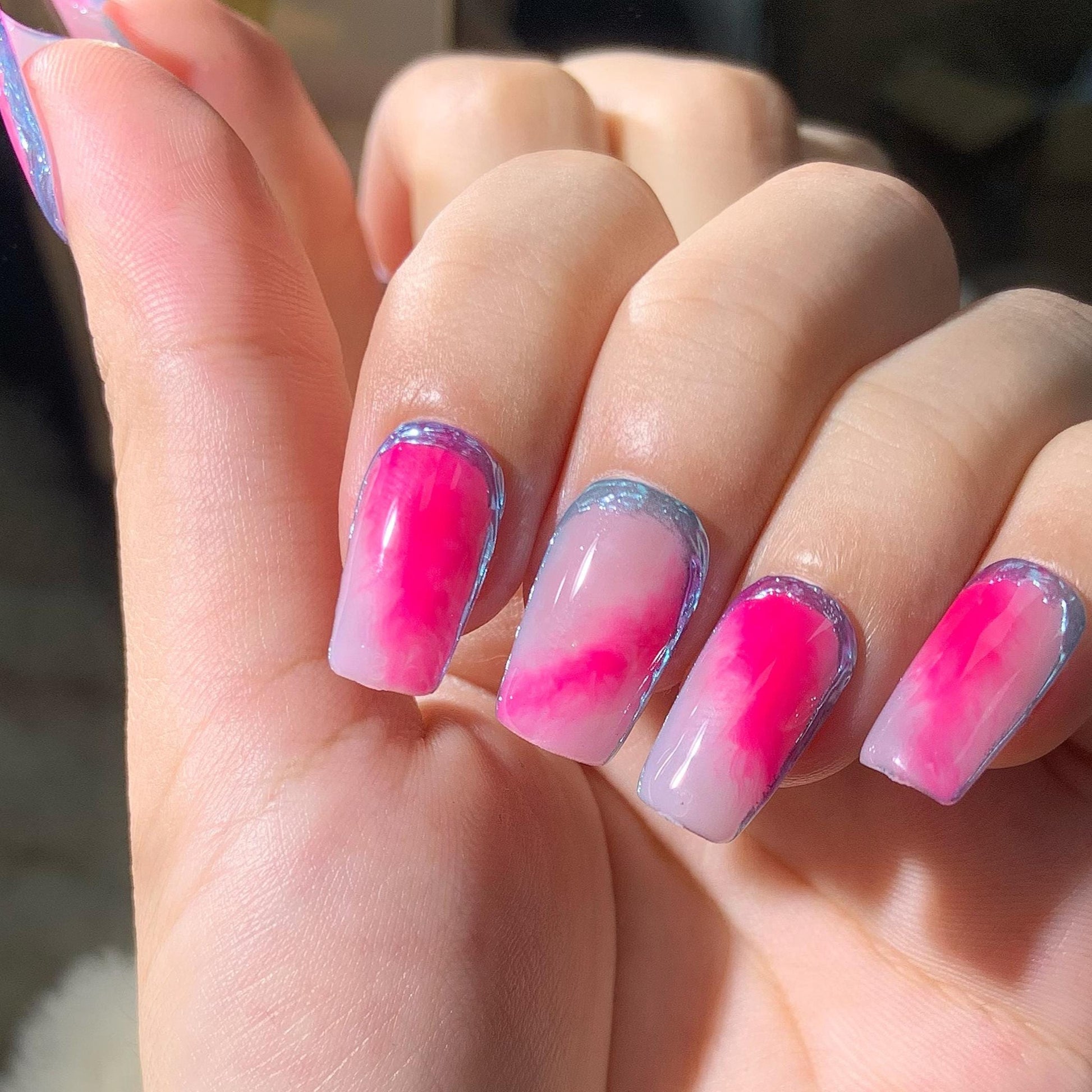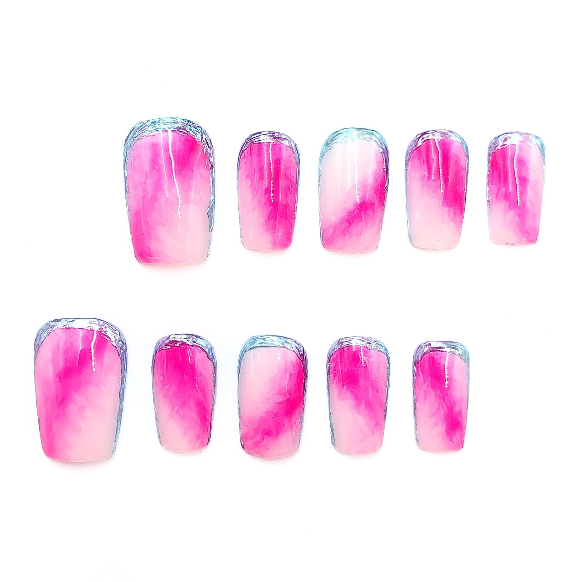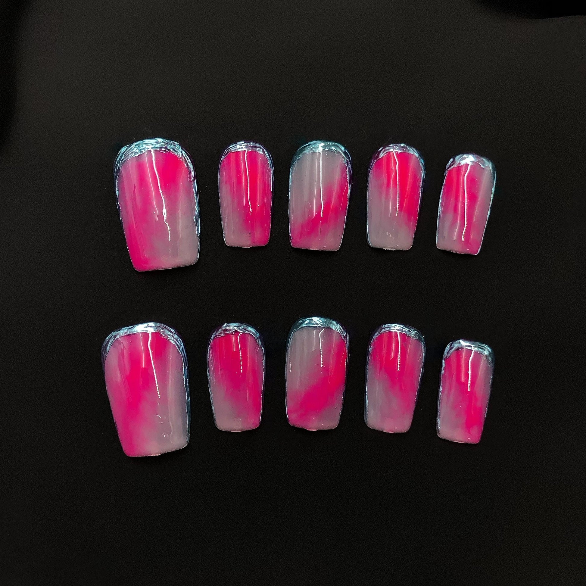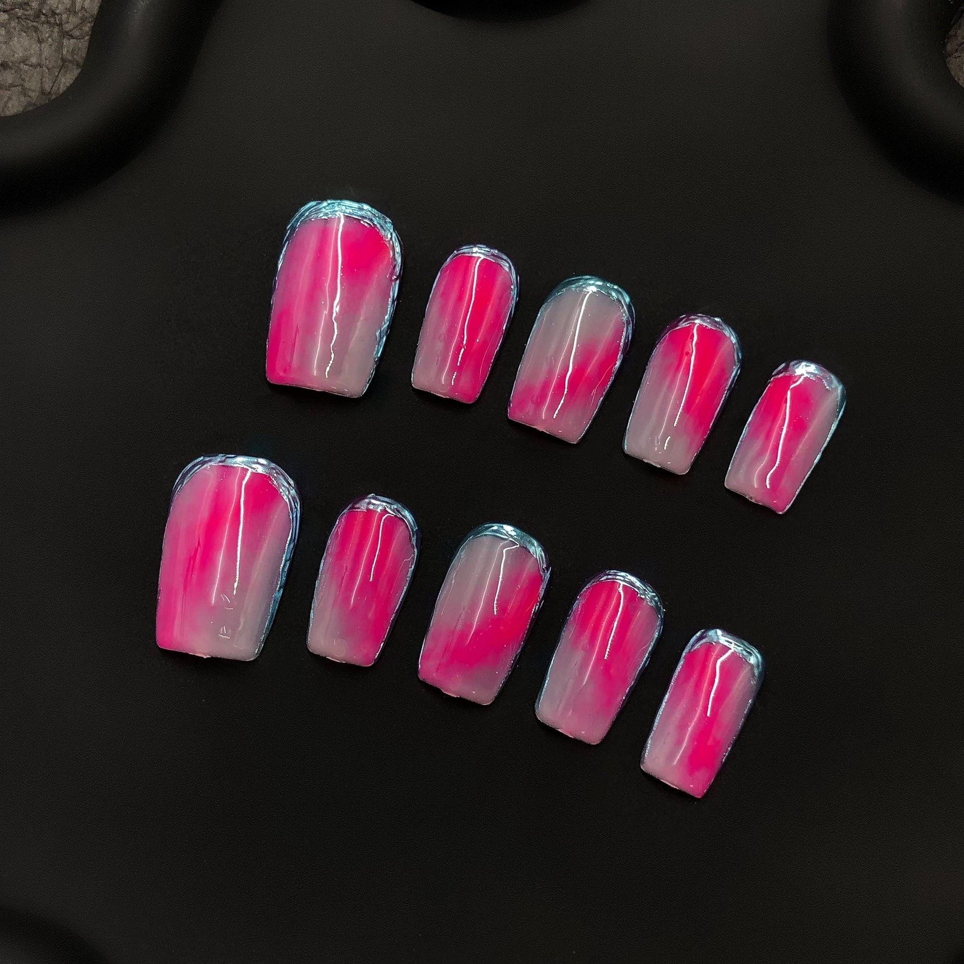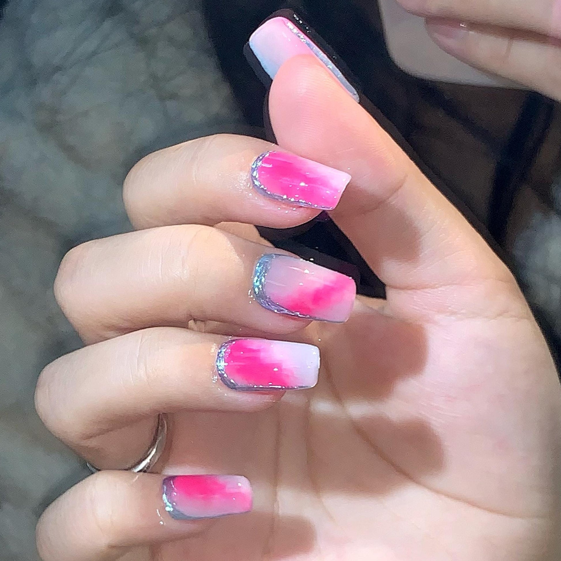 These stylish short square press-on nails feature a beautiful pink ombre design with a sleek silver outline. Hand-painted for a flawless finish, they offer a chic, girly look that's both trendy and elegant. Perfect for effortless glamour!