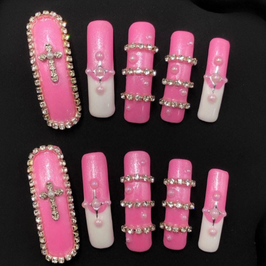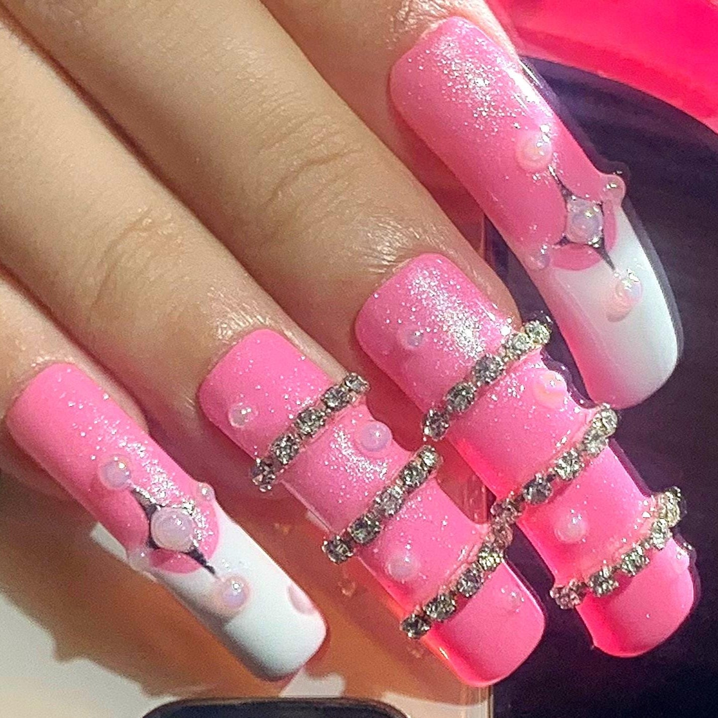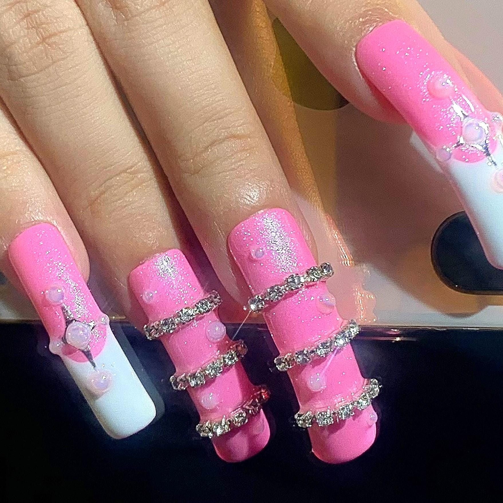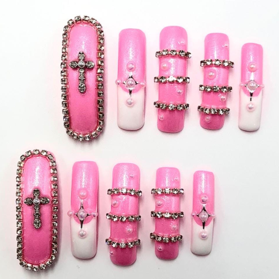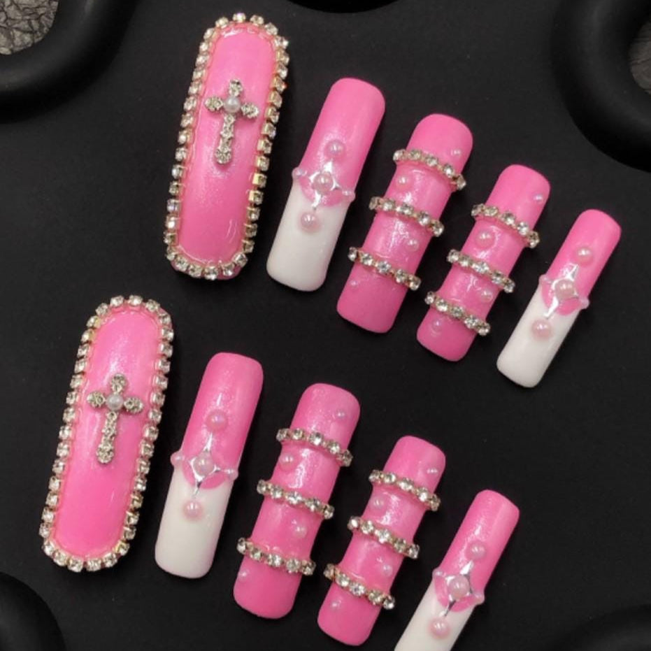 Turn heads with this dazzling pink press-on nail set featuring a shimmering gradient base, 3D pearls, crystal-studded crosses, and rows of rhinestone chains. A touch of white on select nails adds contrast and elegance, making this set perfect for glam occasions, bridal events, or anyone who loves a mix of sweet and edgy.