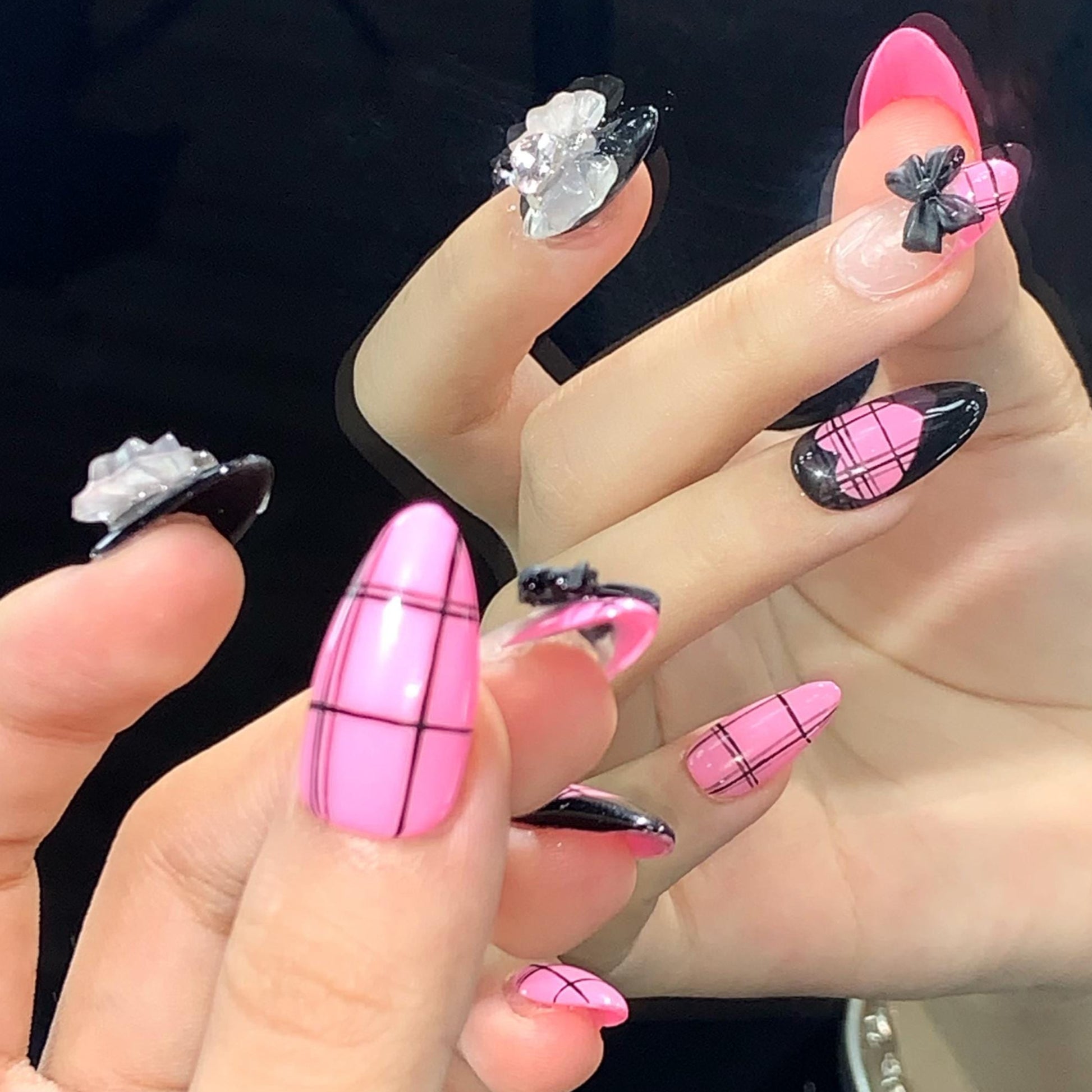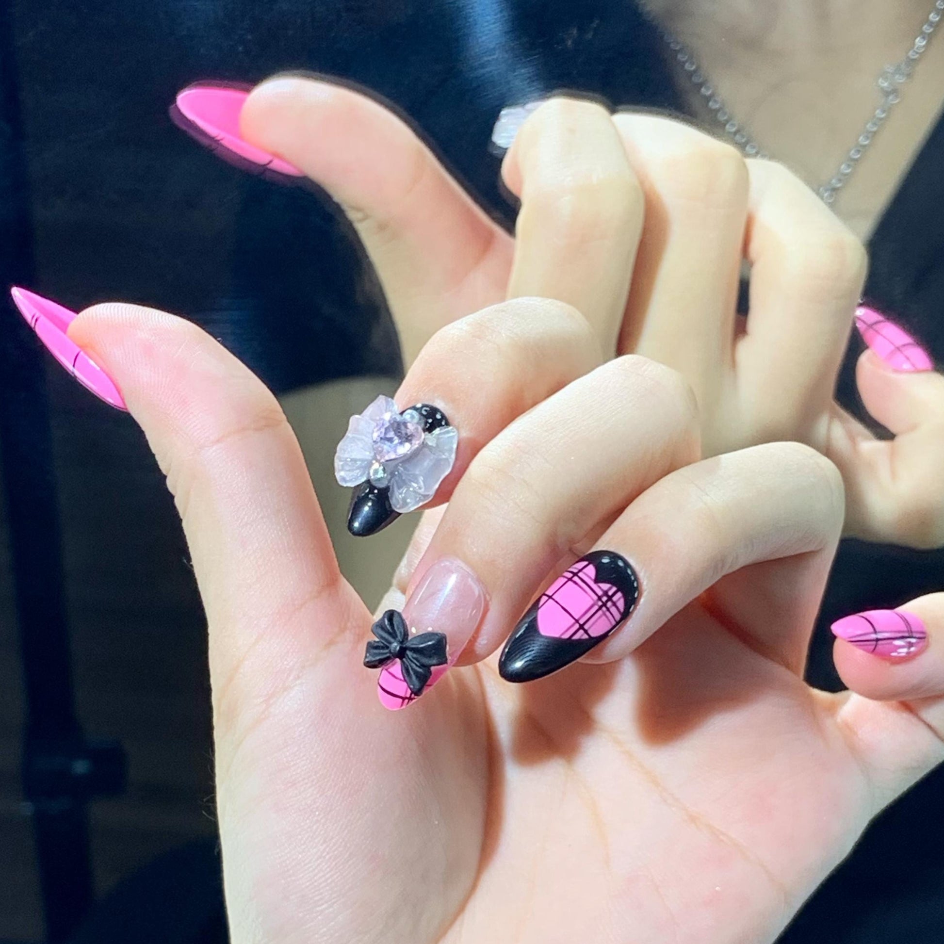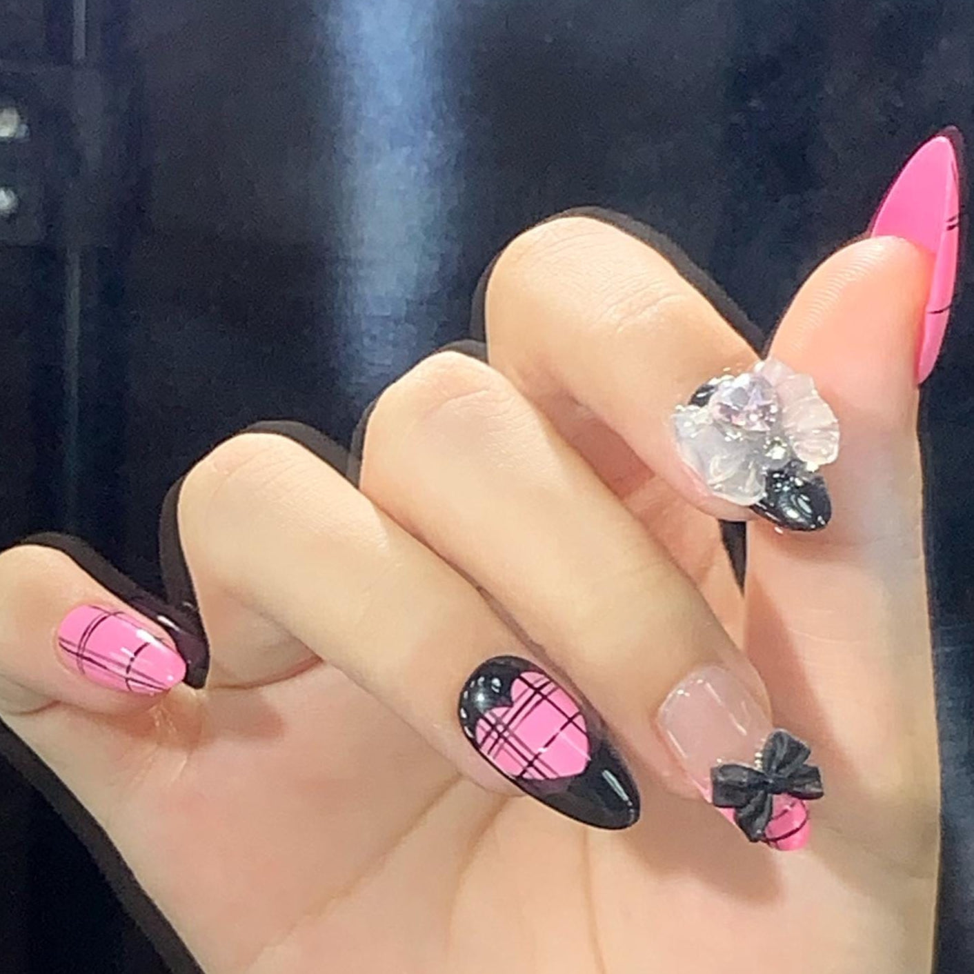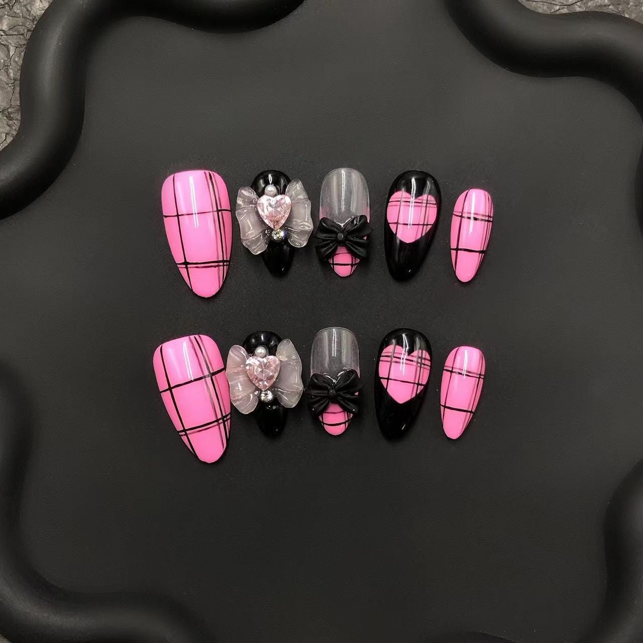 Pink plaid nails press on glue Kawaii Heart gem Black and pink Bow art cute 3D Harajuku style glam long oval girly cute manicure faux artsy