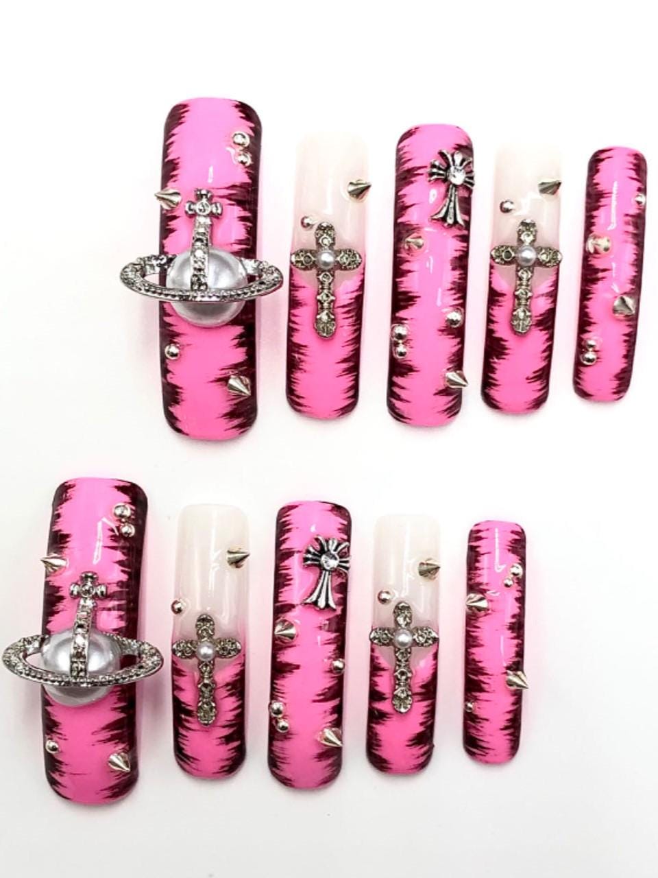 Bold meets rebellious in this hot pink flame-inspired nail set featuring edgy chrome cross charms, spiked studs, and signature planet embellishments. These punk glam press-on nails combine vivid pink with deep black flame detailing, finished with a glossy top coat for maximum shine. Perfect for those who live loud and love standout designs with attitude.