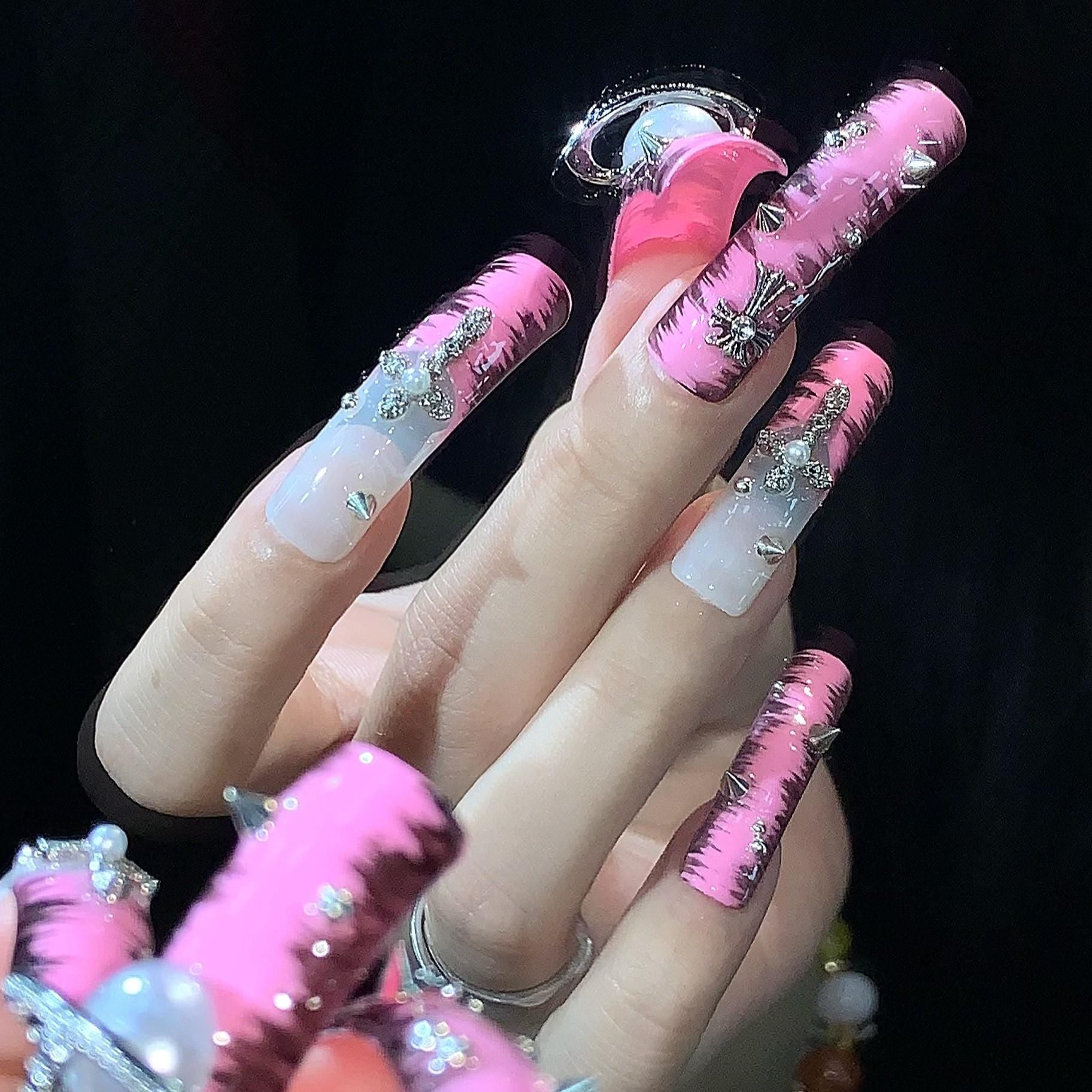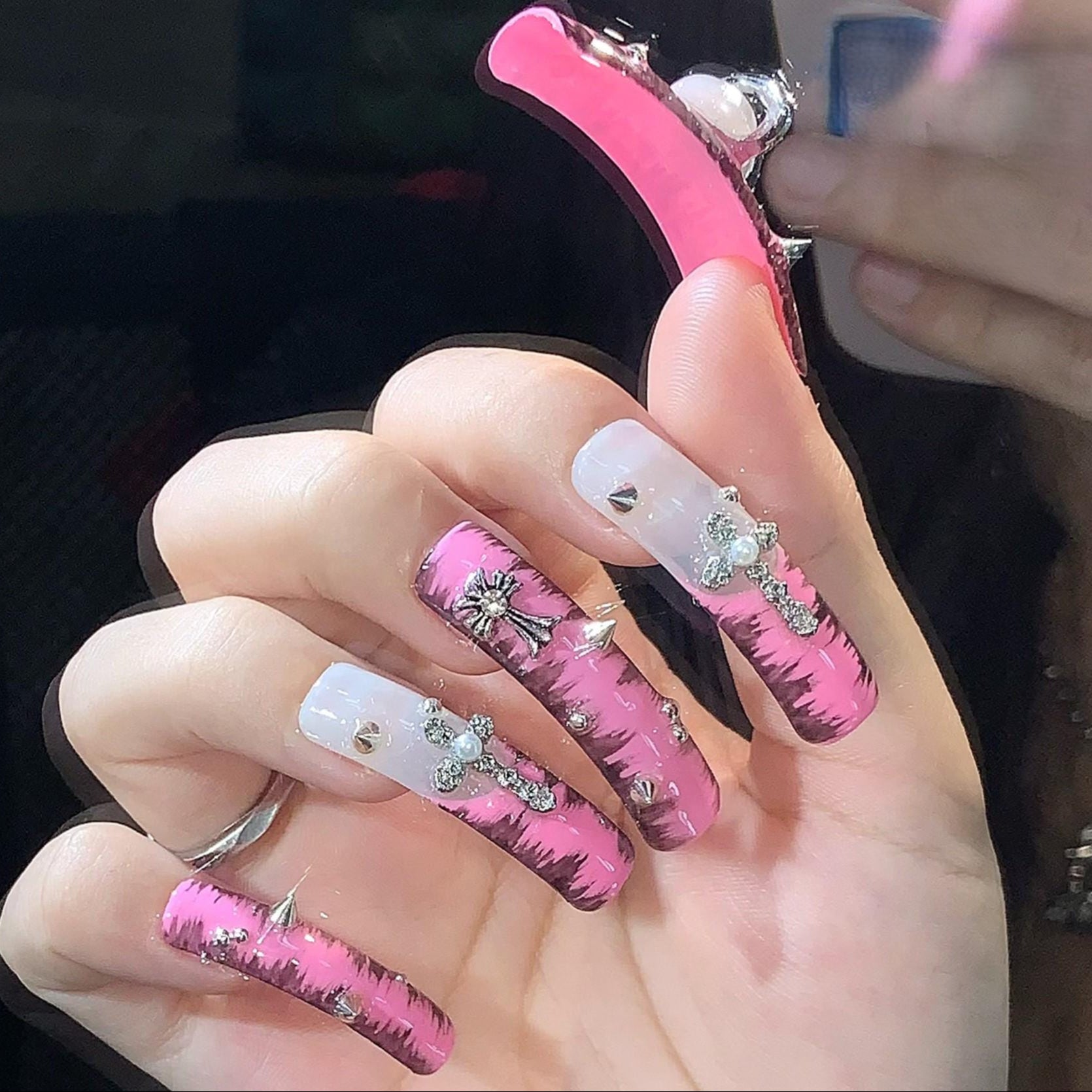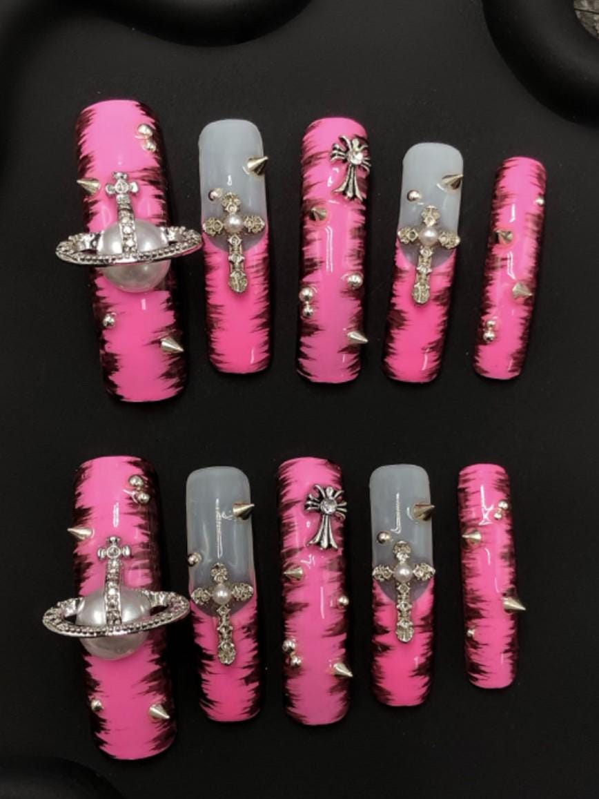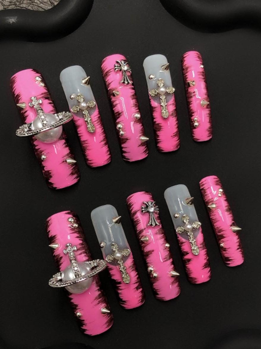 Pink Punk Galaxy Press-On Nails – Planet, Cross & Stud Charms Artificial reusable fake glue on faux manicure nails trendy art