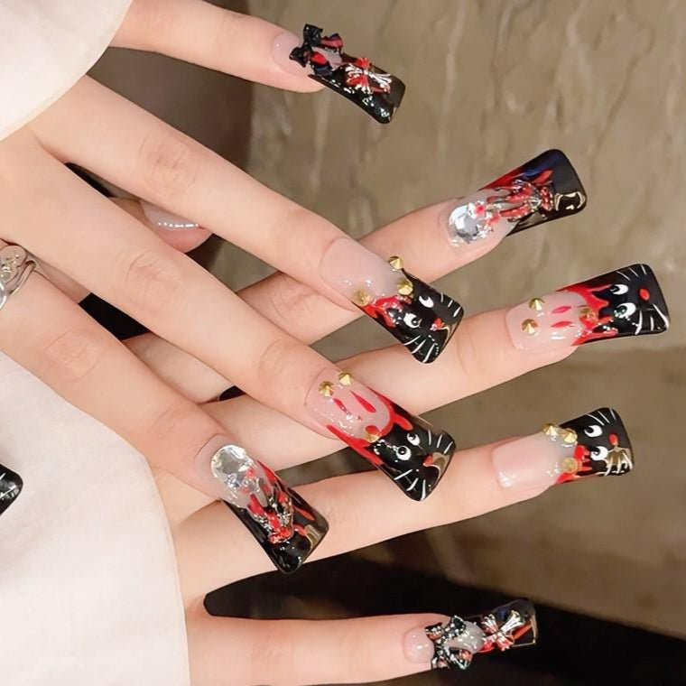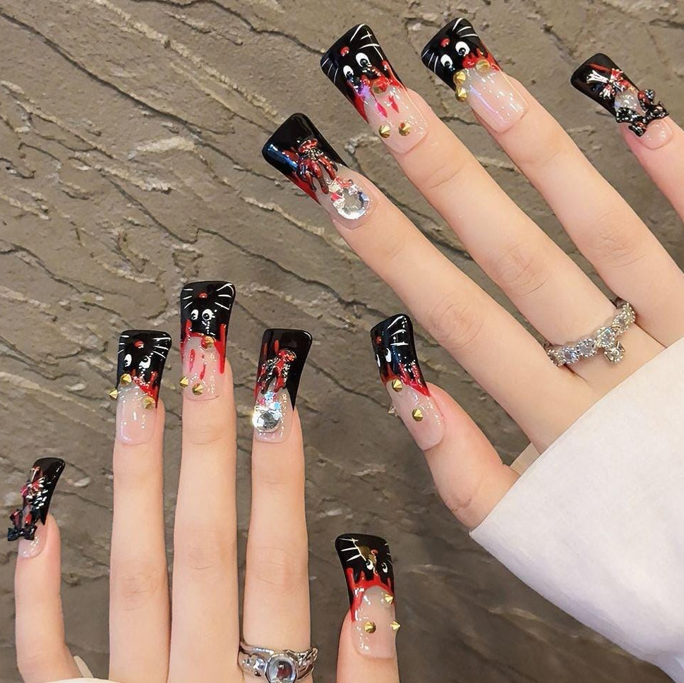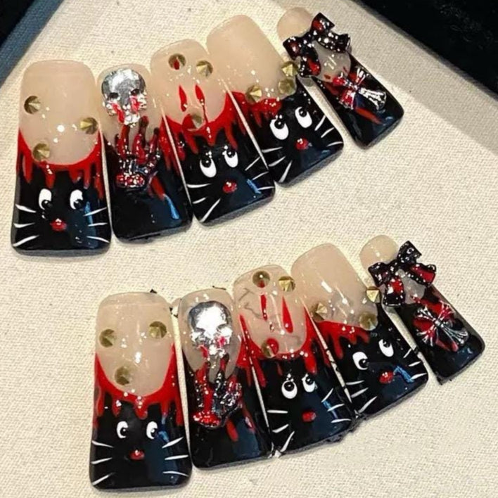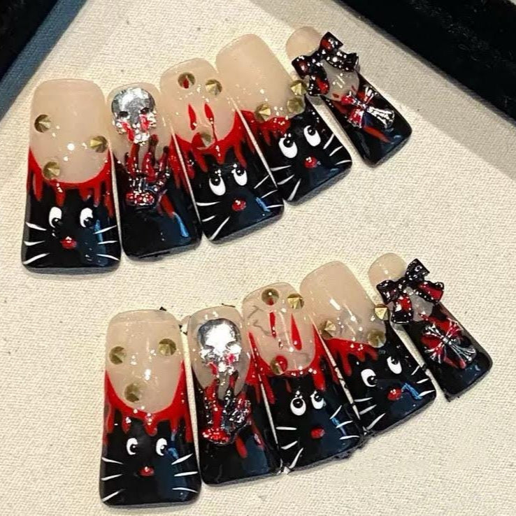 press on nails glue on black cat red drip halloween kawaii cat spooky cute 3d bow cartoon goth creepy quirky horror cute nails artificial